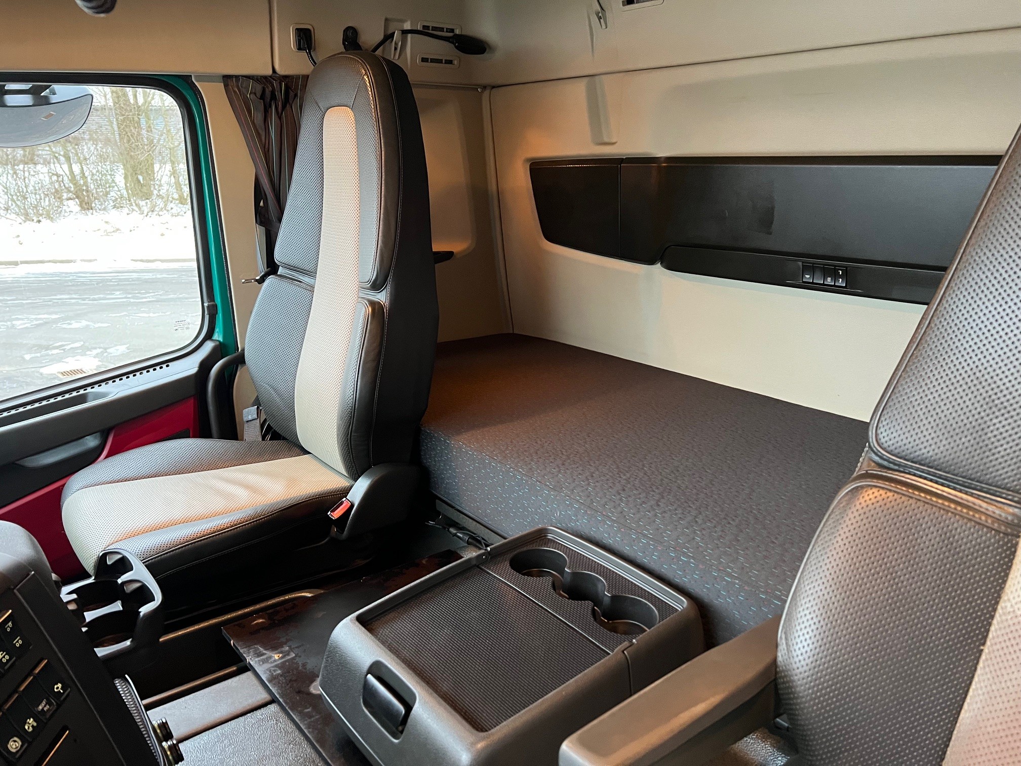 1-ejers vogn fra ny - kørt på servicekontrakt - 8X4 Tandemtræk med løftbogie, med 3-vejs HMF tippelad med fuld pendel i v. side, aut. bagsmæk, luftstyret VBG kærretræk med olie ført ud, skabe og skørter, fuld luftaffjedret, I-shift, VEB+, Work Remote, Klima, oliefyr, Loadindikator, luksus lædersæder, kamera m.v.