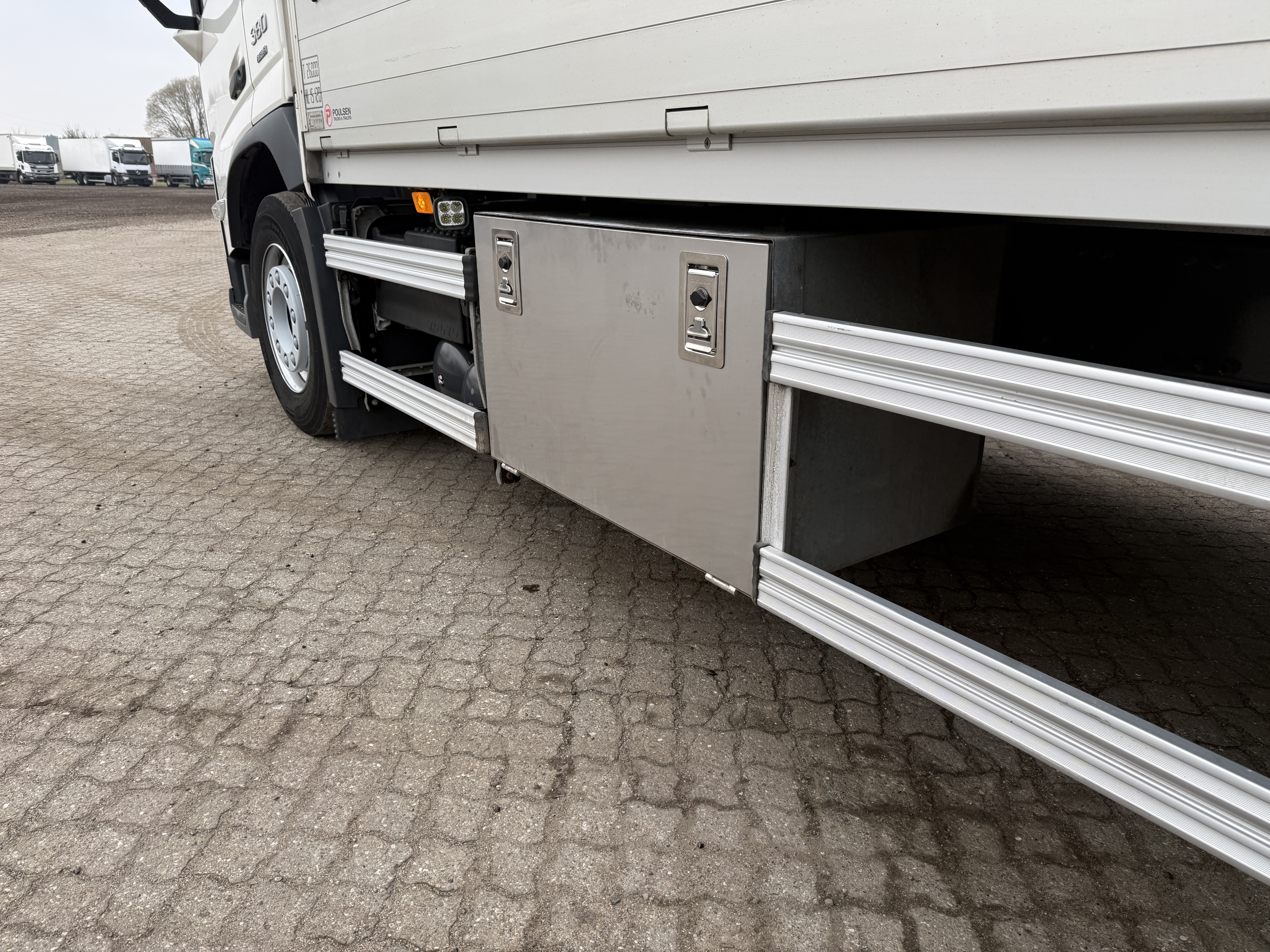 Volvo FM380 er fra november 2021 og har kørt 199.000 kilometer. Den er opbygget med gardinsider og udstyret med en kraftig Zepro-lift med en kapacitet på 2.500 kg, som betjenes via fjernbetjening. Kassen har Kinnegrips sider og en værktøjskasse monteret.