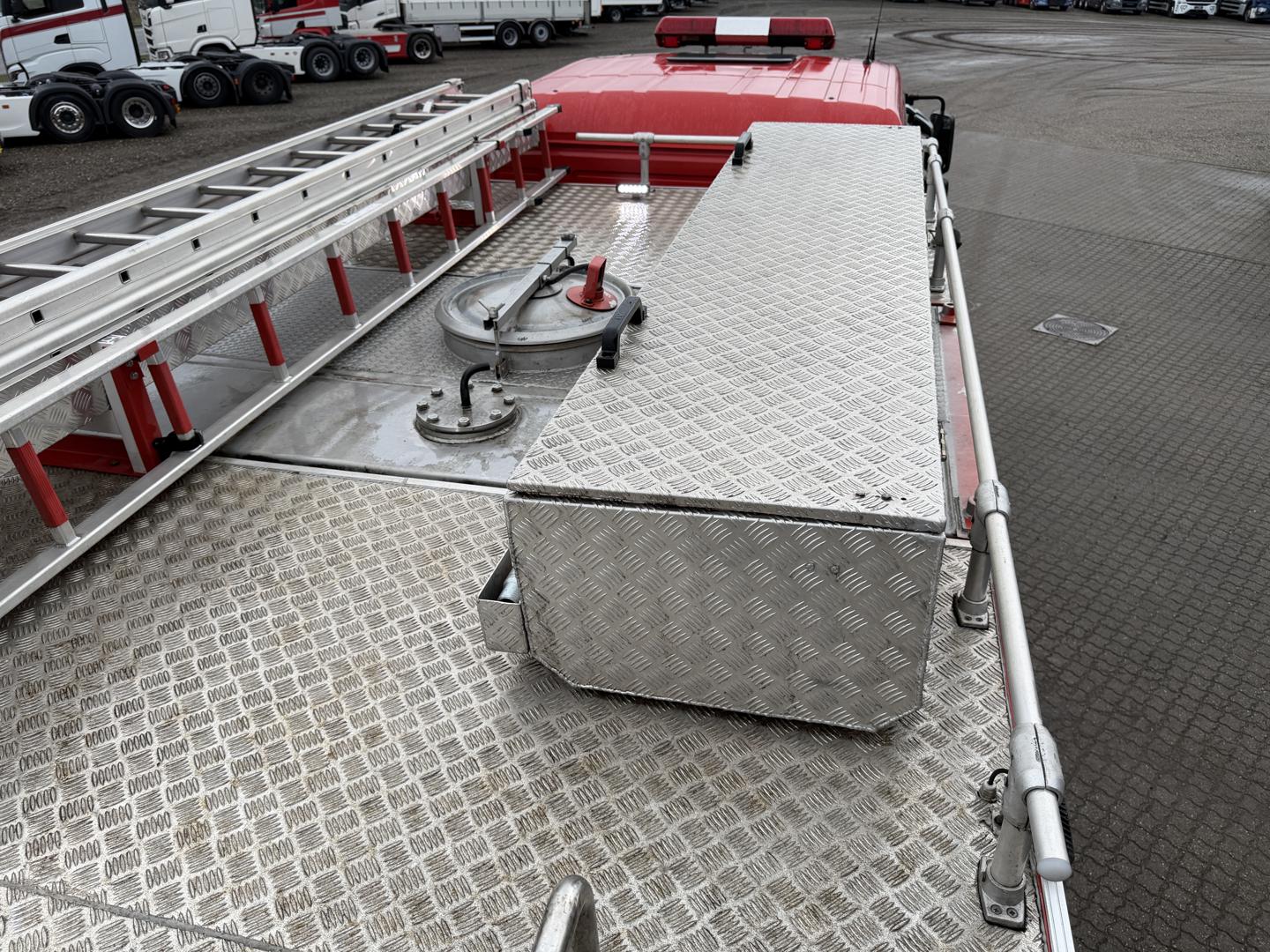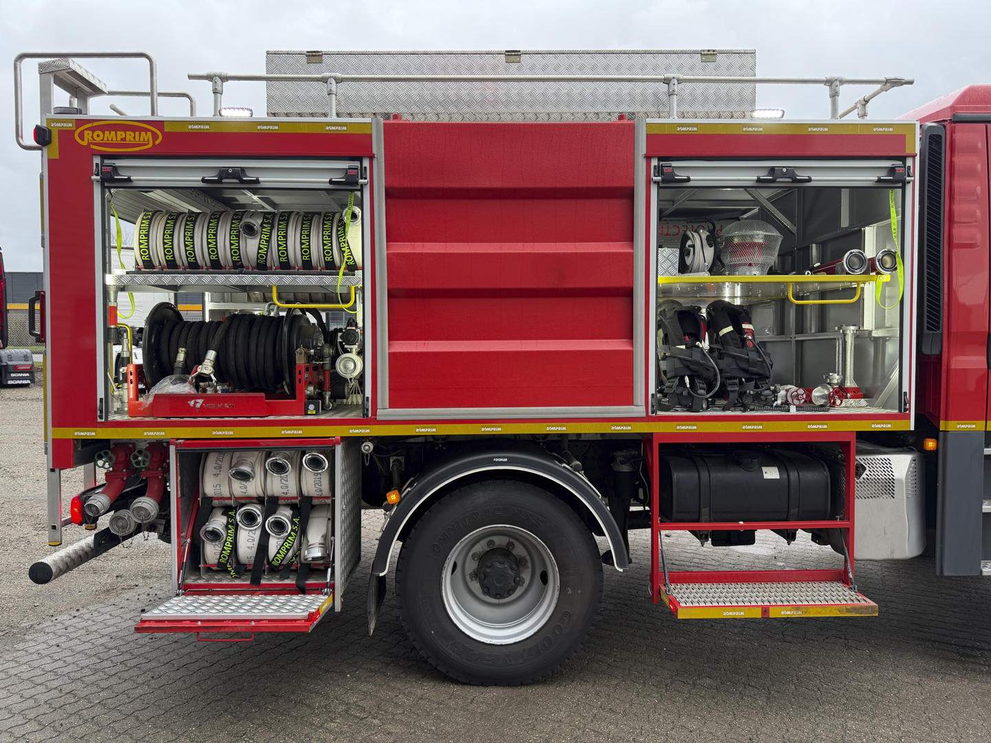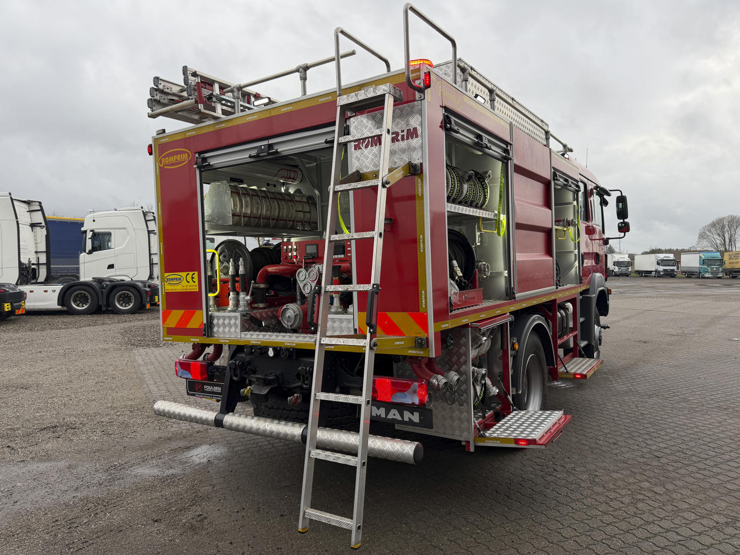 Brandbilen leveres fuldt udstyret med alt nødvendigt materiel, herunder slanger, pumper, generator, værktøj, iltflasker m.m. Den står i samme stand, som da den kørte ud fra fabrikken – helt ubrugt siden første indregistrering i 2020.