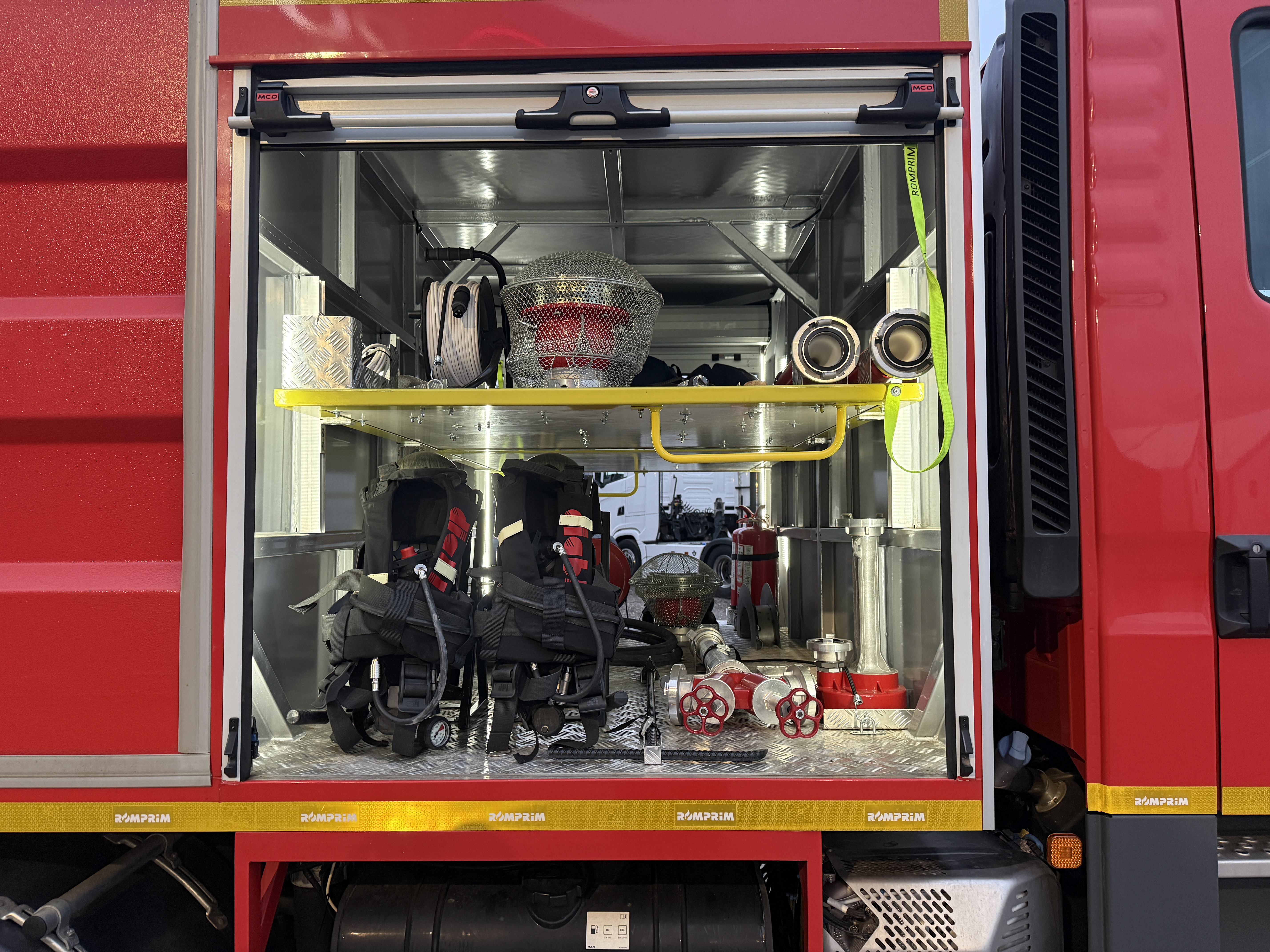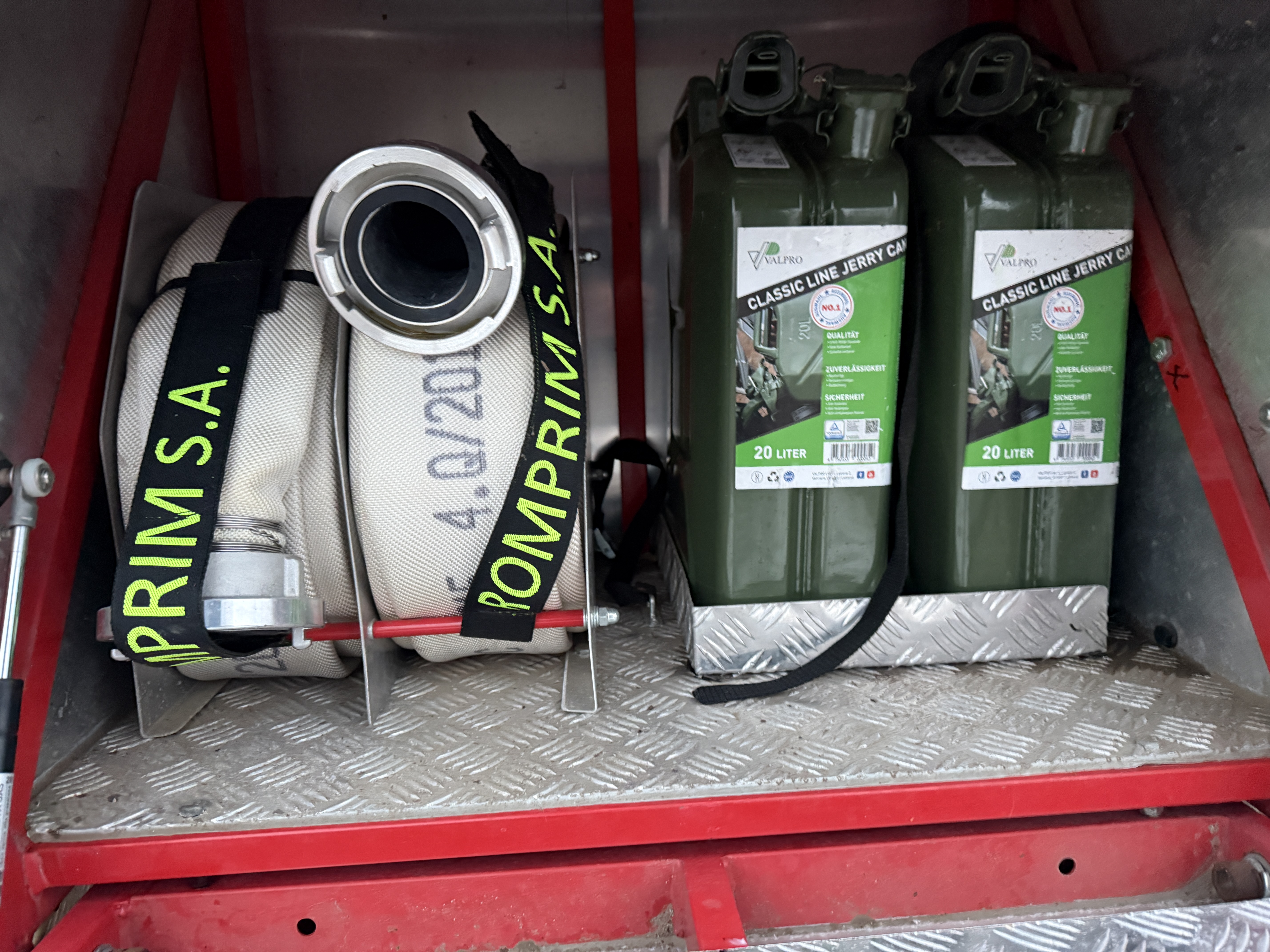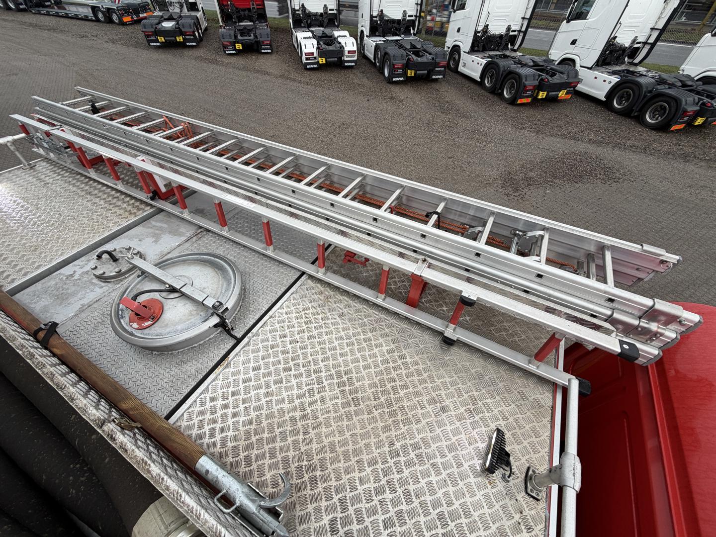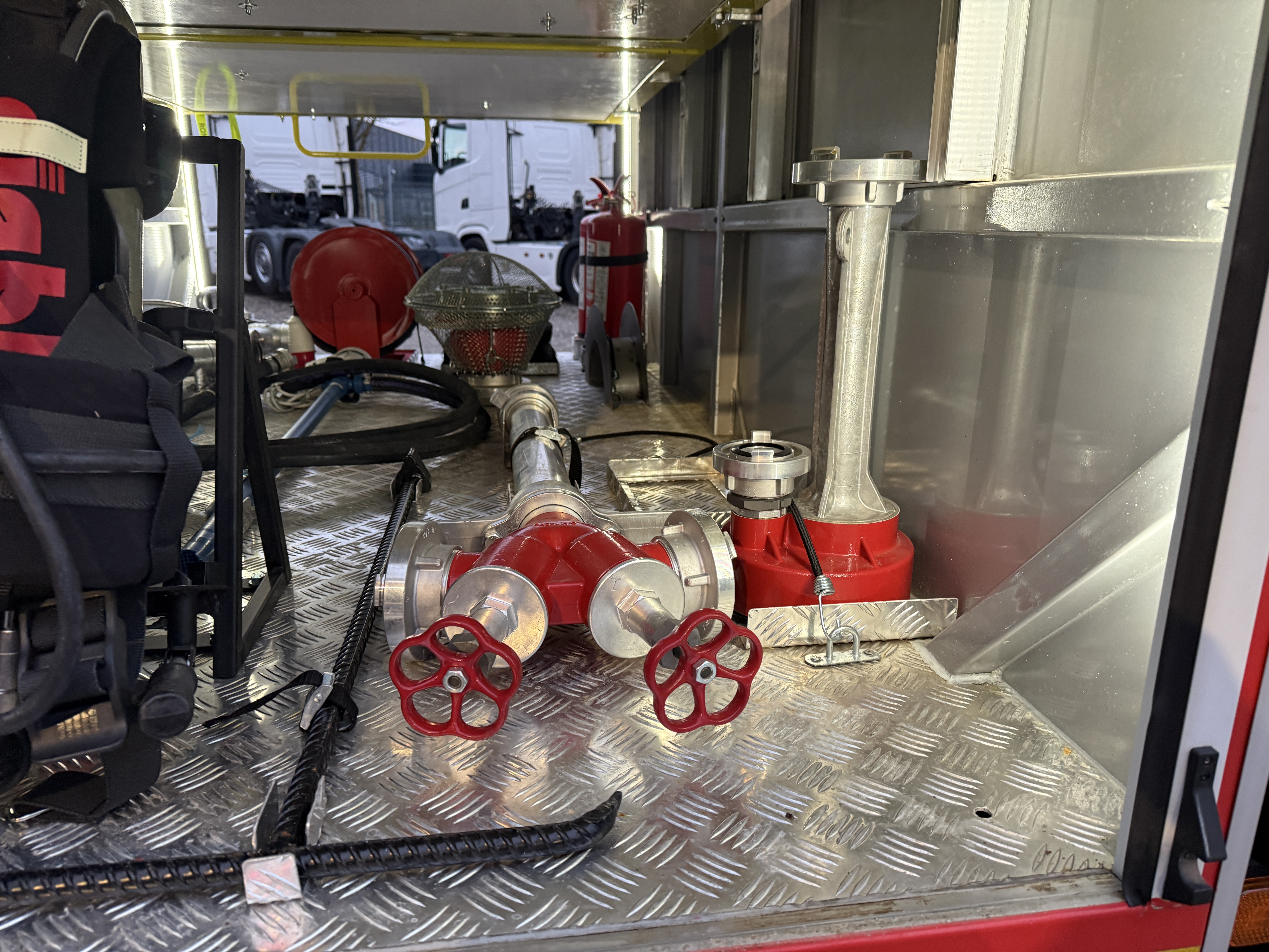 Brandbilen leveres fuldt udstyret med alt nødvendigt materiel, herunder slanger, pumper, generator, værktøj, iltflasker m.m. Den står i samme stand, som da den kørte ud fra fabrikken – helt ubrugt siden første indregistrering i 2020.