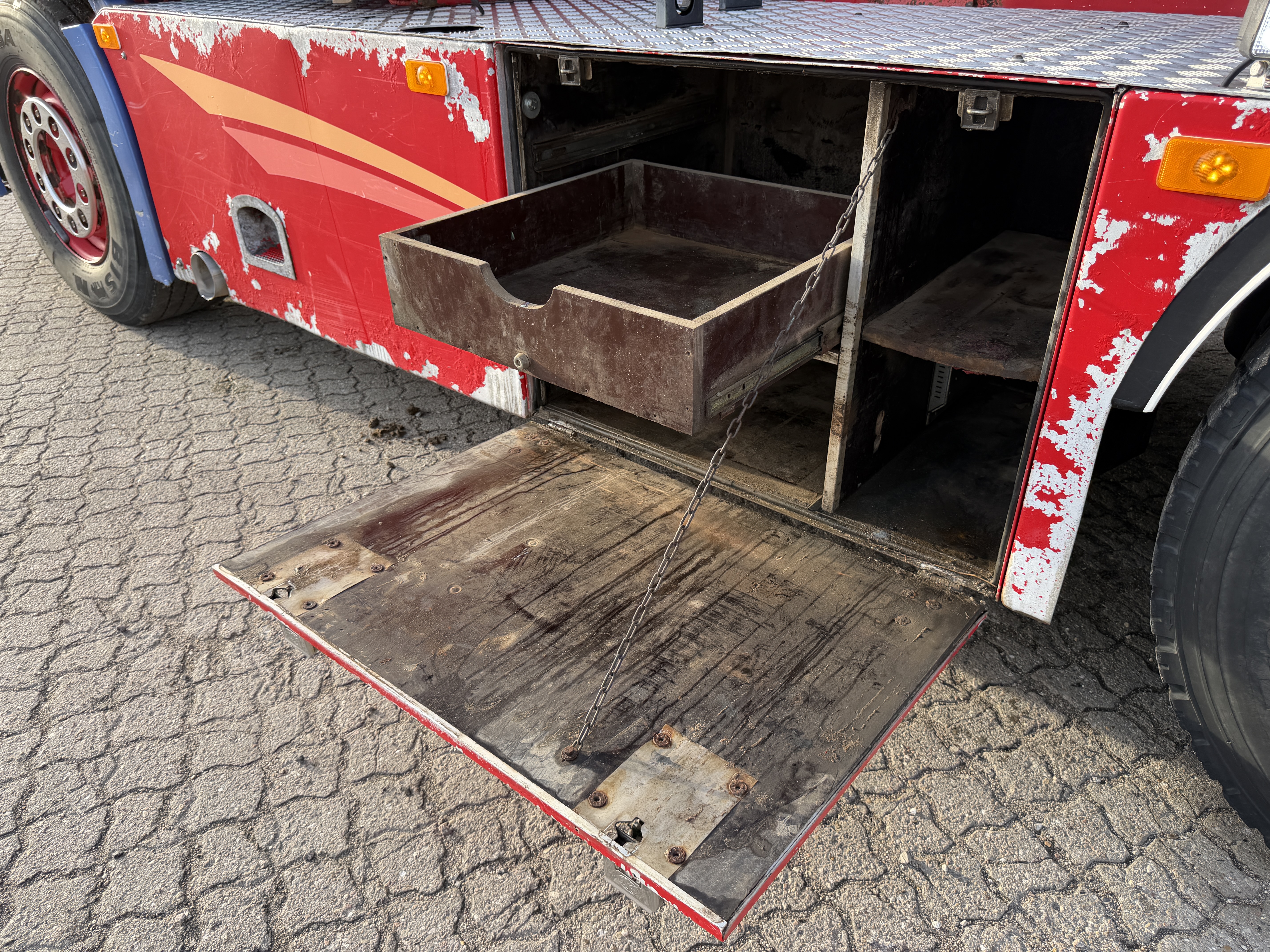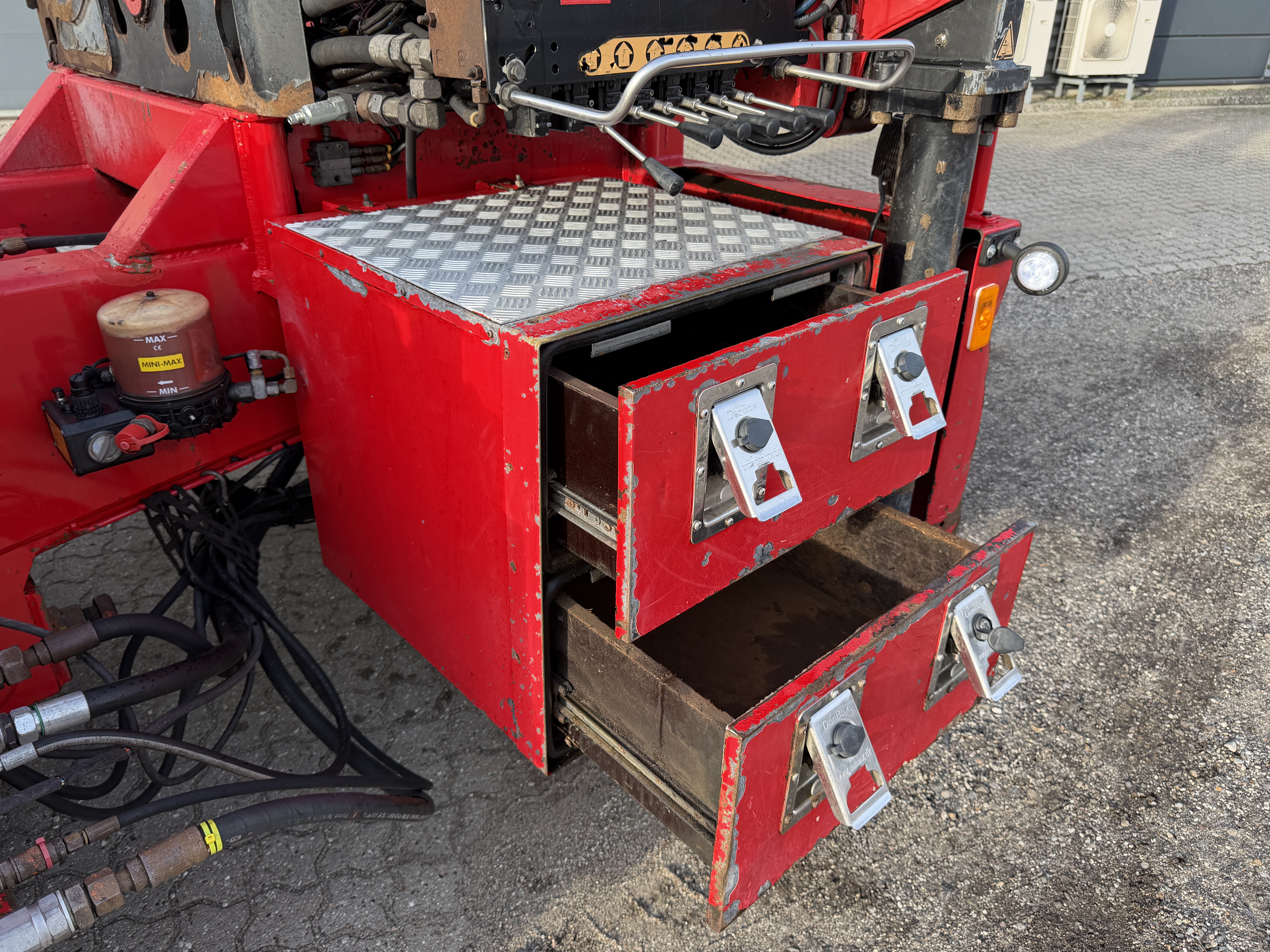 Lastbilen er udstyret med værktøjskasser, luftudtag til pendelbagsmæk og olieudtag til pendelside. Den har VBG 57 mm træk og læssekamera.