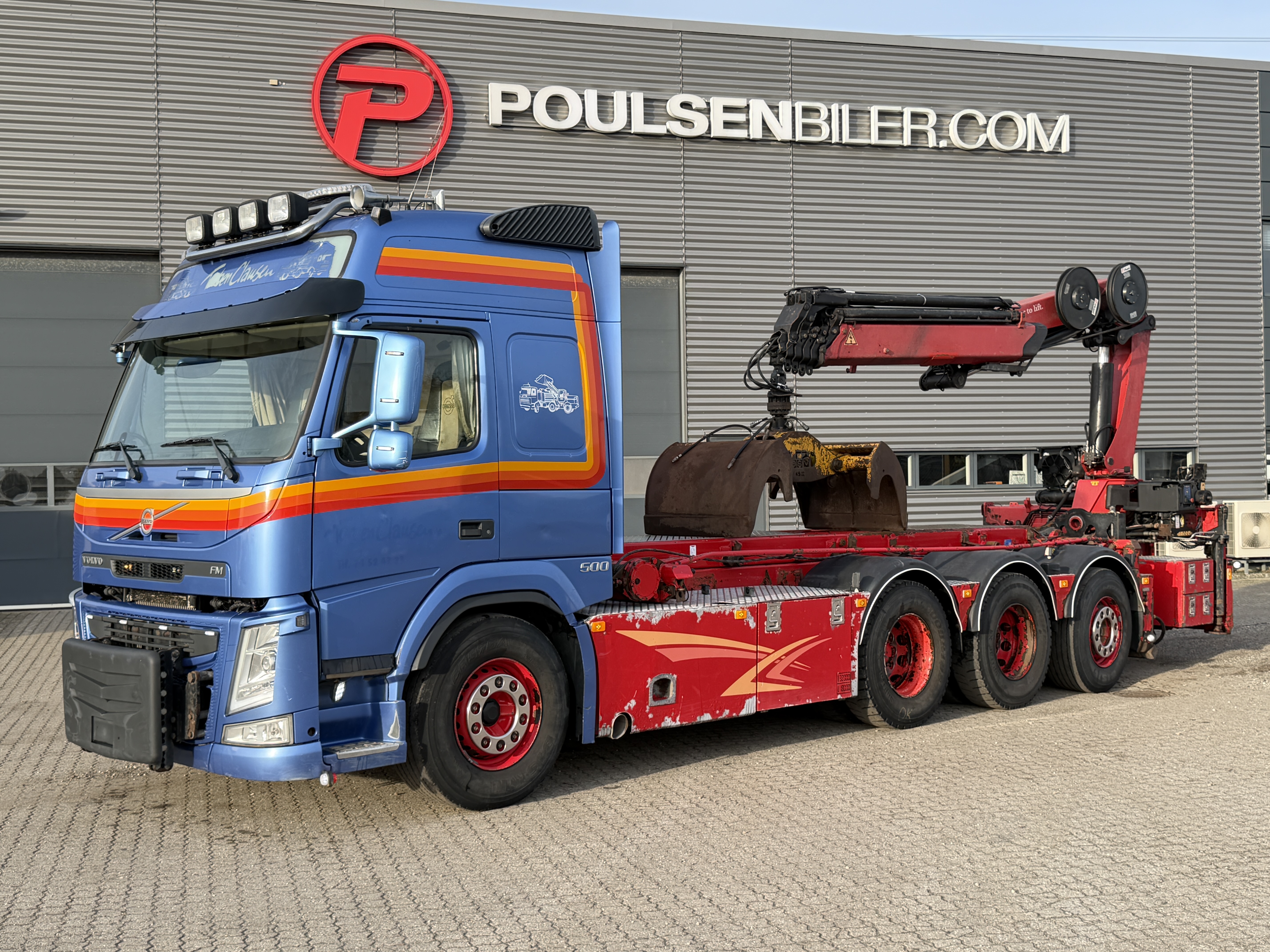 Denne Volvo FM500 er en stærk og alsidig lastbil, der er klar til krævende opgaver. Den er opbygget med HMF wirehejs og sneplovbeslag, aftagelig HMF 2620-K5 kran med Scanreco fjernstyring og grab.