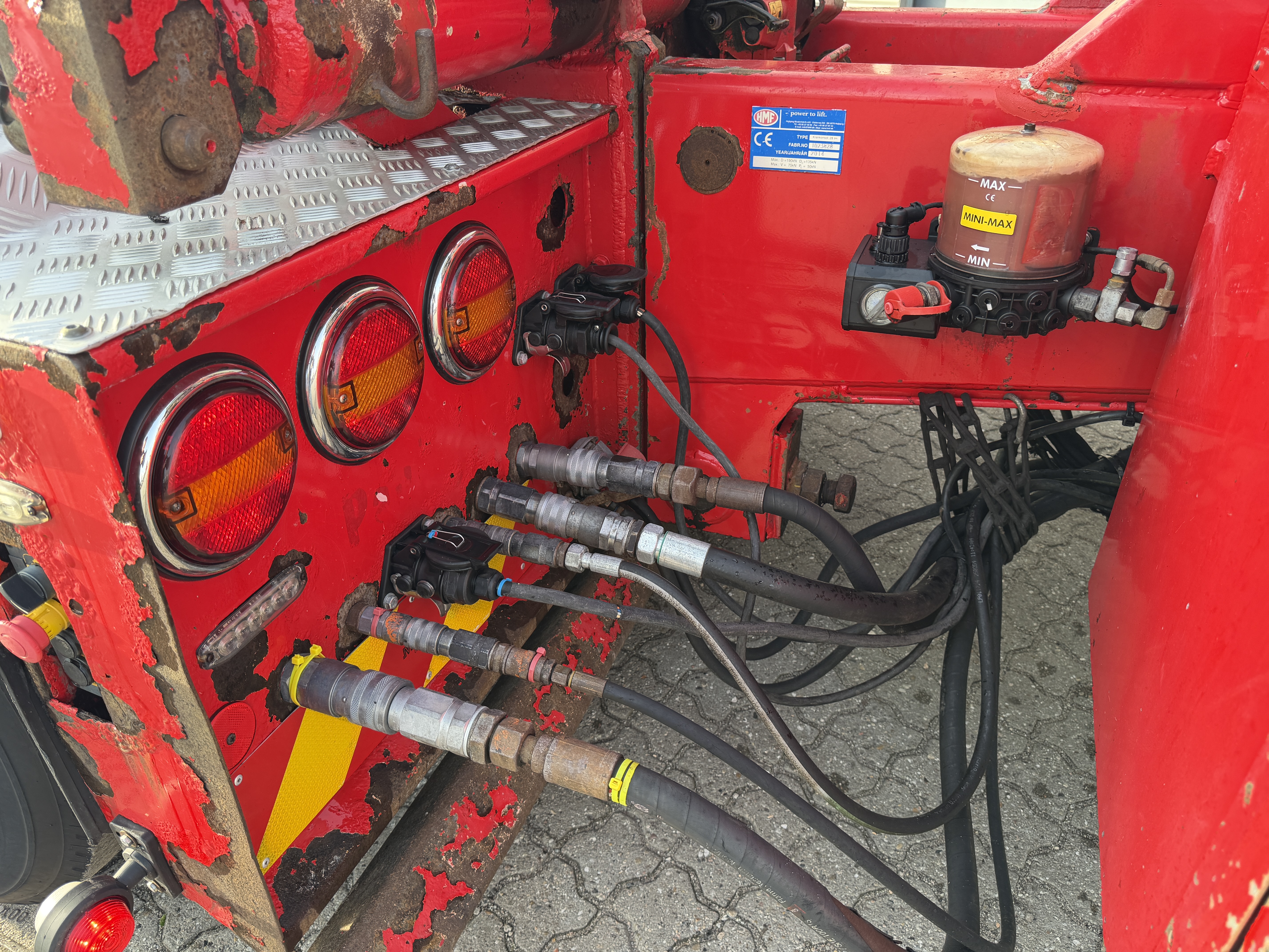 Lastbilen er udstyret med værktøjskasser, luftudtag til pendelbagsmæk og olieudtag til pendelside. Den har VBG 57 mm træk og læssekamera.