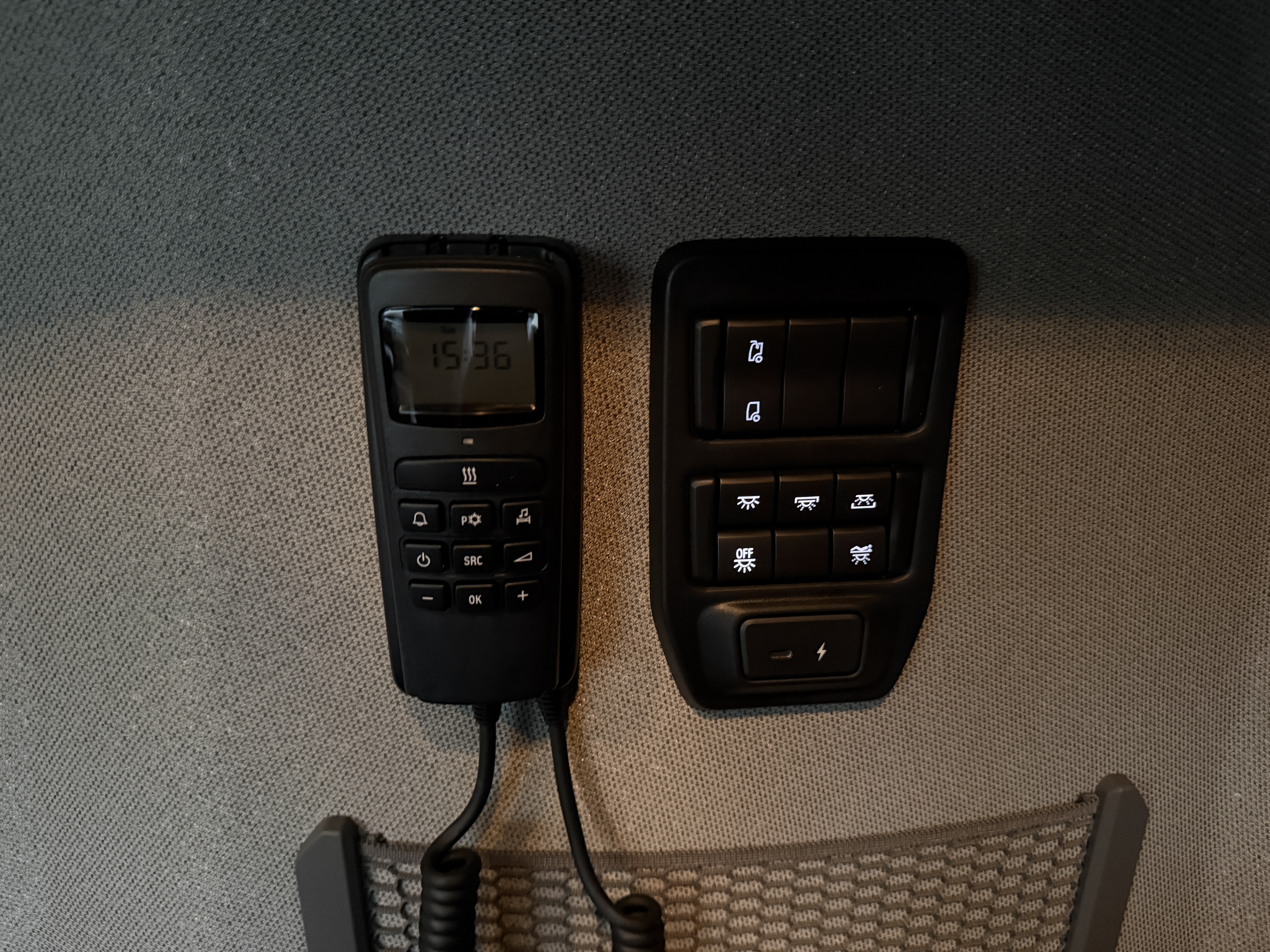 Kabinen er godt udstyret med navigation, Apple CarPlay, aircondition og Scania Air Cooler. Førersædet har både varme og ventilation, og der er installeret bakkamera, radio og walkie.