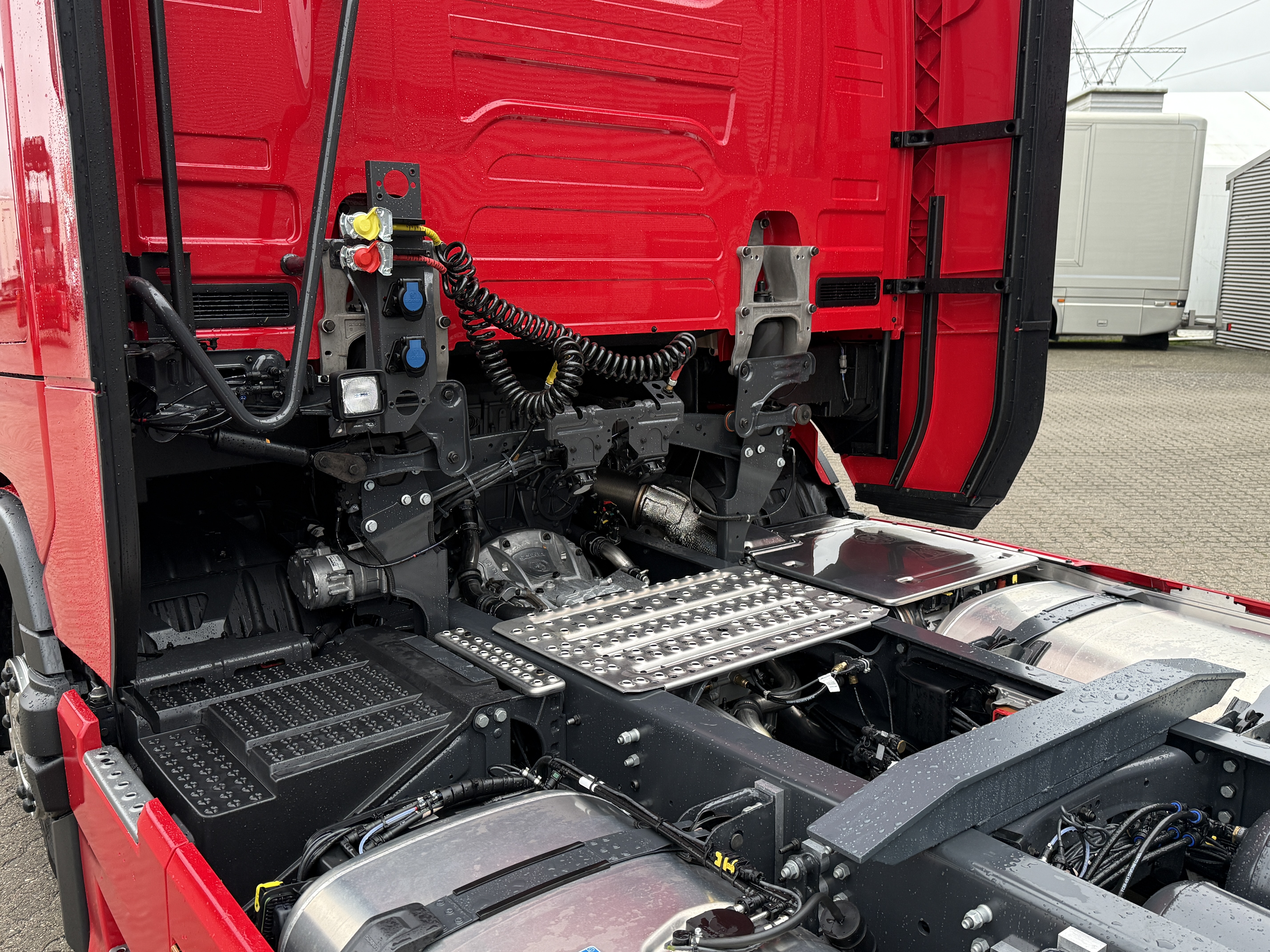 Scania S460 mega trækker står klar til nye opgaver. Den er fuldt luftaffjedret og udstyret med trailerbeskytter. Lastbilen har både ACC, sporassistent og retarder.