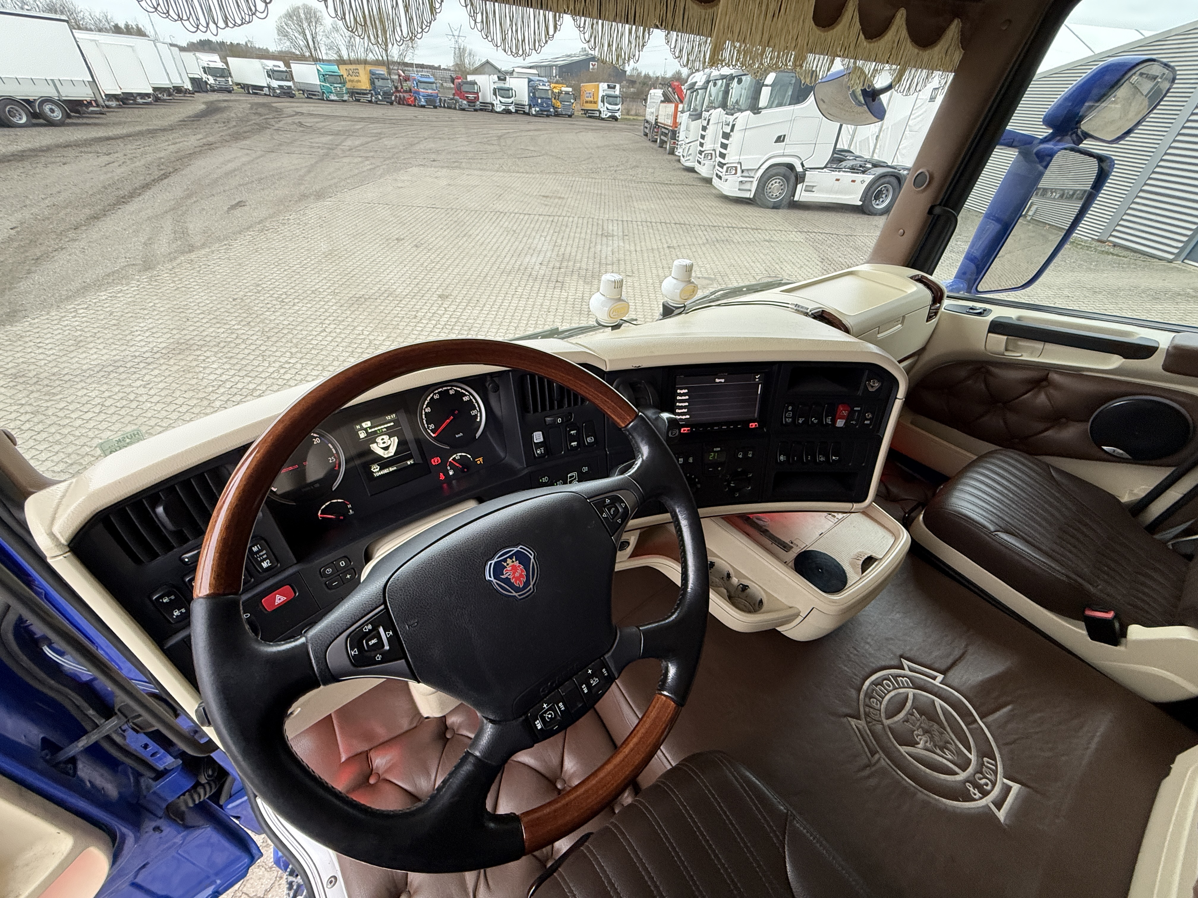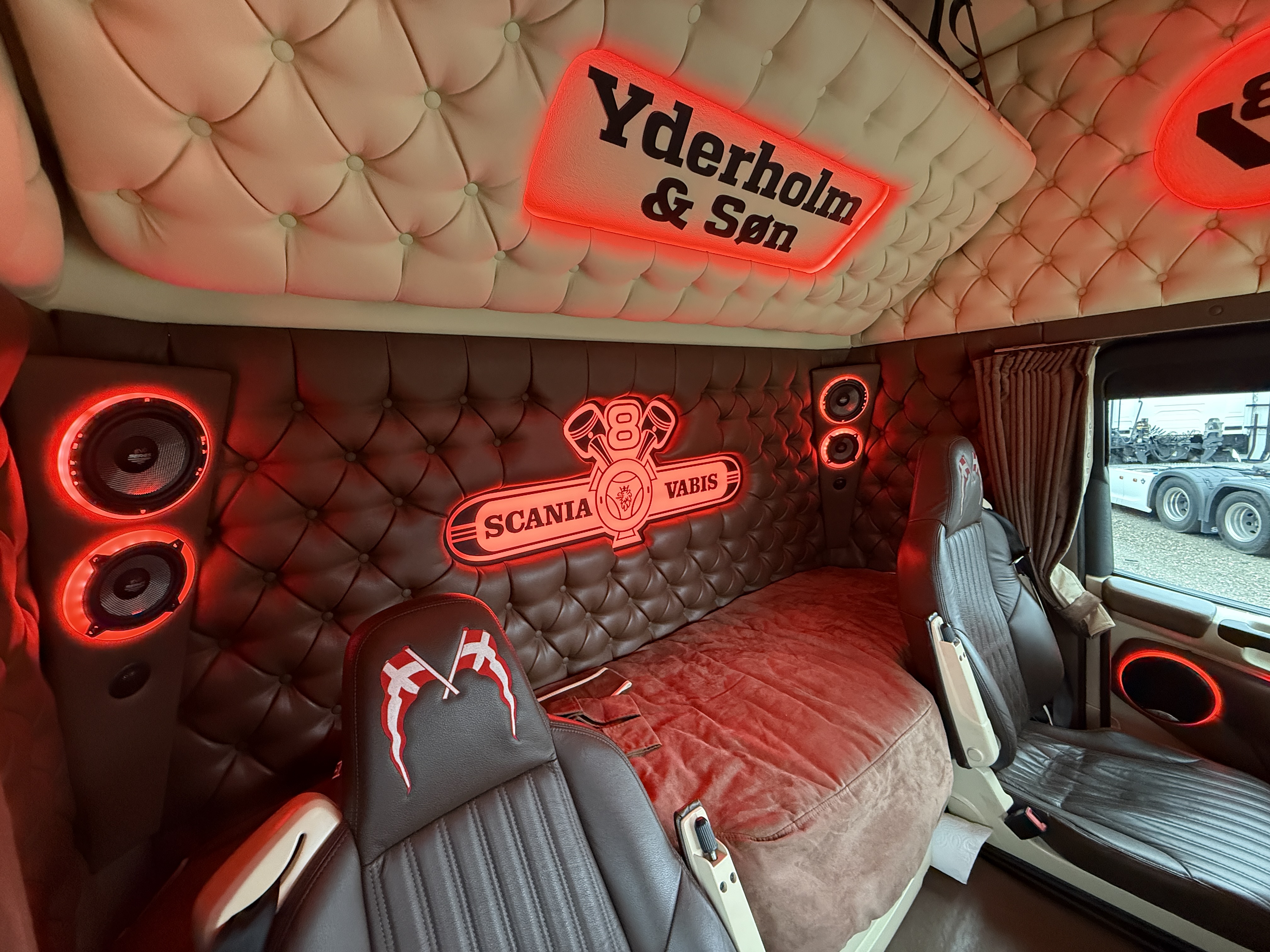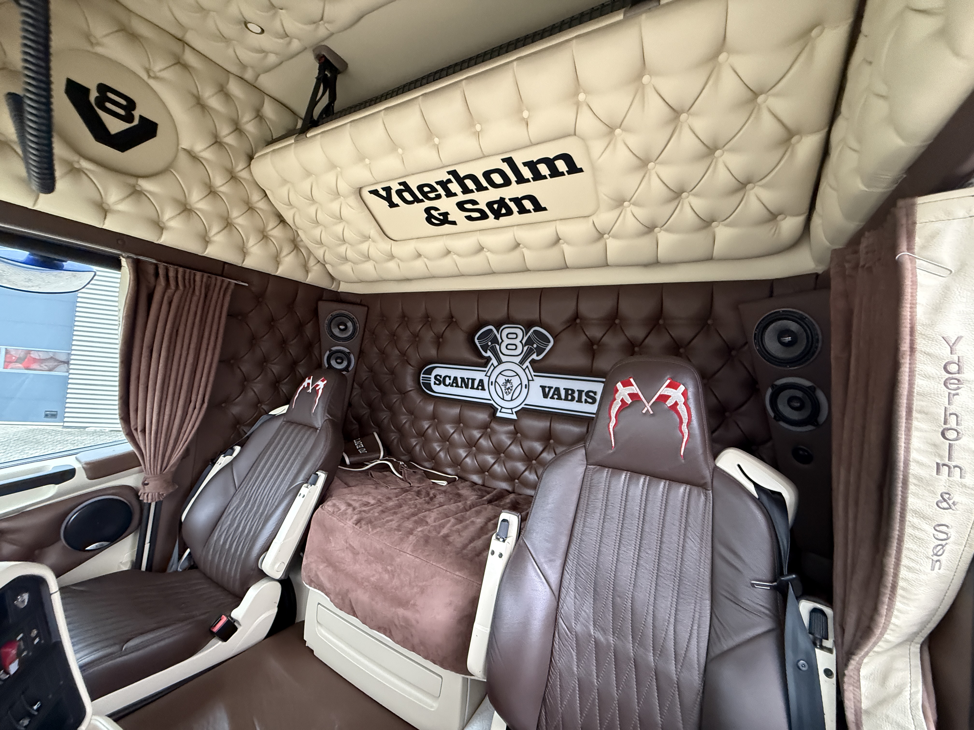 Denne Scania R520 boogie-trækker, der er spækket med udstyr. Kabinen er fuldt polstret og har lædersæder, hvor førersædet er luftaffjedret og udstyret med varme. læder gulv, og der er installeret et stort anlæg, mikrobølgeovn og air cooler.