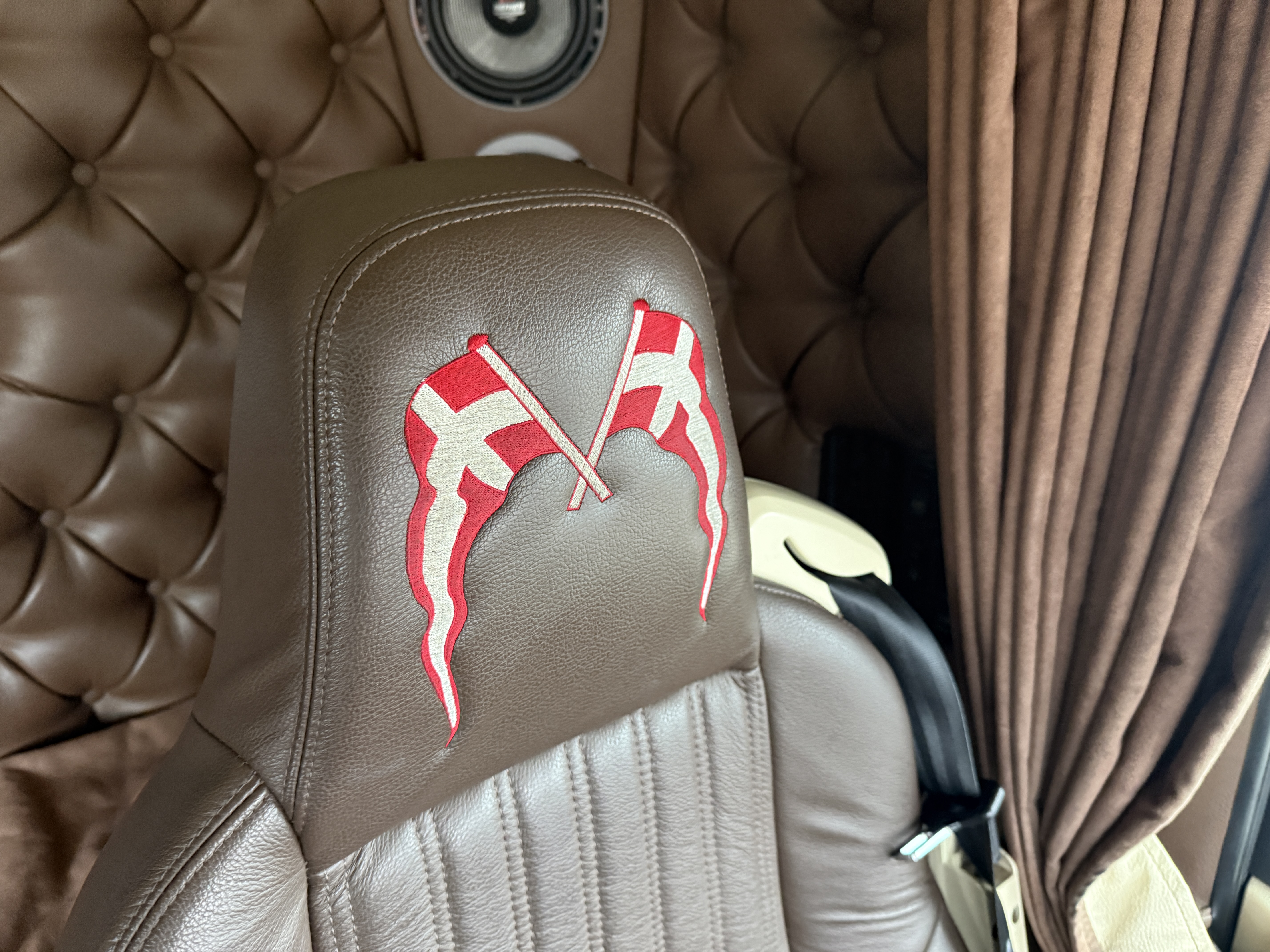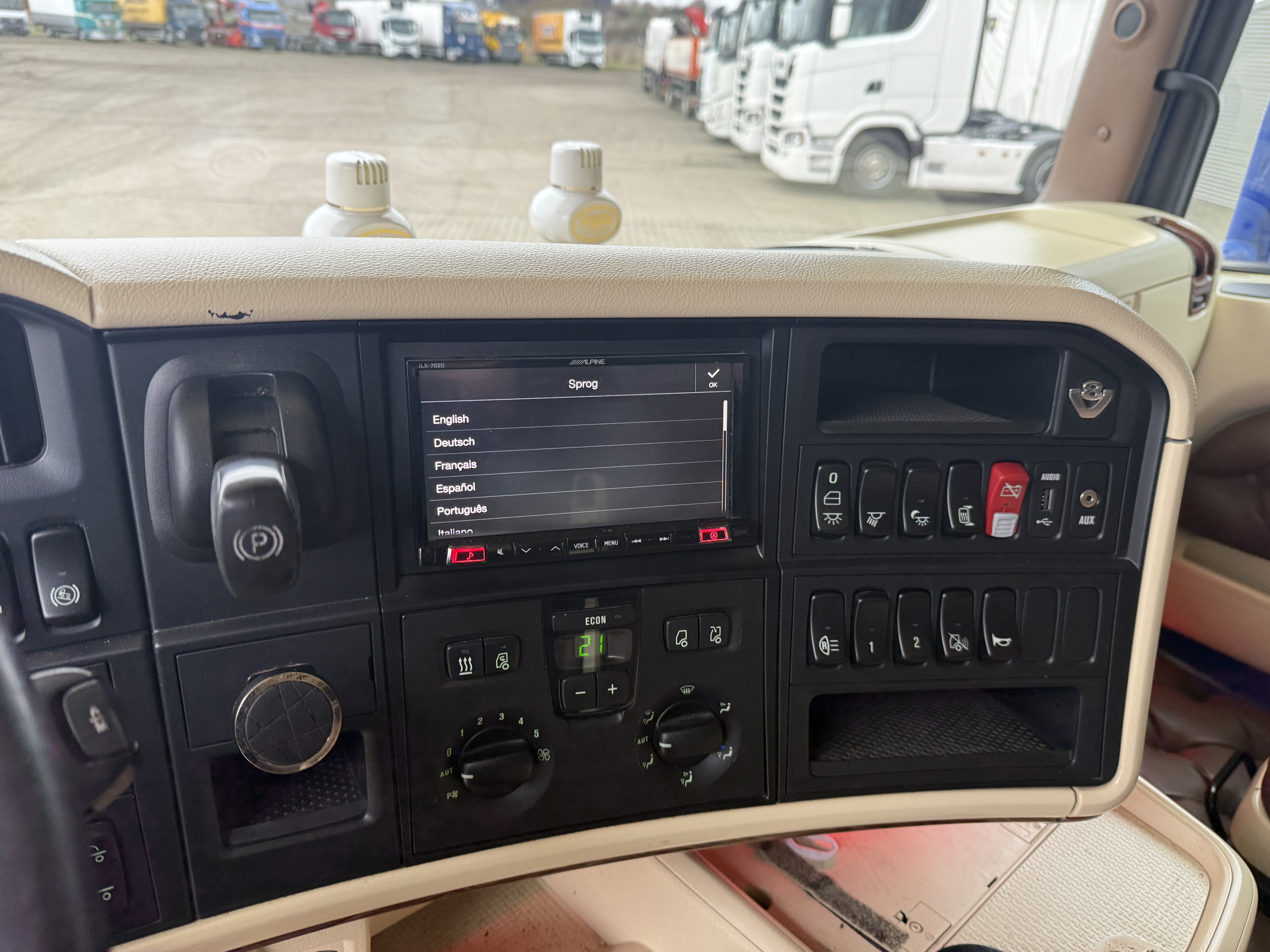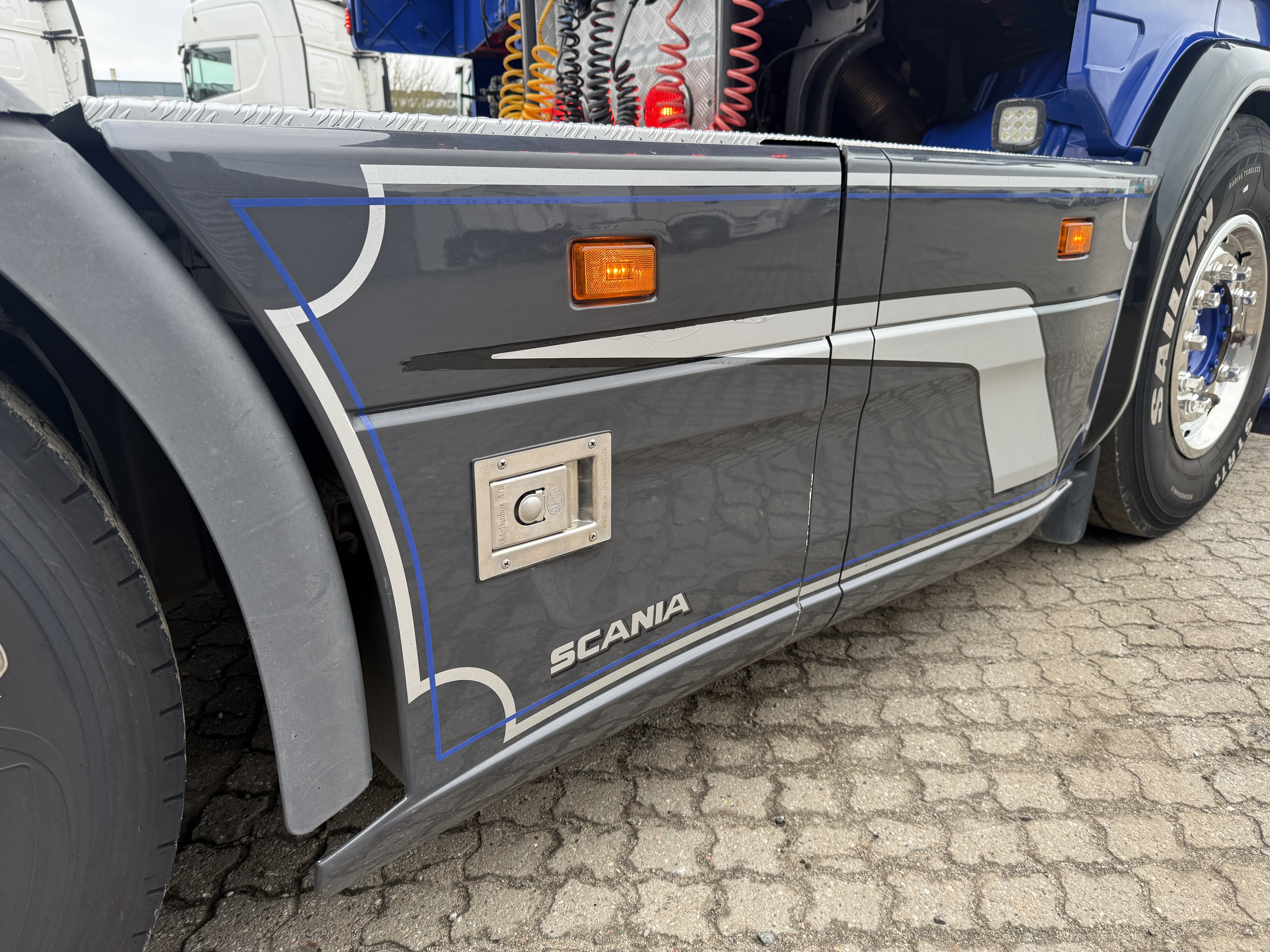 Denne Scania R520 boogie-trækker, der er spækket med udstyr. Kabinen er fuldt polstret og har lædersæder, hvor førersædet er luftaffjedret og udstyret med varme. læder gulv, og der er installeret et stort anlæg, mikrobølgeovn og air cooler.