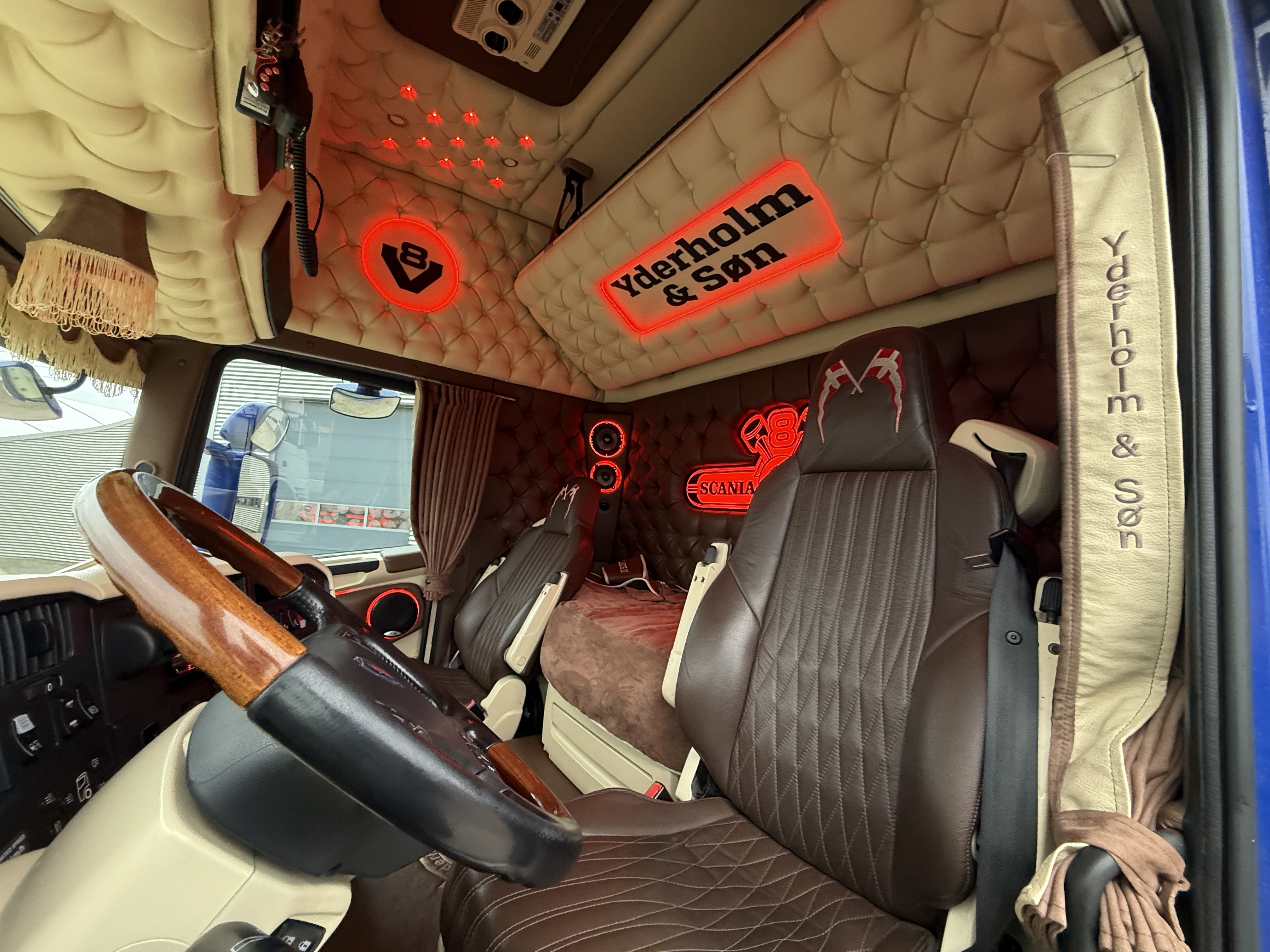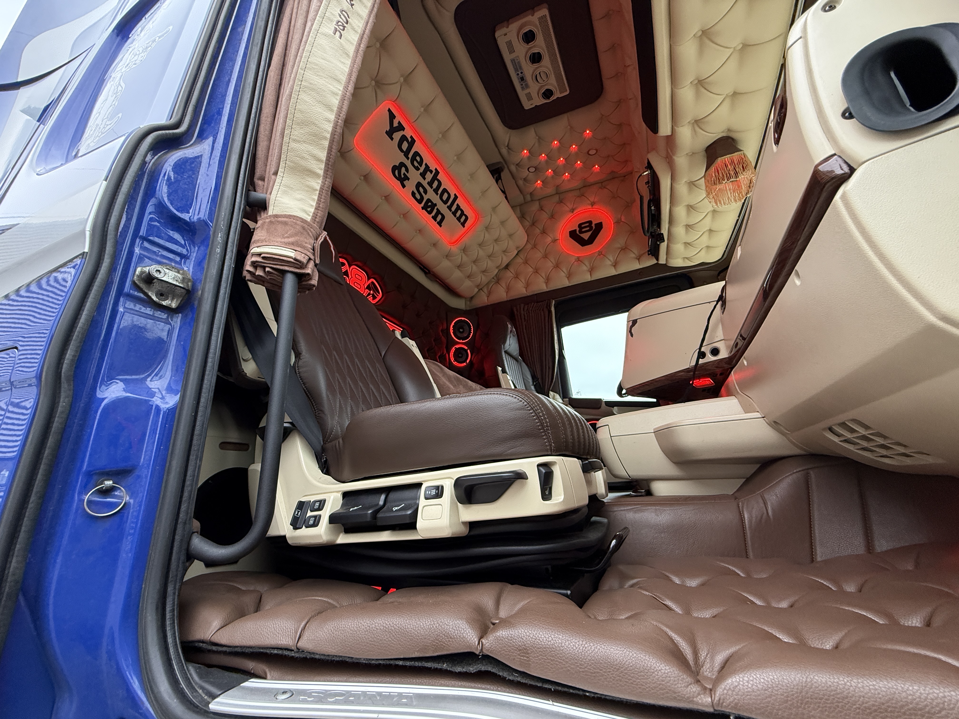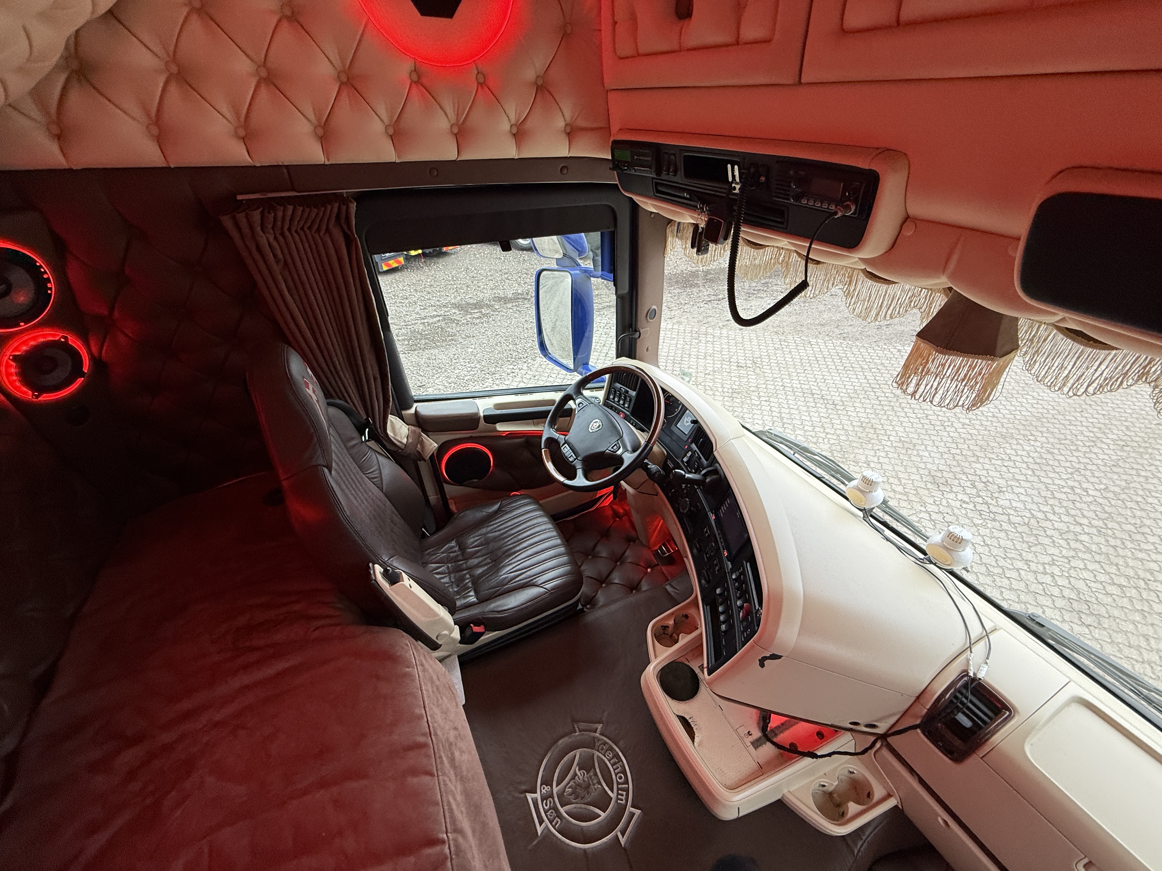Denne Scania R520  boogie-trækker, der er spækket med udstyr. Kabinen er fuldt polstret og har lædersæder, hvor førersædet er luftaffjedret og udstyret med varme. læder gulv, og der er installeret et stort anlæg, mikrobølgeovn og air cooler.