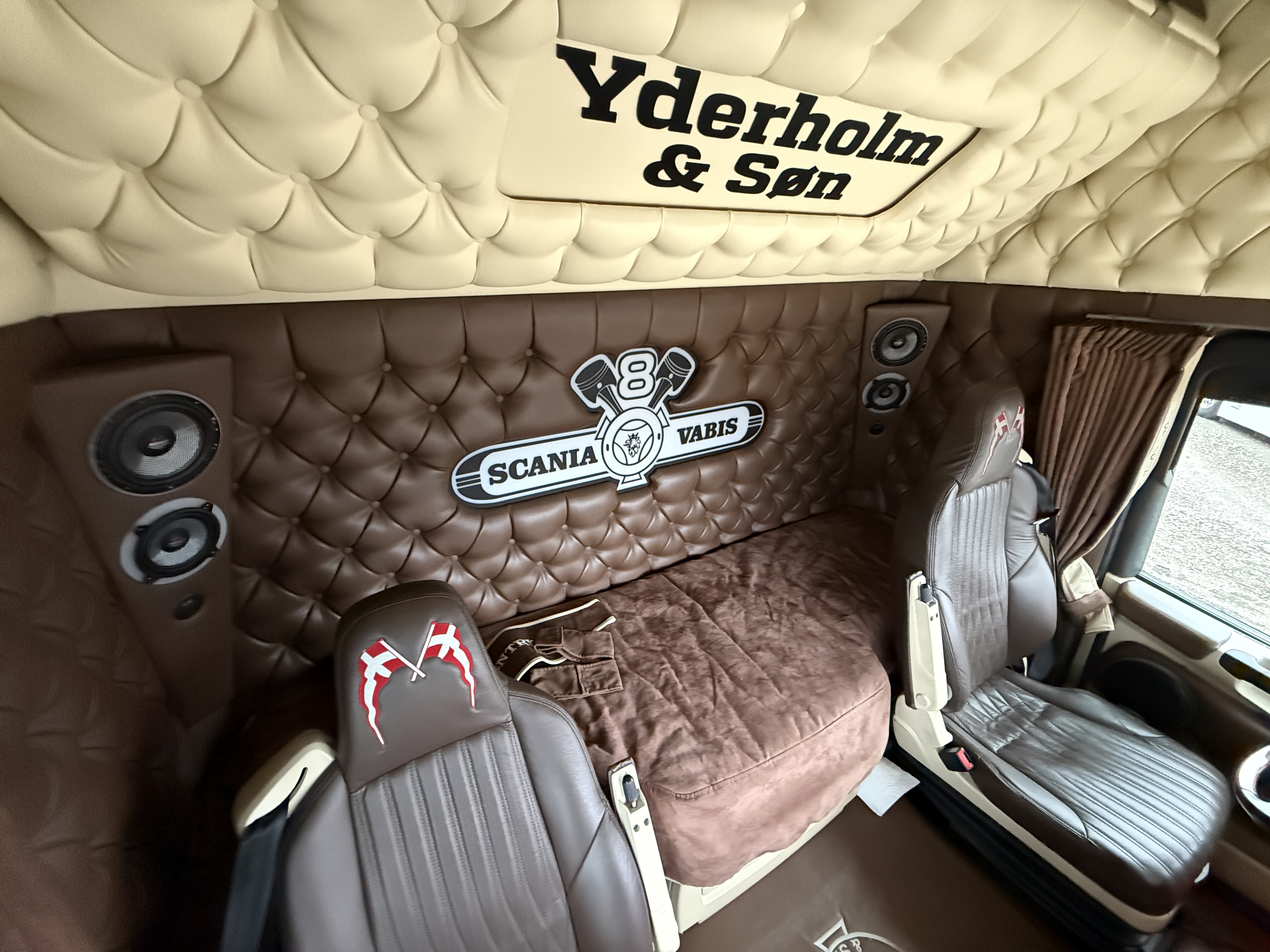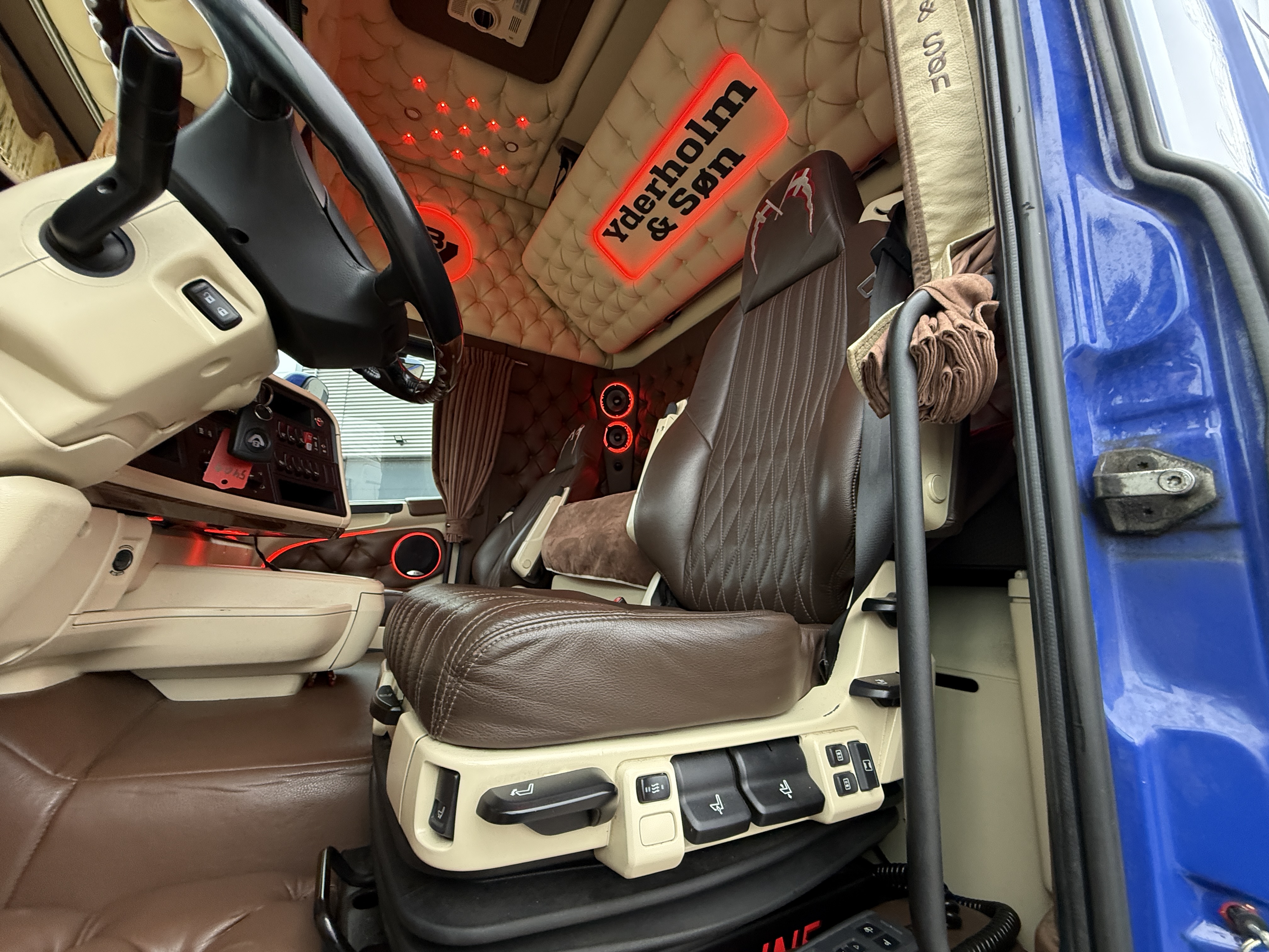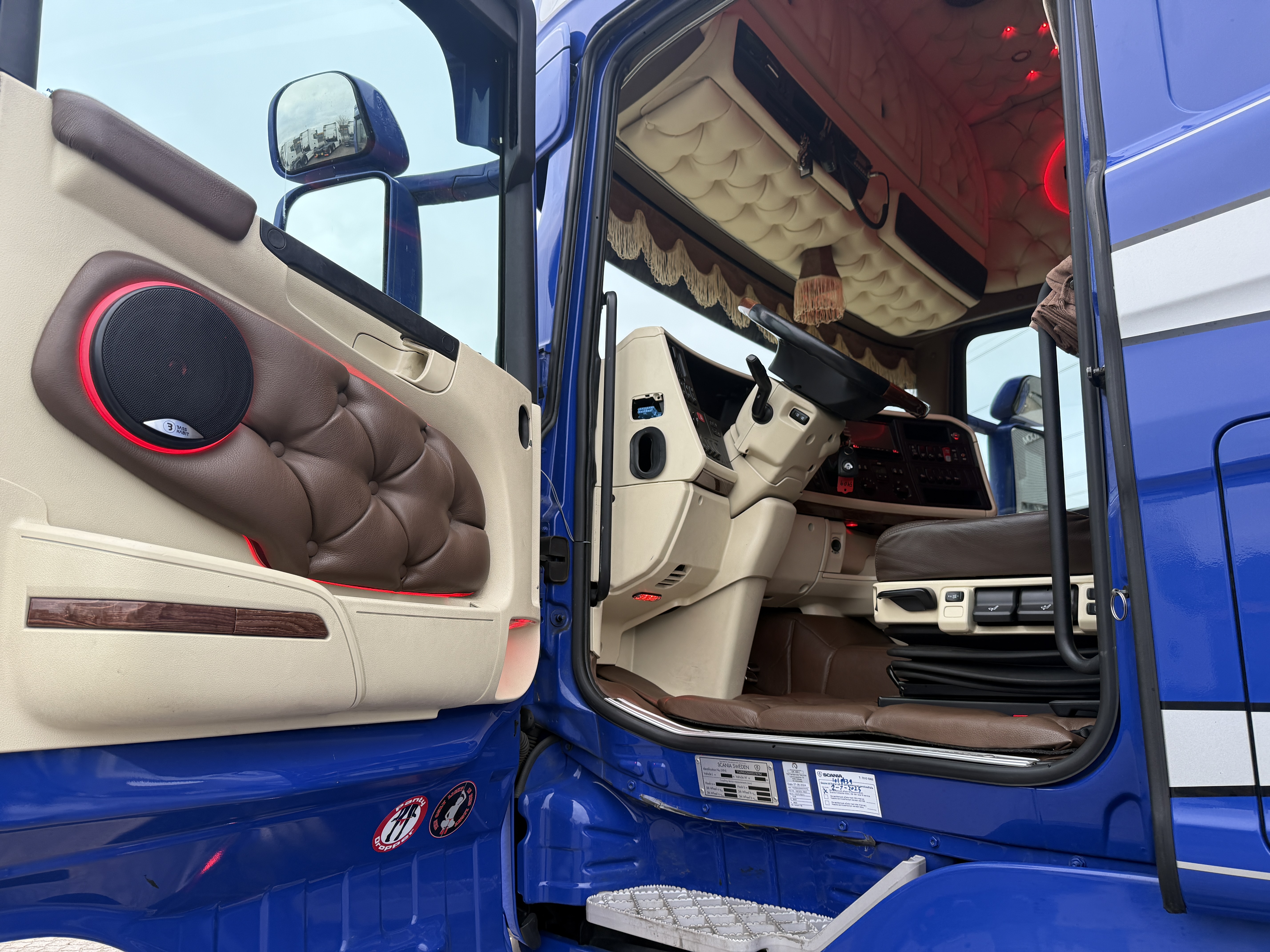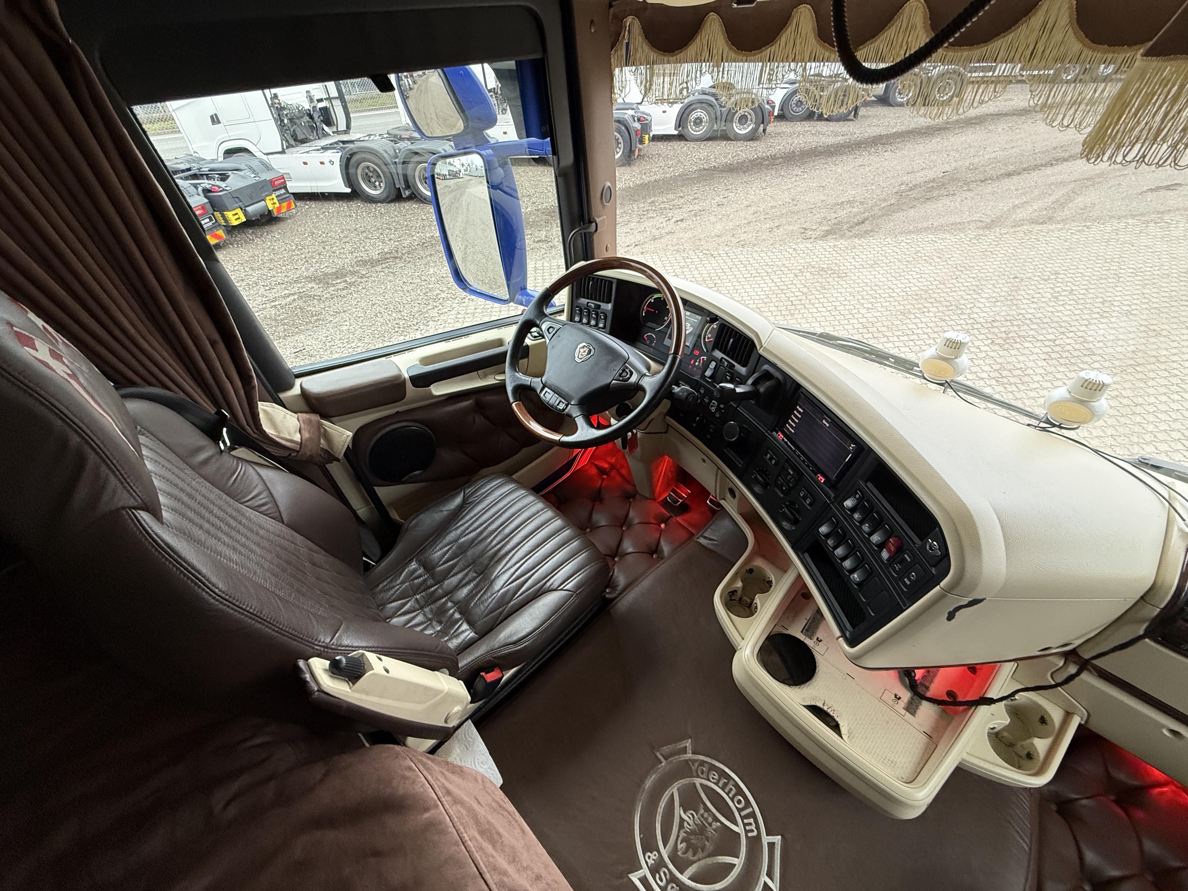 Denne Scania R520  boogie-trækker, der er spækket med udstyr. Kabinen er fuldt polstret og har lædersæder, hvor førersædet er luftaffjedret og udstyret med varme. læder gulv, og der er installeret et stort anlæg, mikrobølgeovn og air cooler.