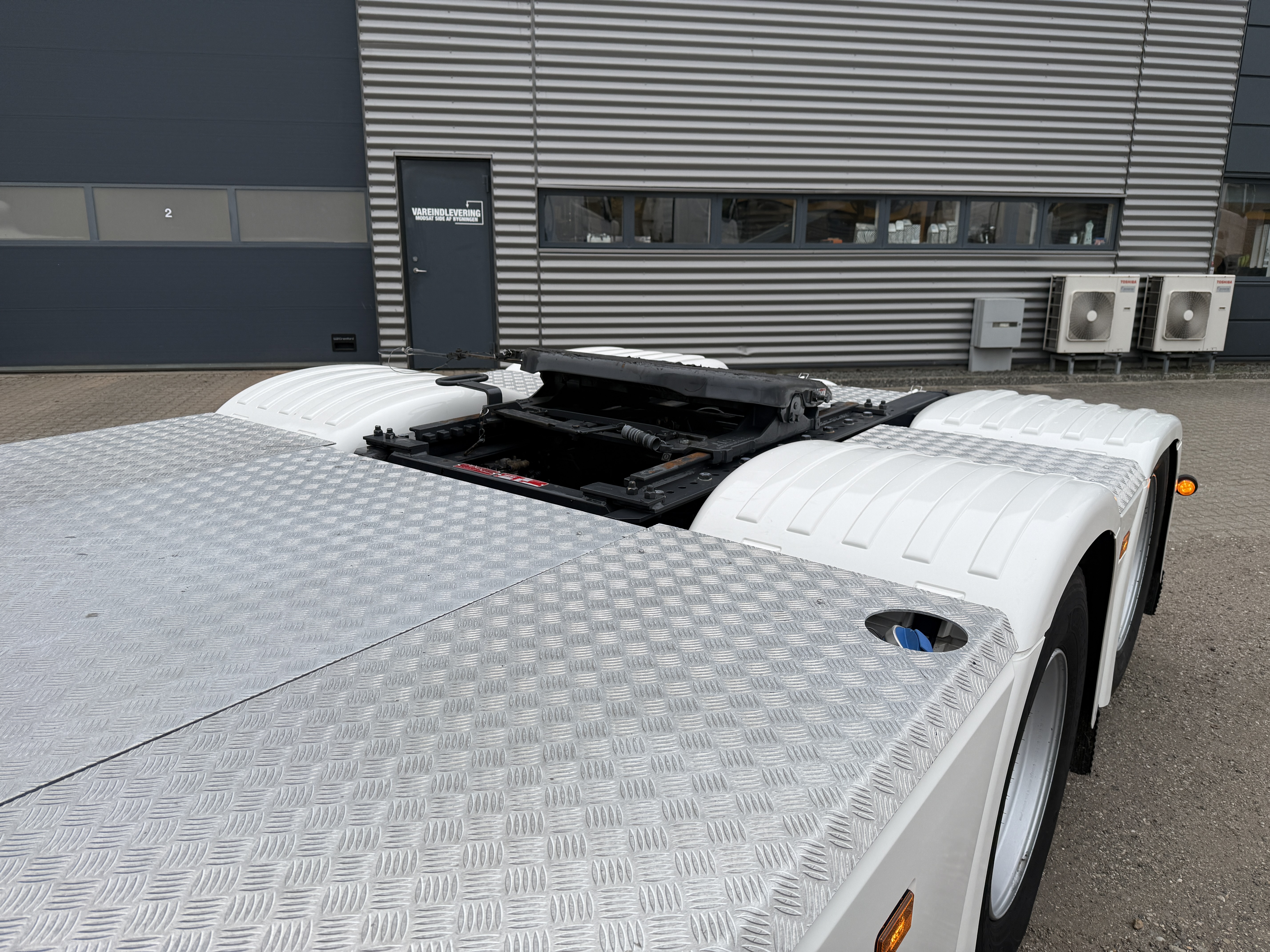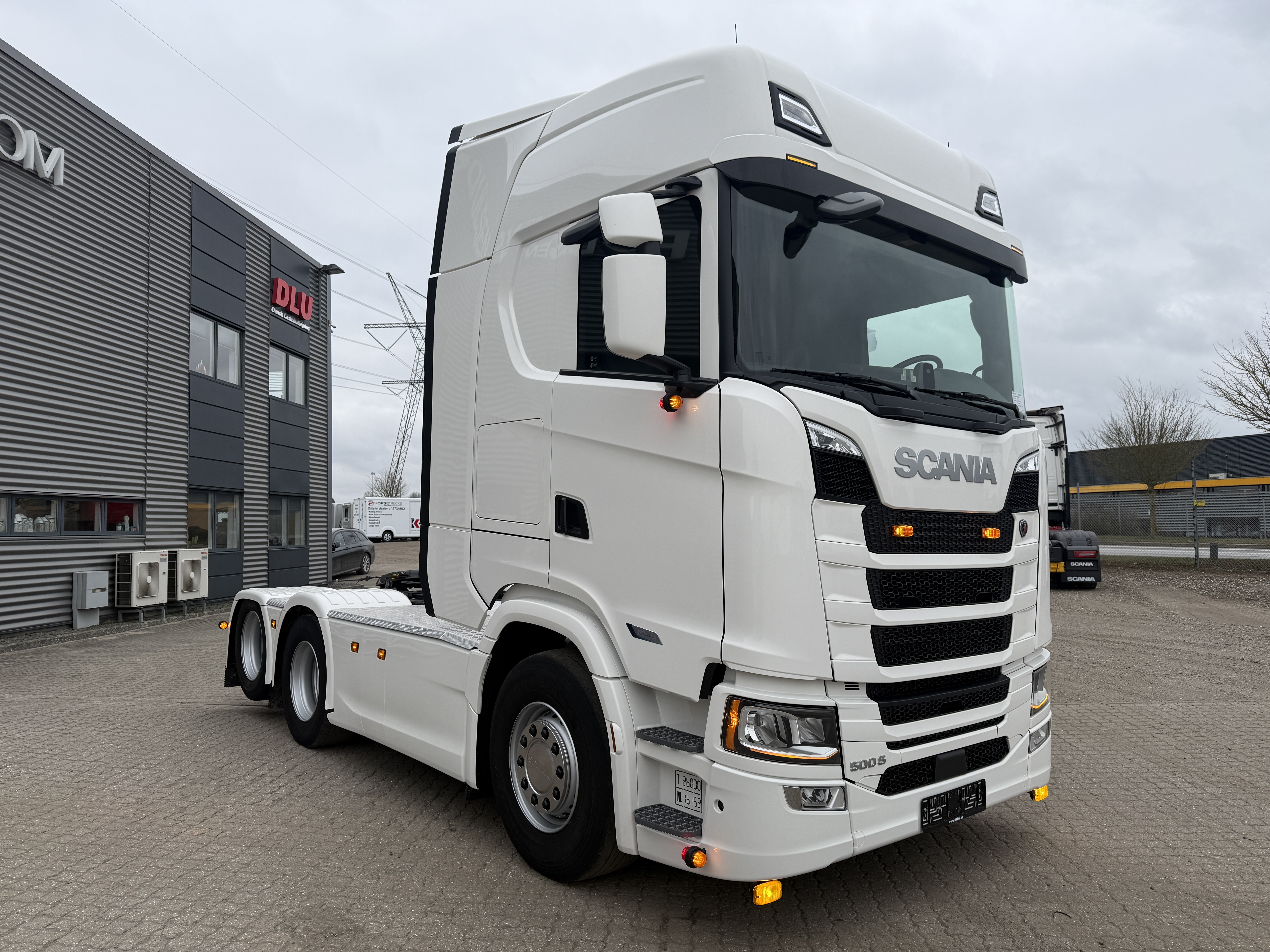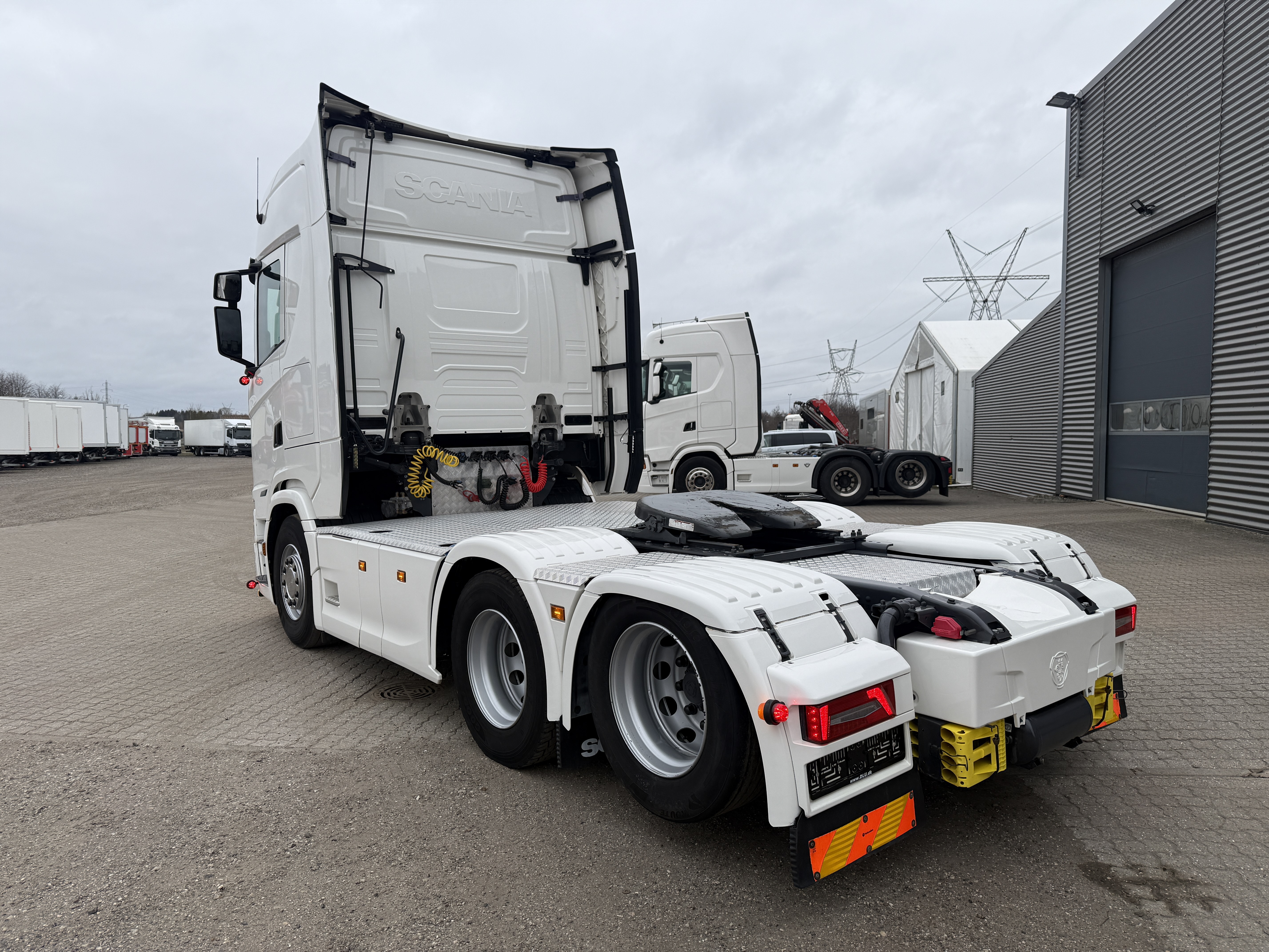 Denne Scania S500 6x2 hydrauliktrækker er fra januar 2024 og har kørt 190.000 km. Det er en veludstyret Klasse 3‑trækker med hydraulikanlæg til både tip og walking floor. Trækkeren er monteret med alu‑afdækning, G‑streng mellem aksel 2 og 3, lufthaner og Nato‑stik samt LED‑arbejdslys, slingerlamper og blitzlys i frontgrillen. Den har en brændstoftank på 565 liter, forskydelig JOST‑skammel og fuld luftaffjedring.