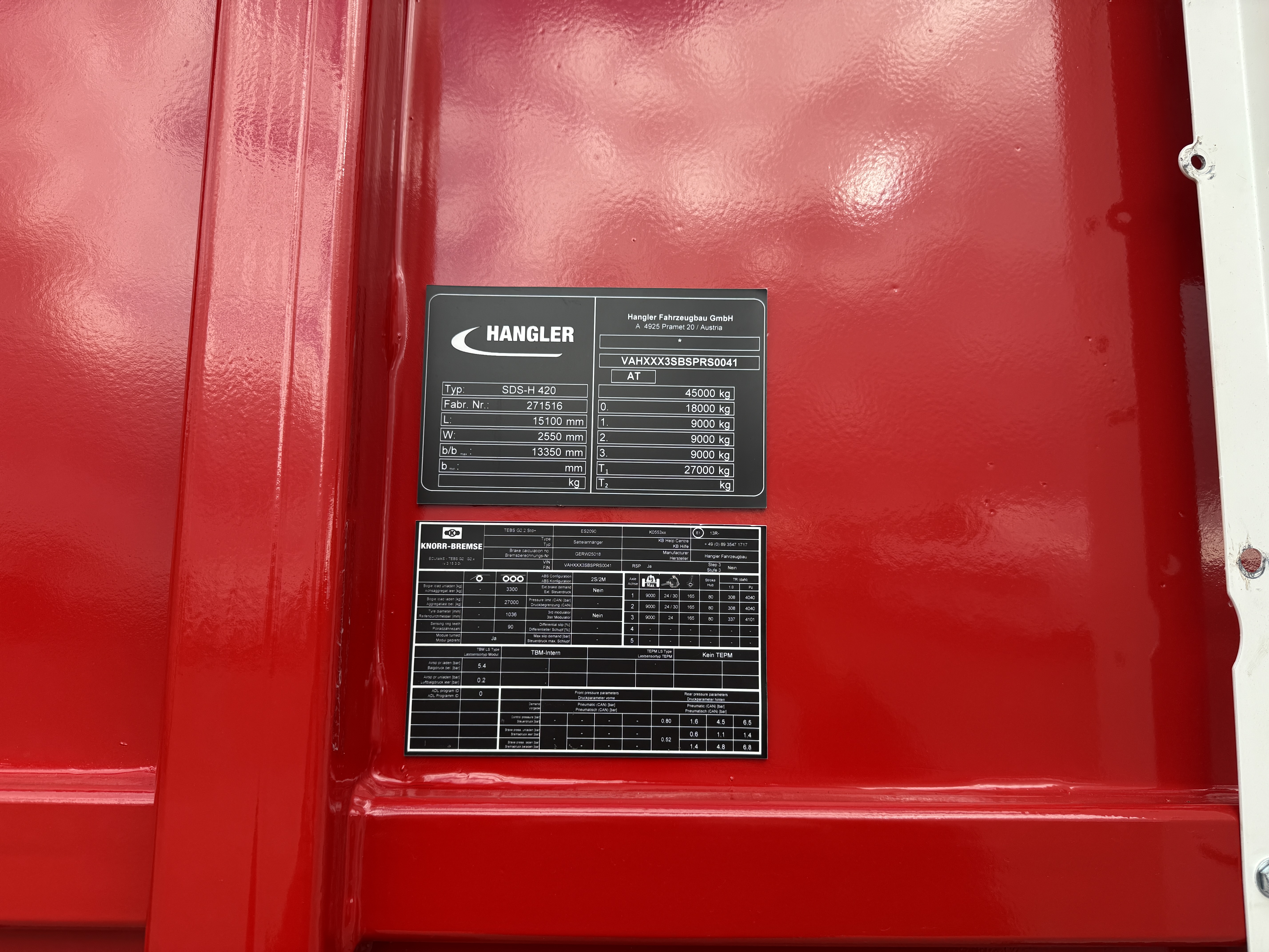 Traileren er udstyret med tromlebremser, og har liftaksel på første aksel samt medstyrende tredje aksel for øget manøvredygtighed. Den er monteret med en kraftig, høj frontvæg, som giver ekstra sikkerhed og stabilitet under transport.