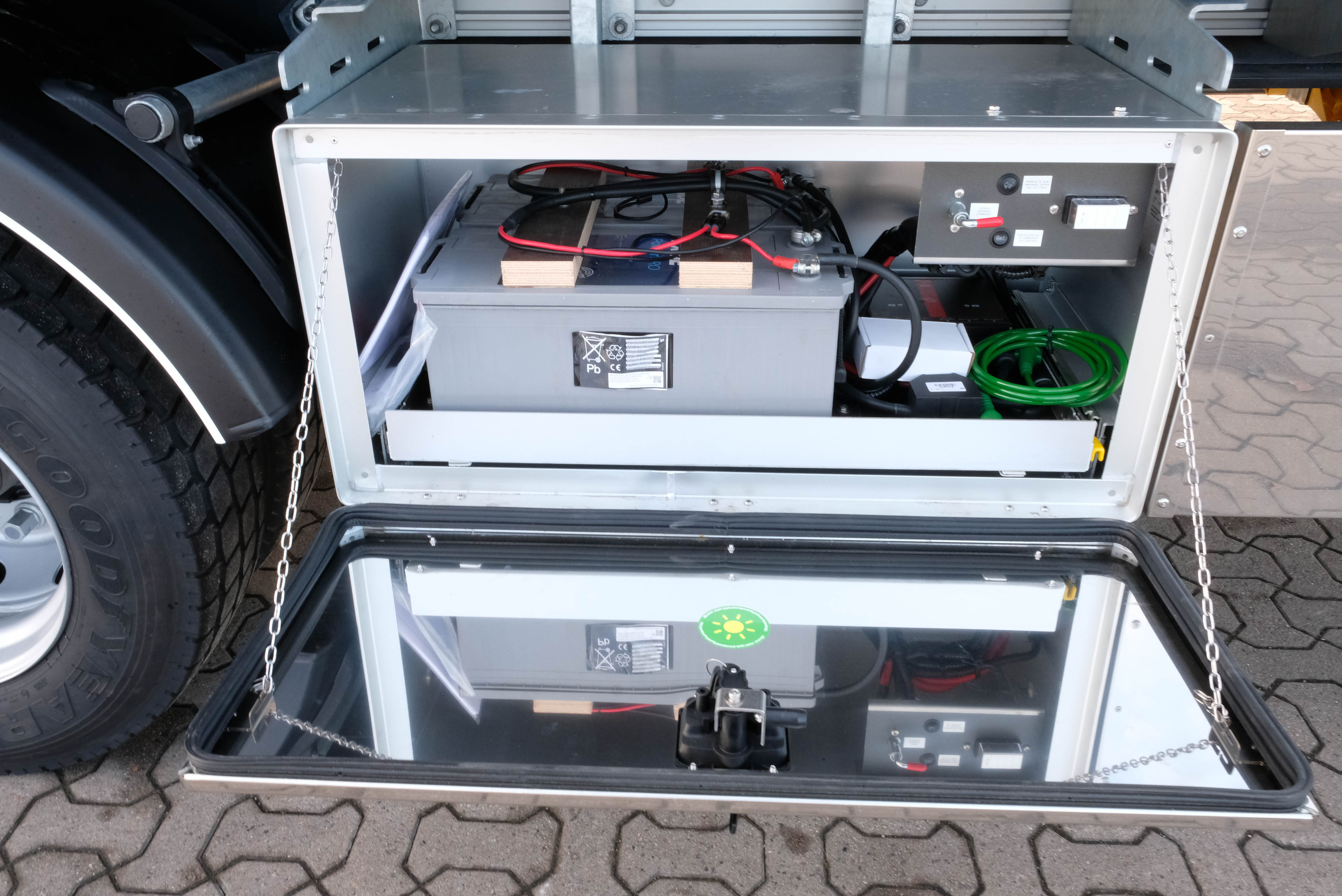 Bagtil finder du en kraftig Zepro lift med en kapacitet på 2.000 kg, som betjenes via fjernbetjening. Traileren har også værktøjskasse, batteristation, surringsrækker og finnergulv.