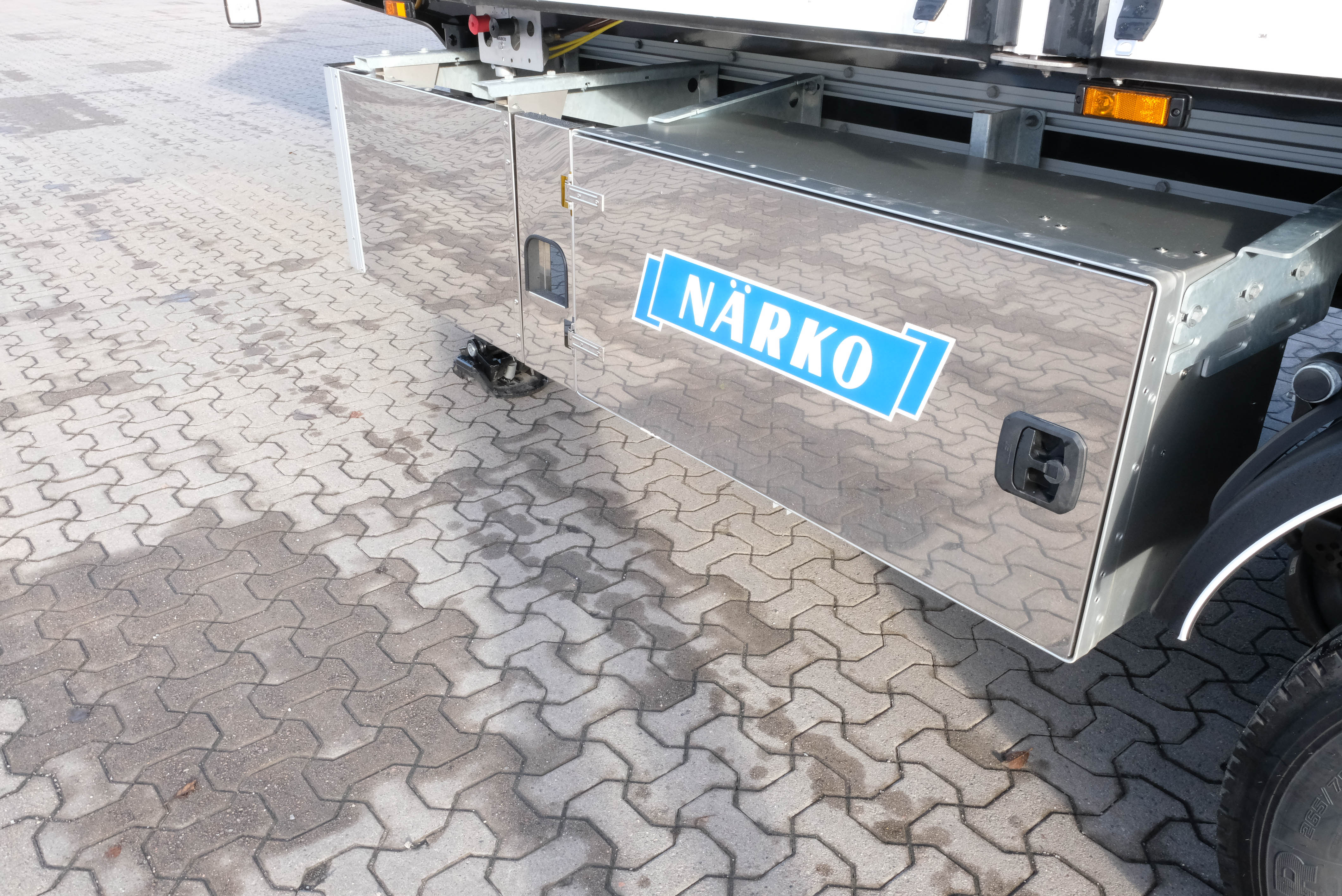 Fabriksny Närko citytrailer. Traileren er udstyret med BPW aksler med skivebremser og Tridec tvangsstyring på aksel 2. Der er løft på aksel 1, en King pin med maks 18.000 kg tryk og akseltryk på op til 20.000 kg.