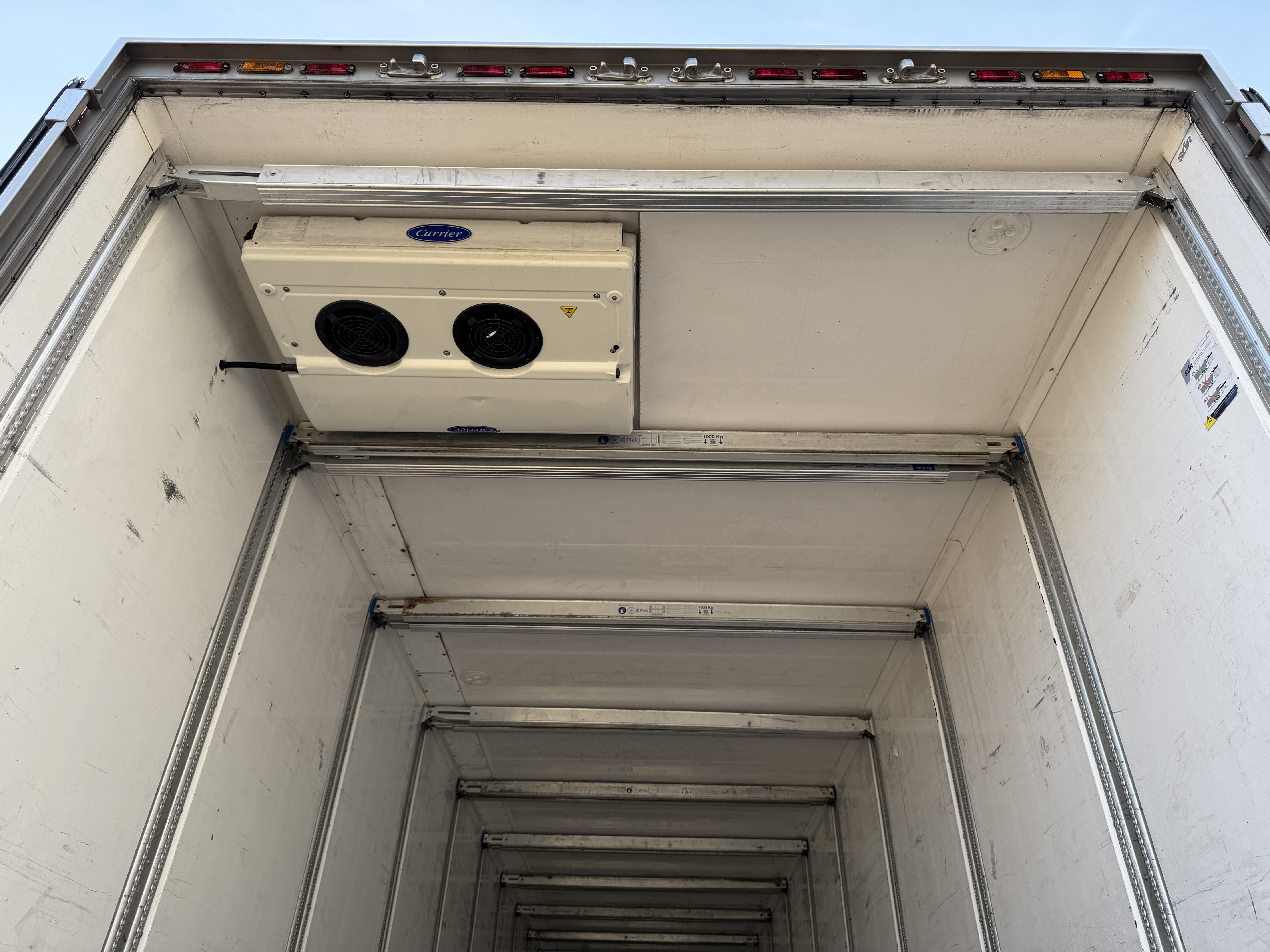 Kølemaskinen er en Carrier 2-temp enhed med et driftstimetal på 9.475 timer på diesel og 1.828 timer på el.