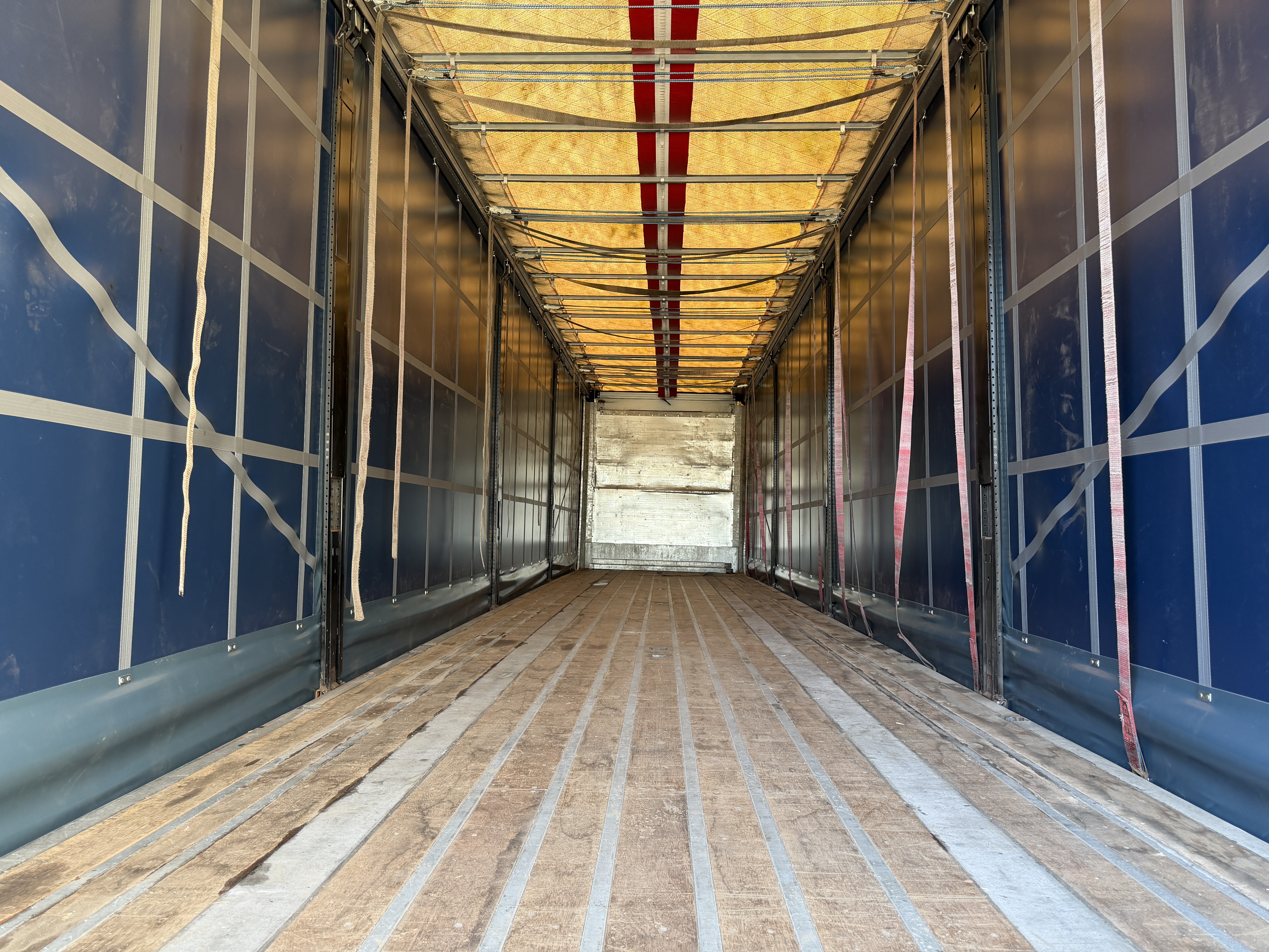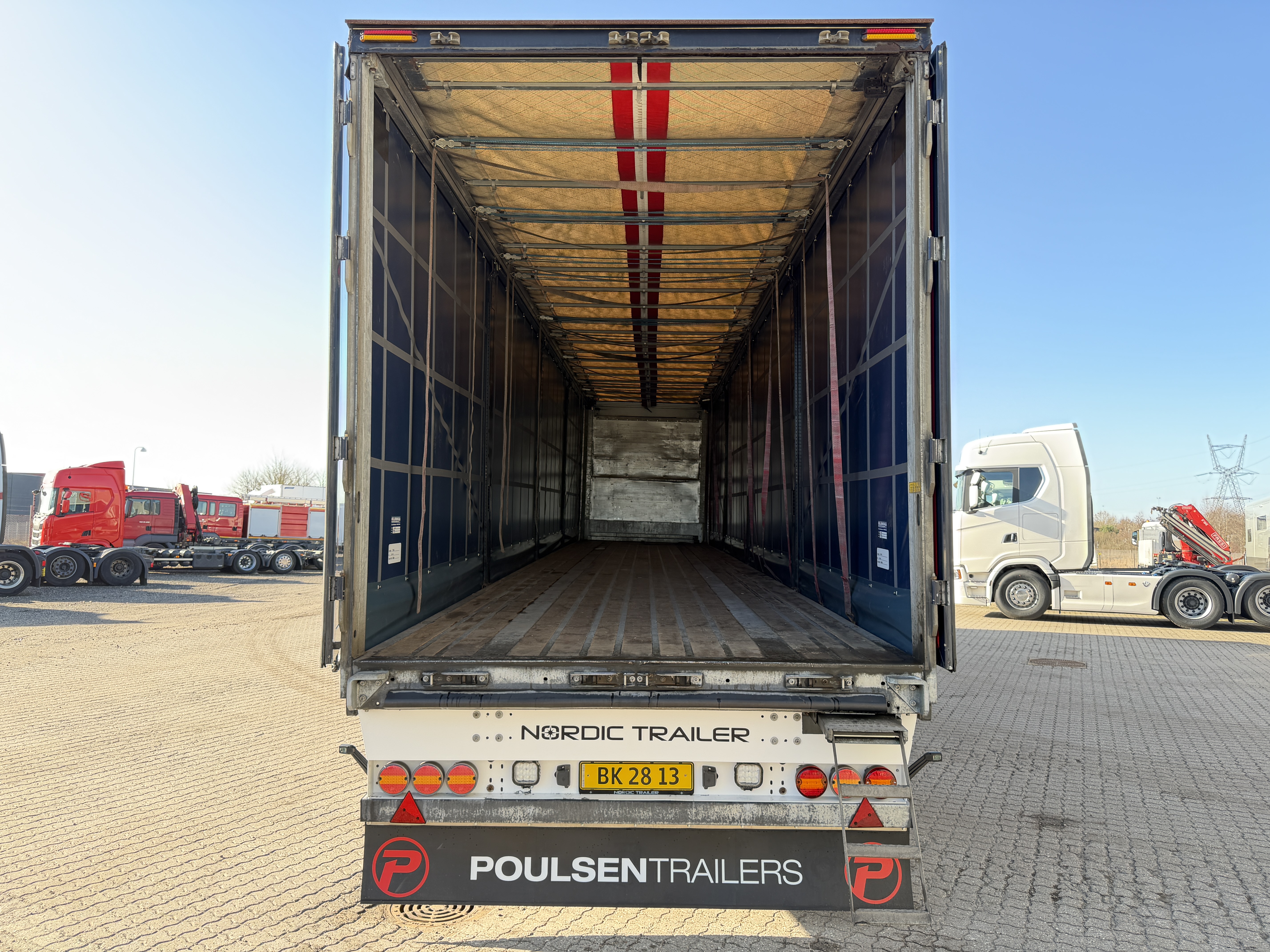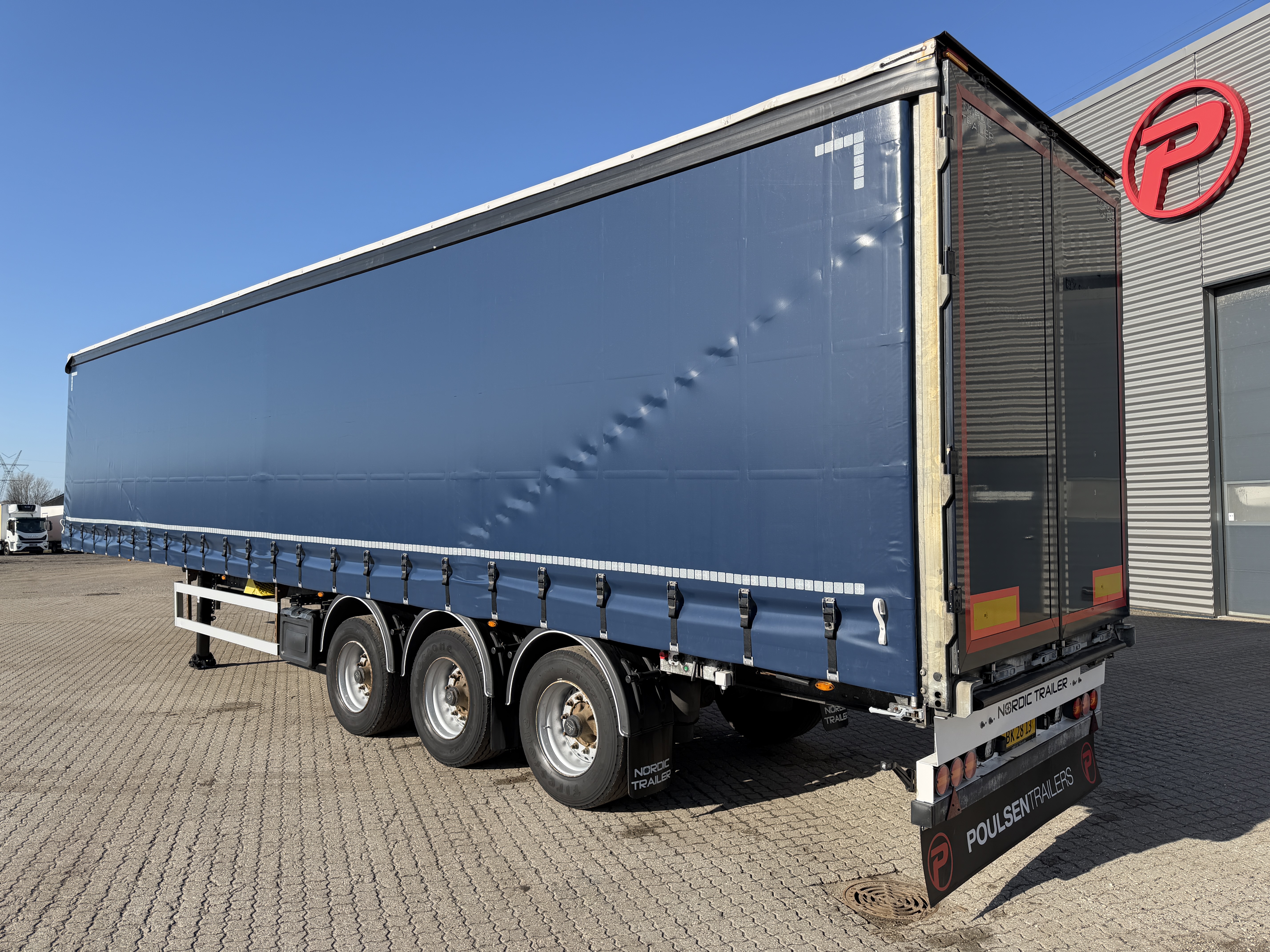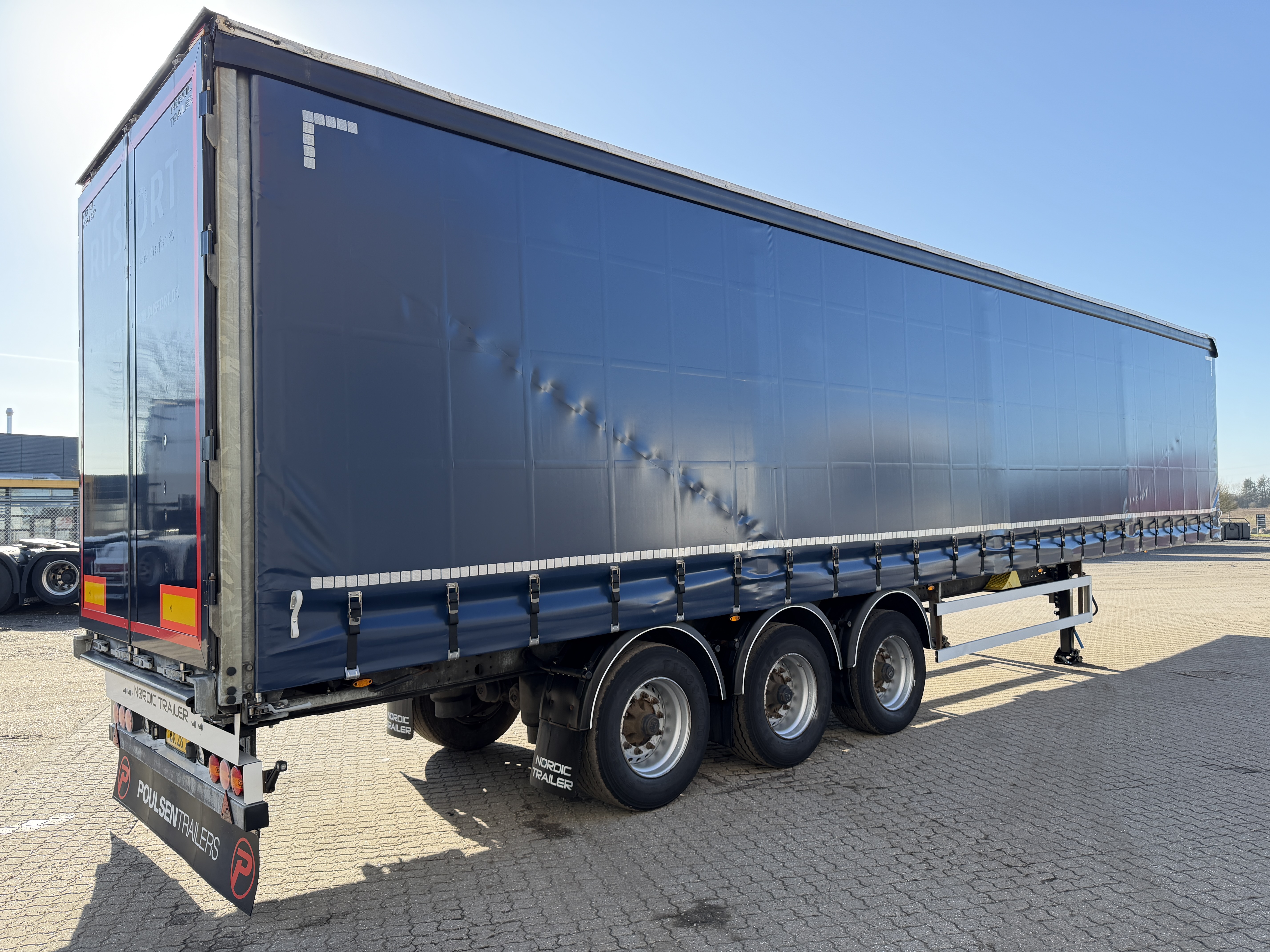 Her tilbydes en NORDIC 3-akslet gardintrailer med hårdttræsbund og lang akselafstand.