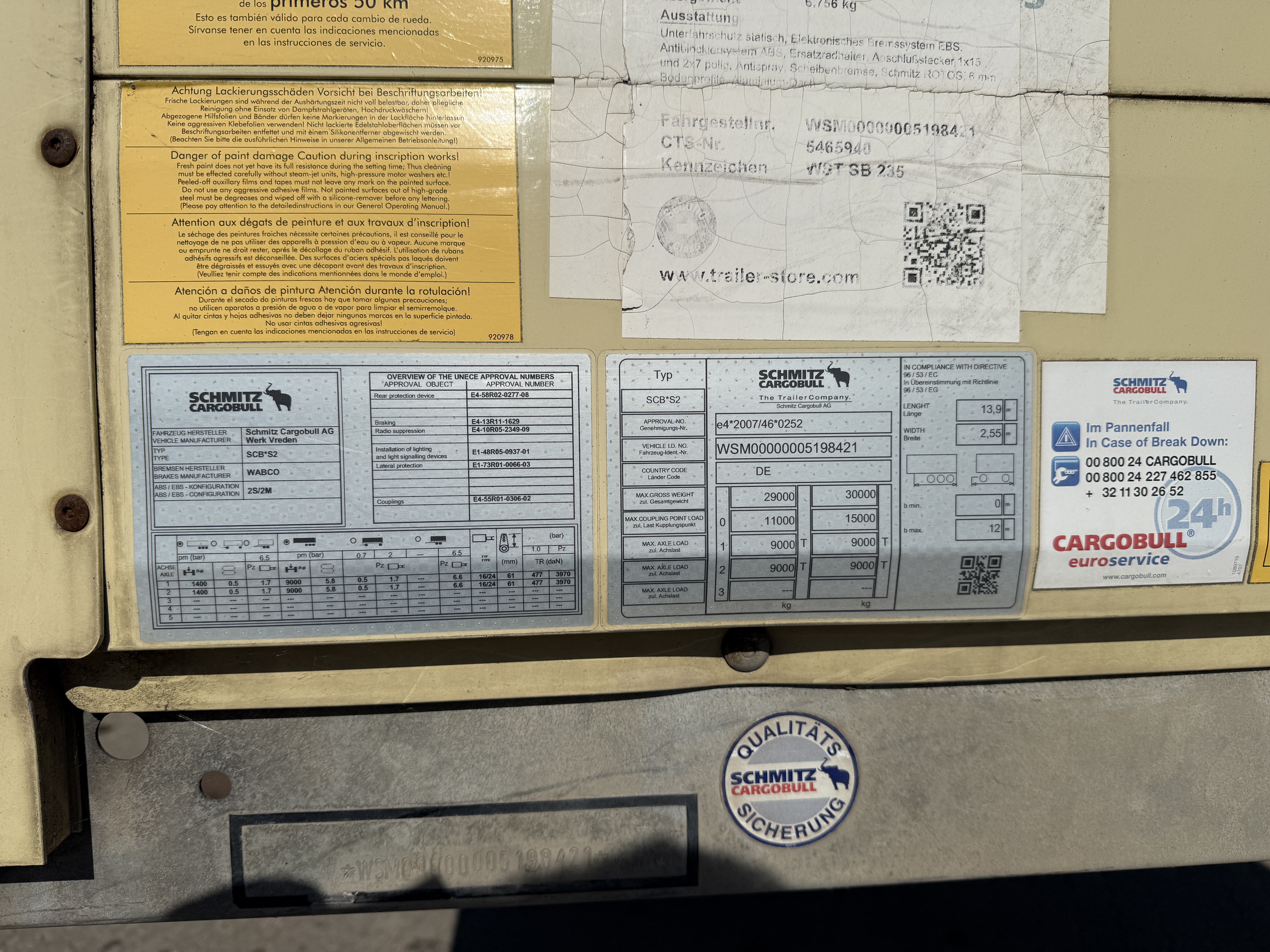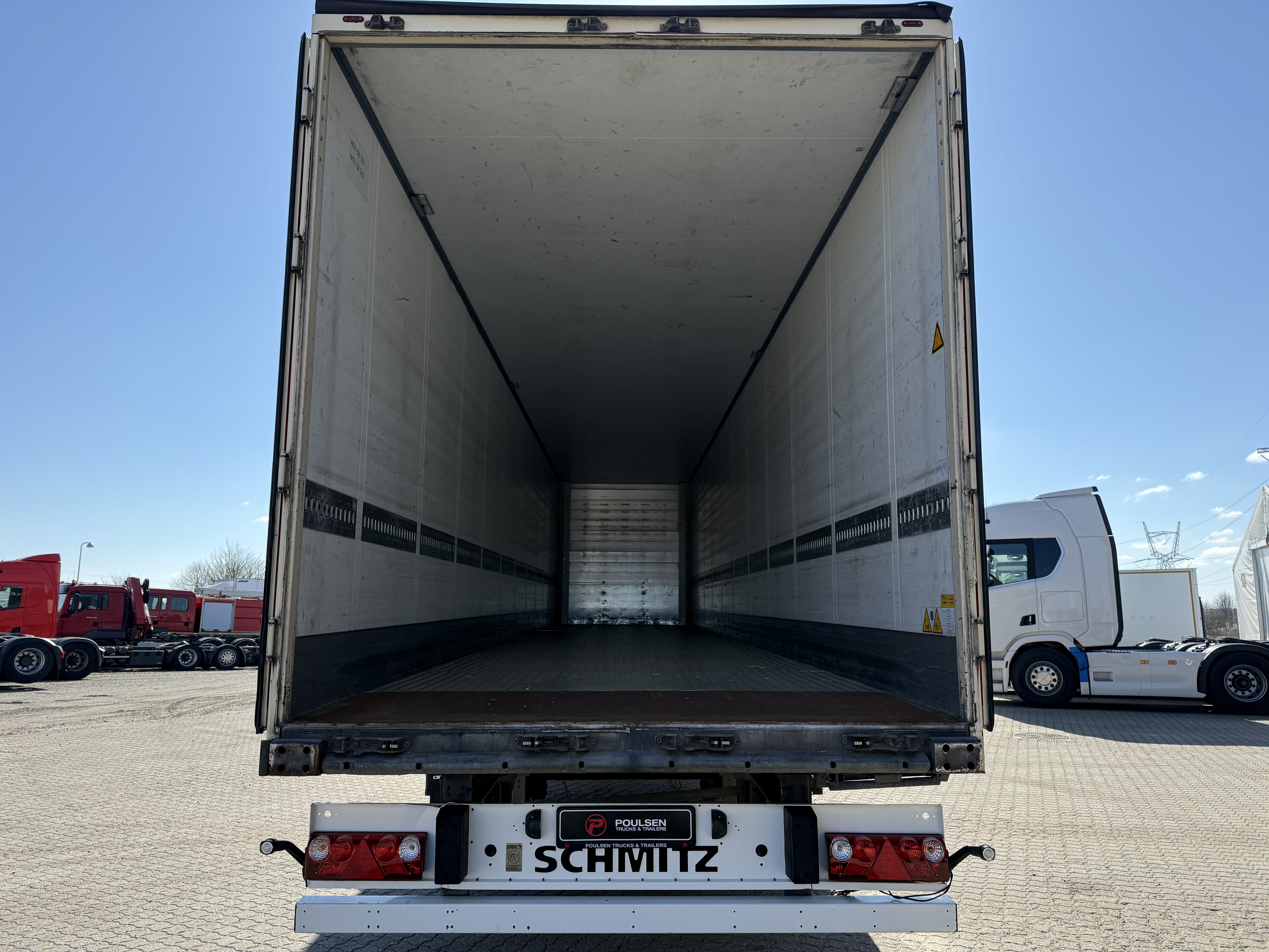 Denne Schmitz 2‑aks bokstrailer fra januar 2018 er en solid og driftssikker løsning til transport af stykgods. Traileren kører på Schmitz‑aksler med skivebremser og har galvaniseret chassis. Den er XL‑godkendt efter EN 12642‑XL. Traileren er udstyret med LED‑arbejdslys samt en langsgående binderække i 800 mm højde. Bunden er udført i alu‑dørk med stålplade i den bagerste del for ekstra slidstyrke ved ind- og udlæsning. Indlæsningshøjden er ca. 2.650 mm, den indvendige bredde er ca. 2.490 mm, og bredden mellem bagstolperne er ca. 2.440 mm.