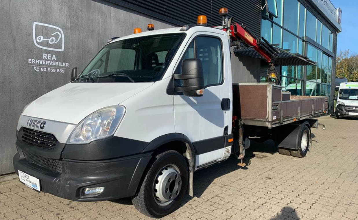 IVECO DAILY 70C17 EEV T7 Tons lastbil med Partikelfilter. HMF kran m/ 3 udskud, 80 cm. grab m/rotator, bag tippelad., fuldaut. klima, motorkabinevarmer, fjernb. c.lås, fartpilot, infocenter, startspærre, udv. temp. måler, sædevarme, el-ruder, el-spejle m/varme, cd/radio, armlæn, kopholder, stofindtræk, tågelygter, airbag, abs, servo, 1 ejer, lev. nysynet, træk, diesel partikel filter bilen har kørt på servicekontrakt så alle service er overholdt.