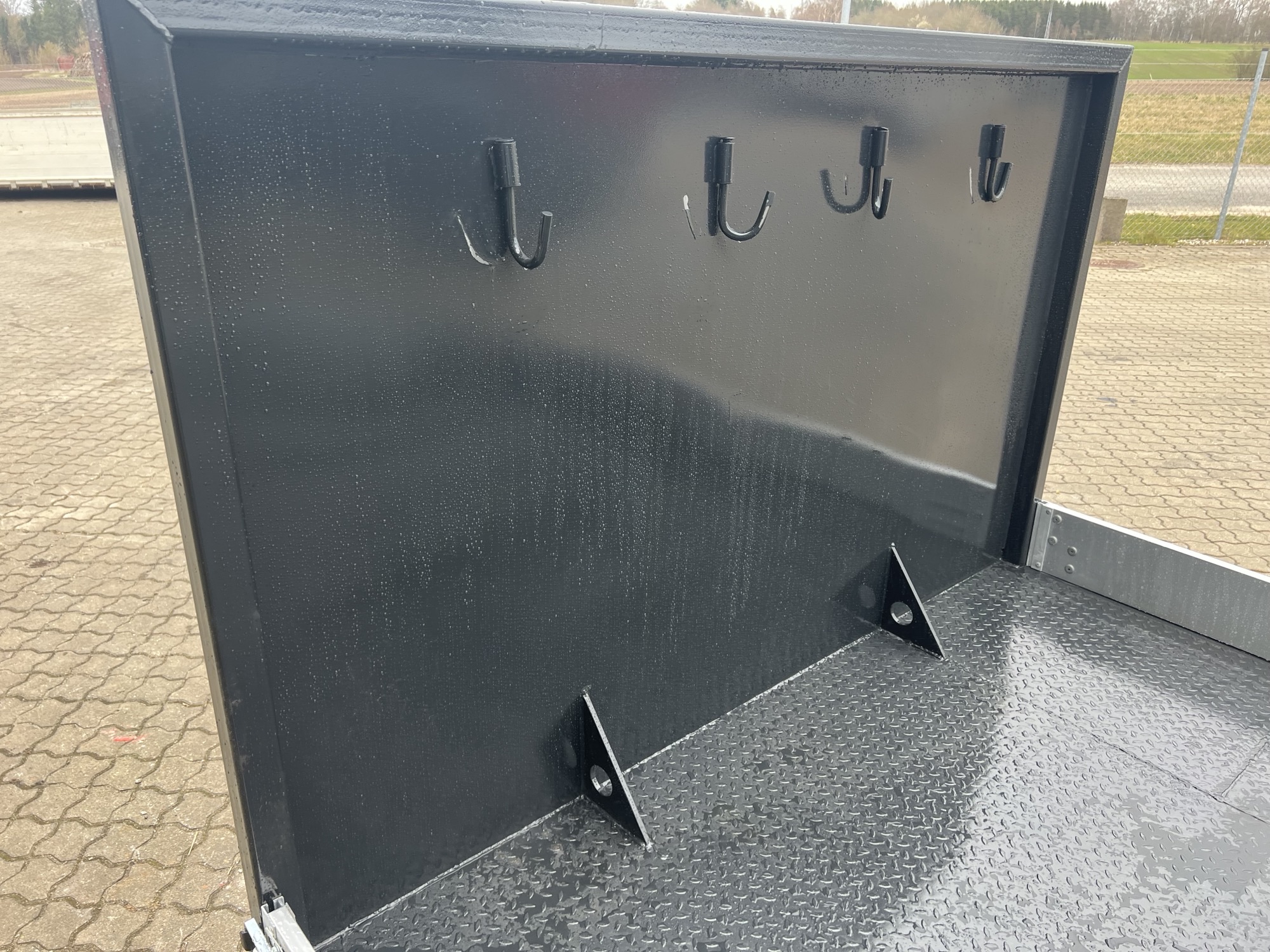 L3760 x H200 x B2140 mm - Nedfældbare alu-sider + bagsmæk - 3mm skridsikker jernbund - Lakeret i RAL 7021 - Kroge til kæder + stropper i forvæg - Optræk til lav krog (900 mm) + wirehejs.