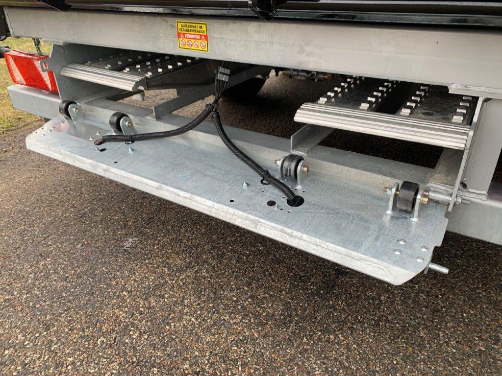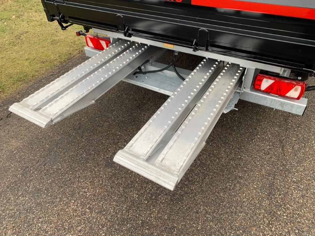 Ladbunden er opbygget af stål, 450 mm aftagelige stålsider + stål bagklap. Fronten er boltmonteret og kan også afmonteres hvis det ønskes. Siderne er udstyret med fjeder-træk som ses på fronten gør det enkelt for en person, at åbne og lukke siderne uden besvær - tilhørende 2 stk. løse 8.000kg (par) 3.000 x 360mm alu-ramper opbevaret i magasin mellem chassisvangerne - trækkes ud bagerst på kærren - 1.750mm lang trækstang med 57mm trækøje med en koblings længde på 7150mm - Trækstangen er højdejusterbar fra 750 til 1050mm - læssehøjde 960mm - Kærren er udstyret med BPW aksler med tromlebremser på parabel fjedre - Galvaniseret chassis og bestilt med RAL 9005 Tiefschwarz sort lakeret lad sider, kan også leveres i ønsket RAL farve ved bestilling