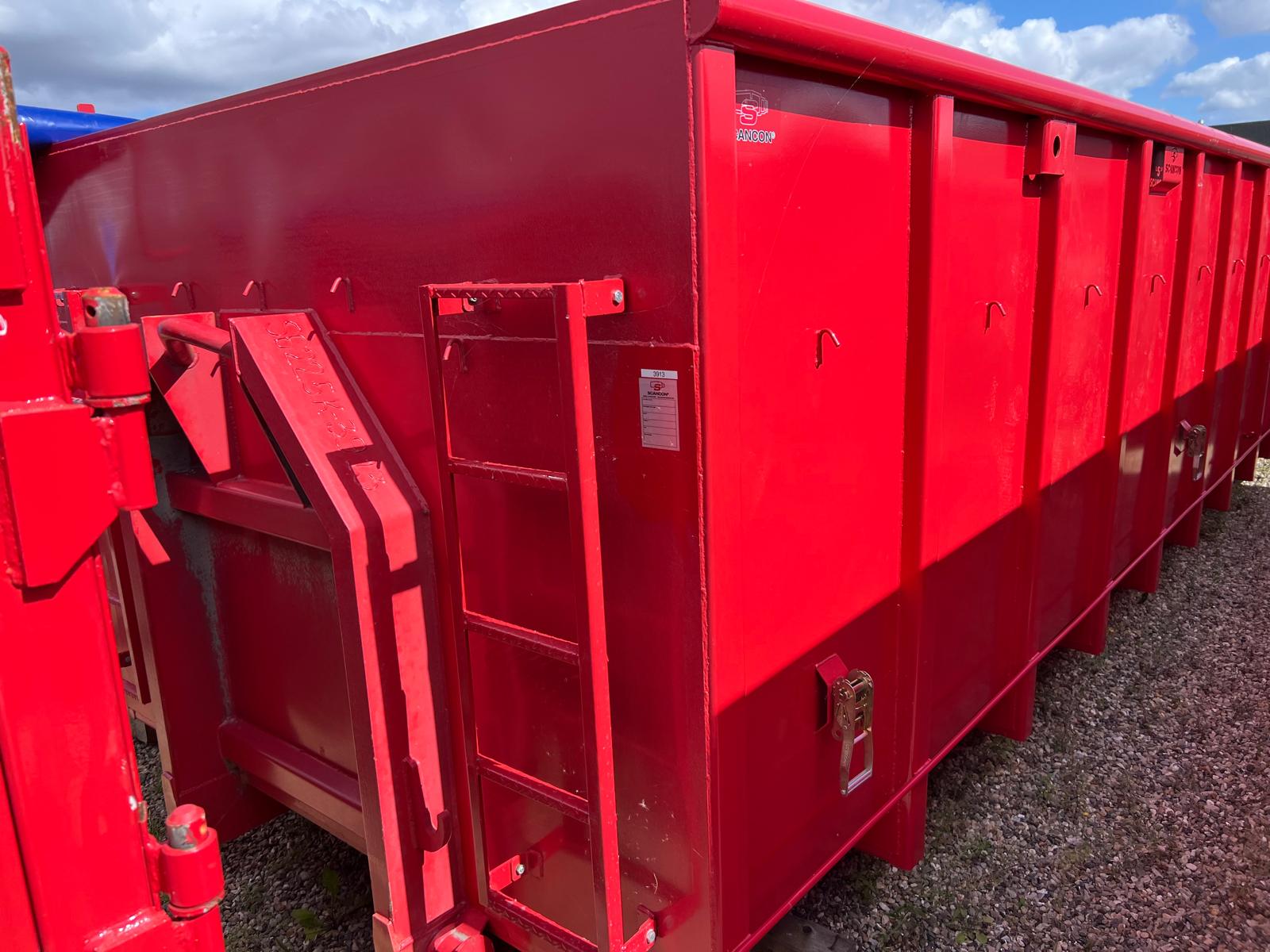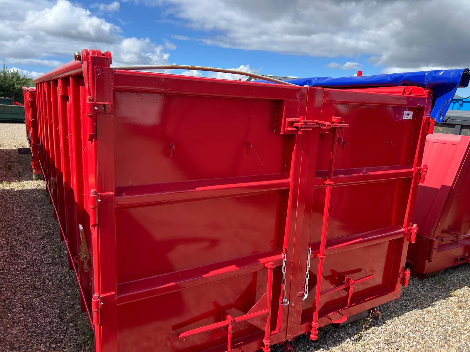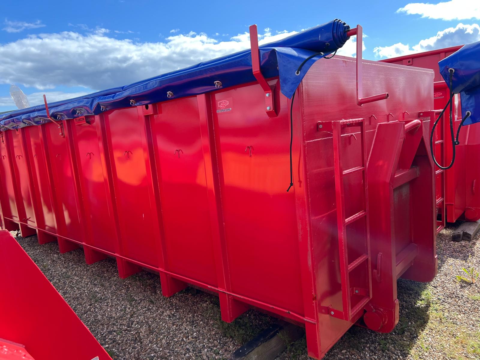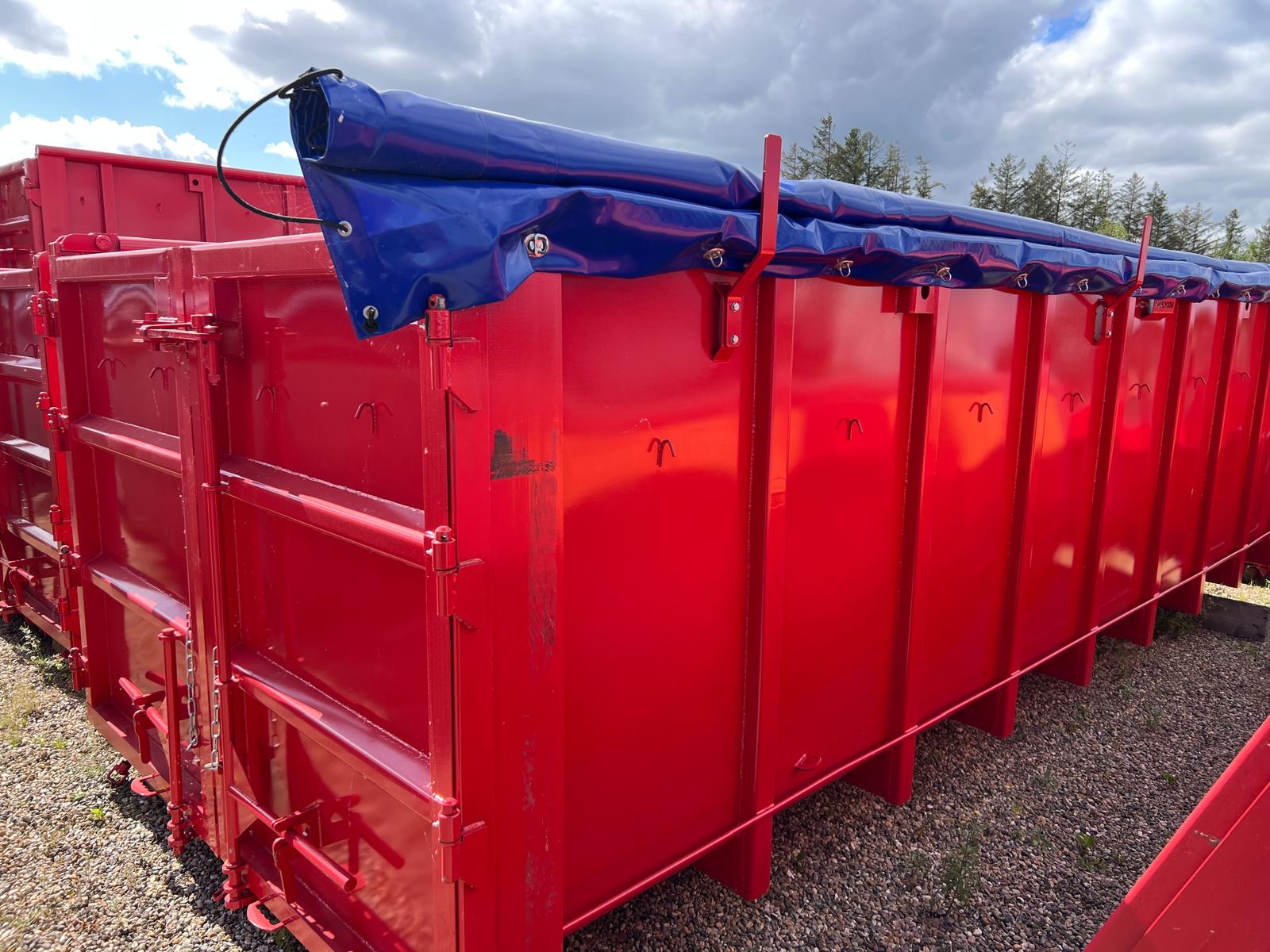 Denne container er efter monteret med mørkeblå rulle presenning