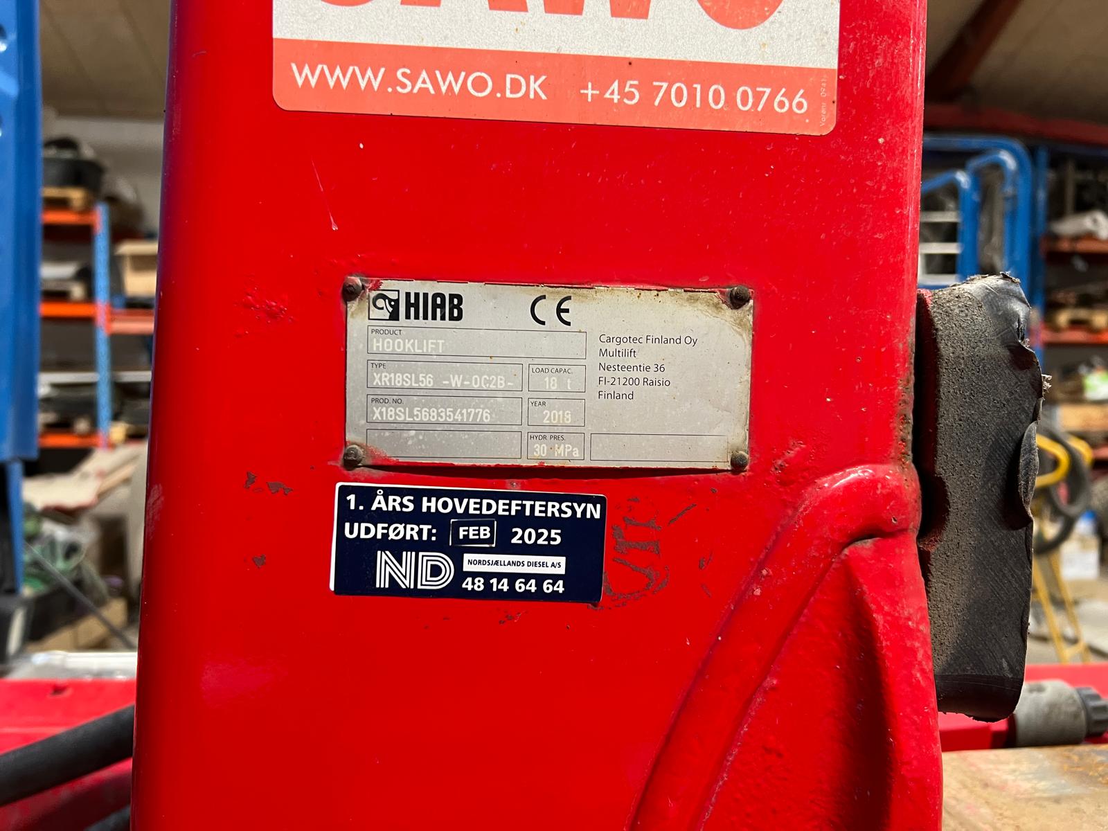 HIAB XR18SL56 kroghejs 18 ton med centralsmøring - mål på hejset: fra centrum krog til bagkant kofanger 5800 mm krogarm kan køres ca. 1000 mm frem. Containerlængde max 6500 mm UDEN brug af udtrækskofanger. - højde på op til container ruller 1200 mm - mulighed for at øge længden med udhæng + 800 mm ved brug af udskuds kofanger således den kan køre med ca. 7200 mm containere - værktøjskasse.