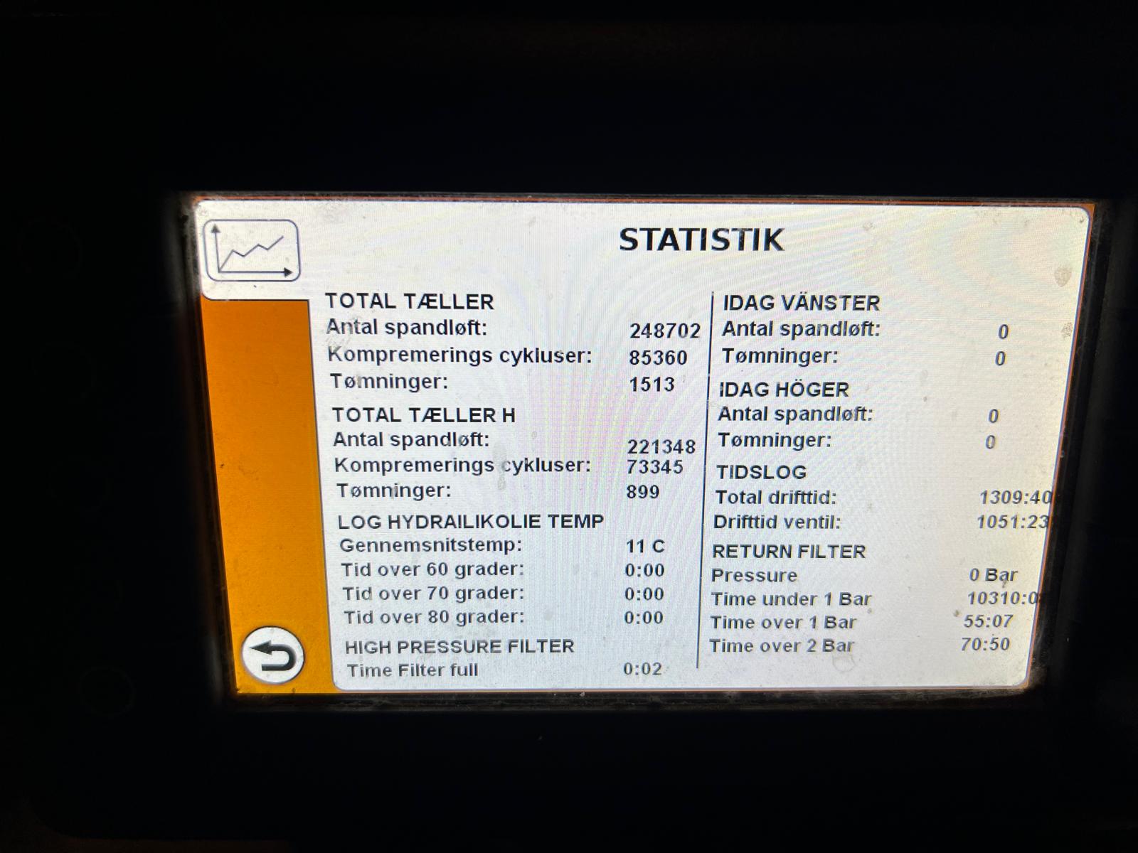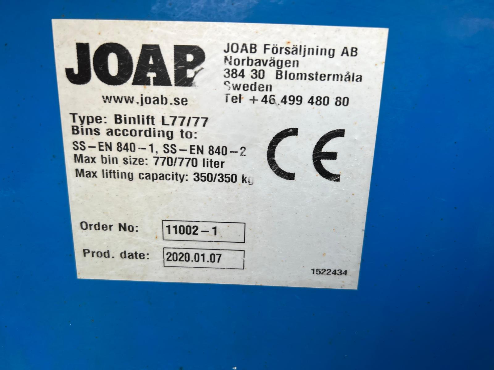 JOAB model Ancona Twin Binlift L 77/77 / Zoeller Ekopres med 2 kammer 70/30 ruminddeling 13,9 m3 til dagrenovations anlæg år 2020 - arbejdes timer iht. computer 1309 - total timer 1.051 driftstimer