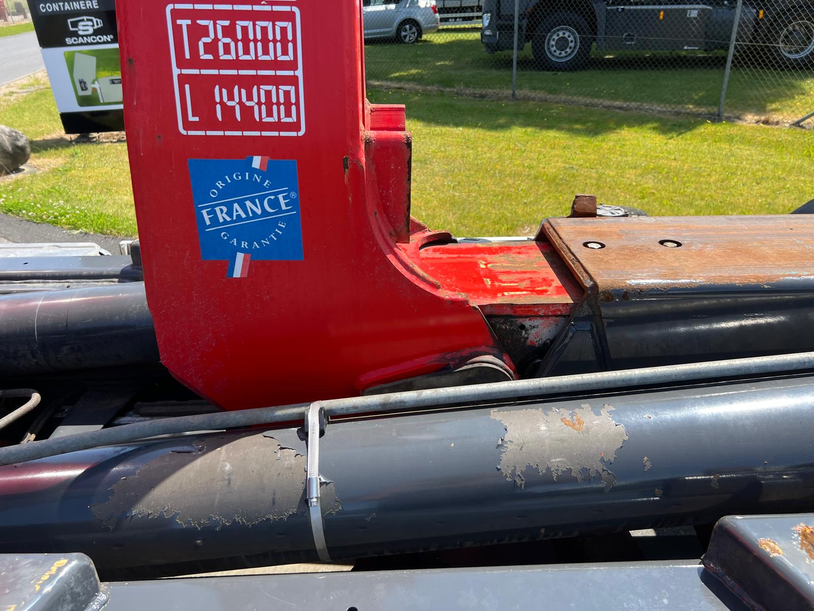 Container mål på hejset : fra centrum krog til bagkant kofanger 4350 mm krogarm kan køres ca. 1000 mm frem og kan køre med max 6500 mm container - højde på op til container ruller 1250 mm - mulighed for at øge længden med udhæng + 500 mm ved brug af udskuds kofanger således den kan køre med ca. 7050 mm containere - værktøjskasse