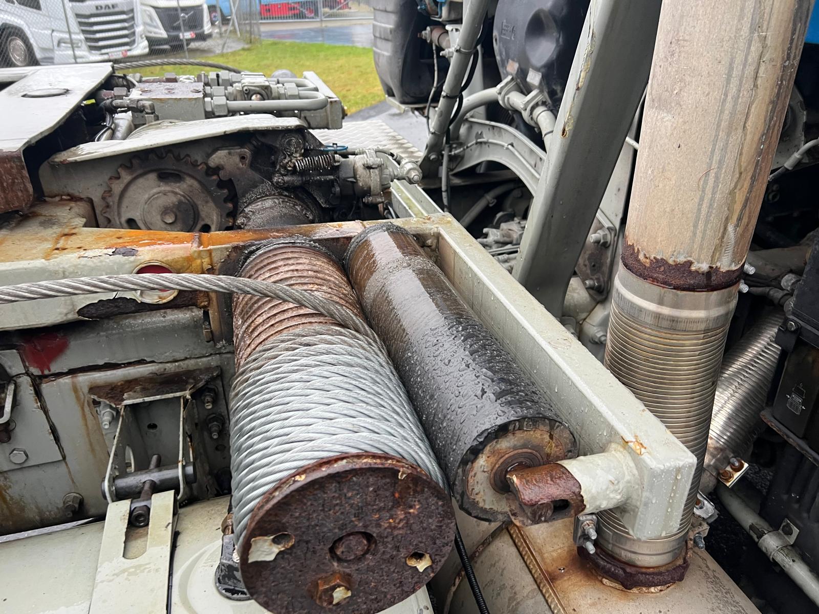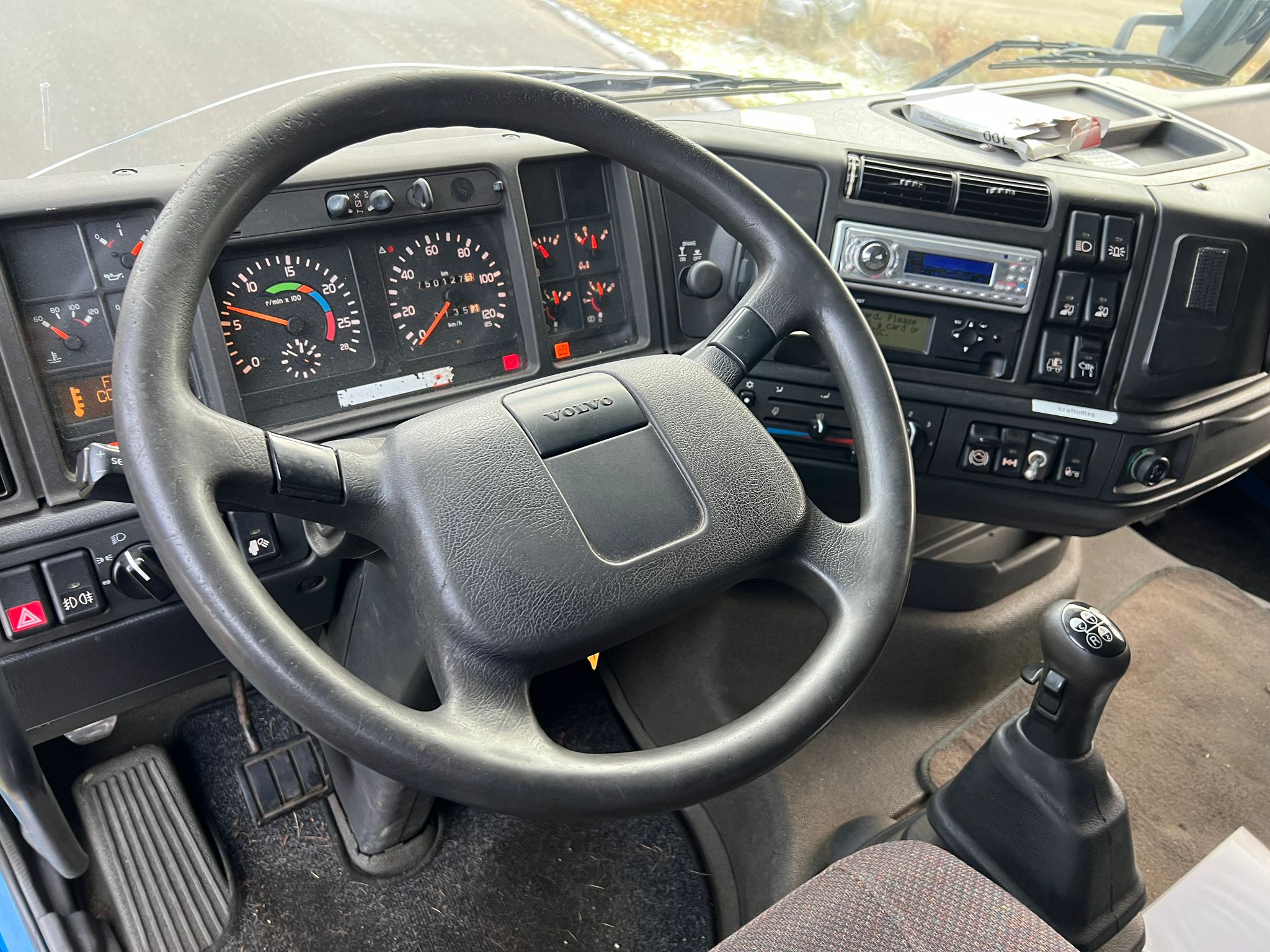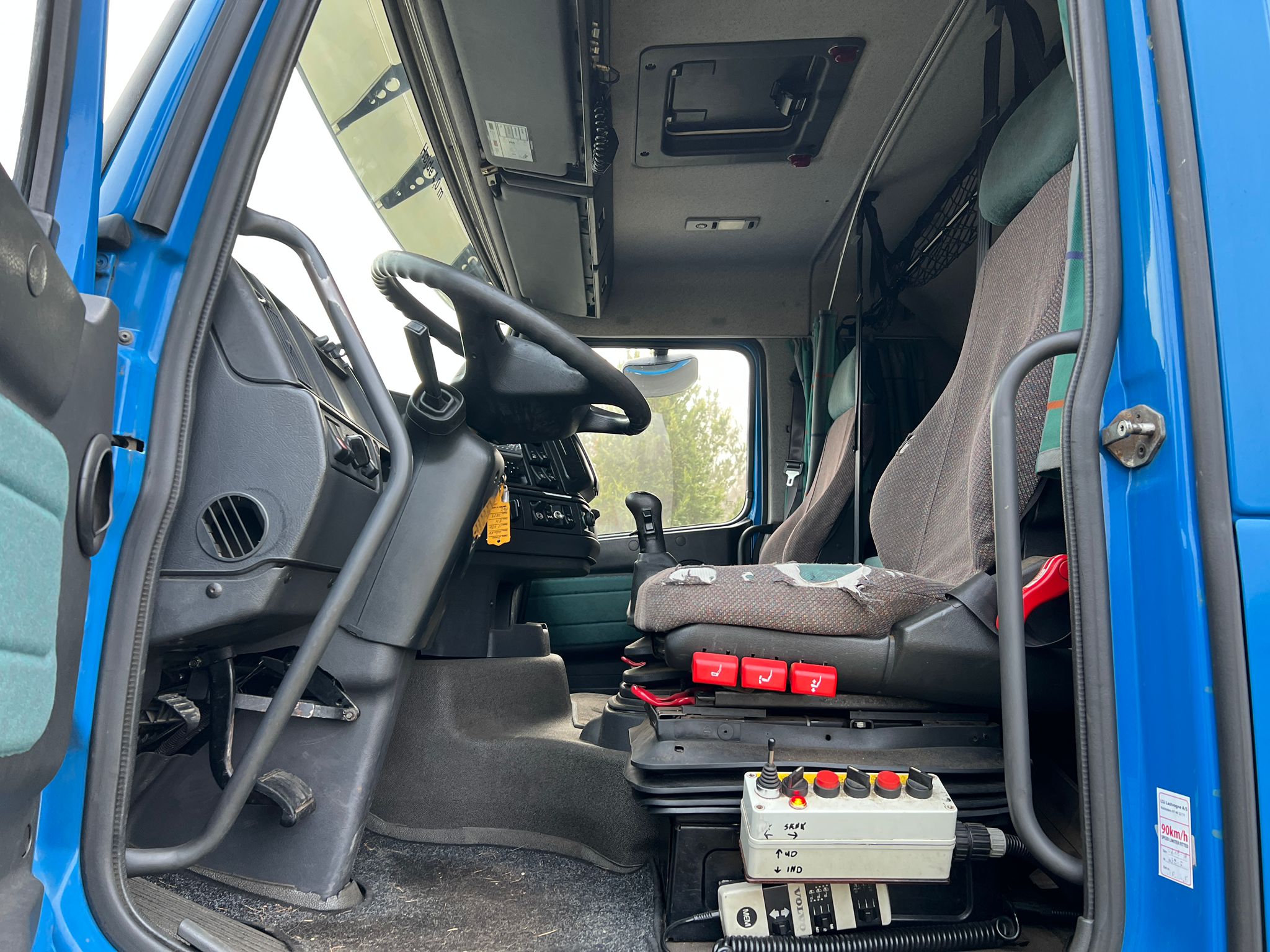 Volvo FH12-420HK 6x2 med Wirehejs, fuld luftaffjedring, manuel gear 12 trin med range og split, gl. type fartskriver, udstyret med pedaler i højre side til øvelseskørsel.