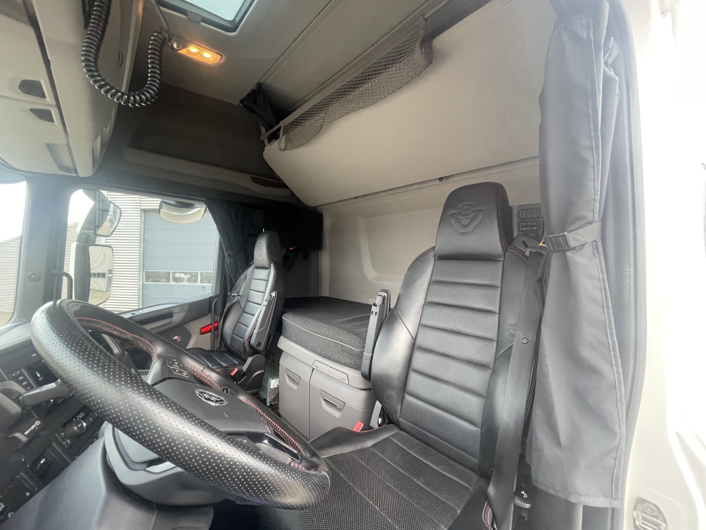 CS20H førerhus - 2 køjer - Navigation - Køleskab - Adaptiv fartpilot - Spor assistent - Last indikator - Automatisk klimaanlæg - Læder sæder - Førersæde med varme og ventilation - SAT Nordic lys skilt - Scania aircooler - lygtebjælke bag tagspoiler på førerhus med bliz og andre lygter - 24/220 volt inverter - mikrobølge ovn - bak kamera - TV