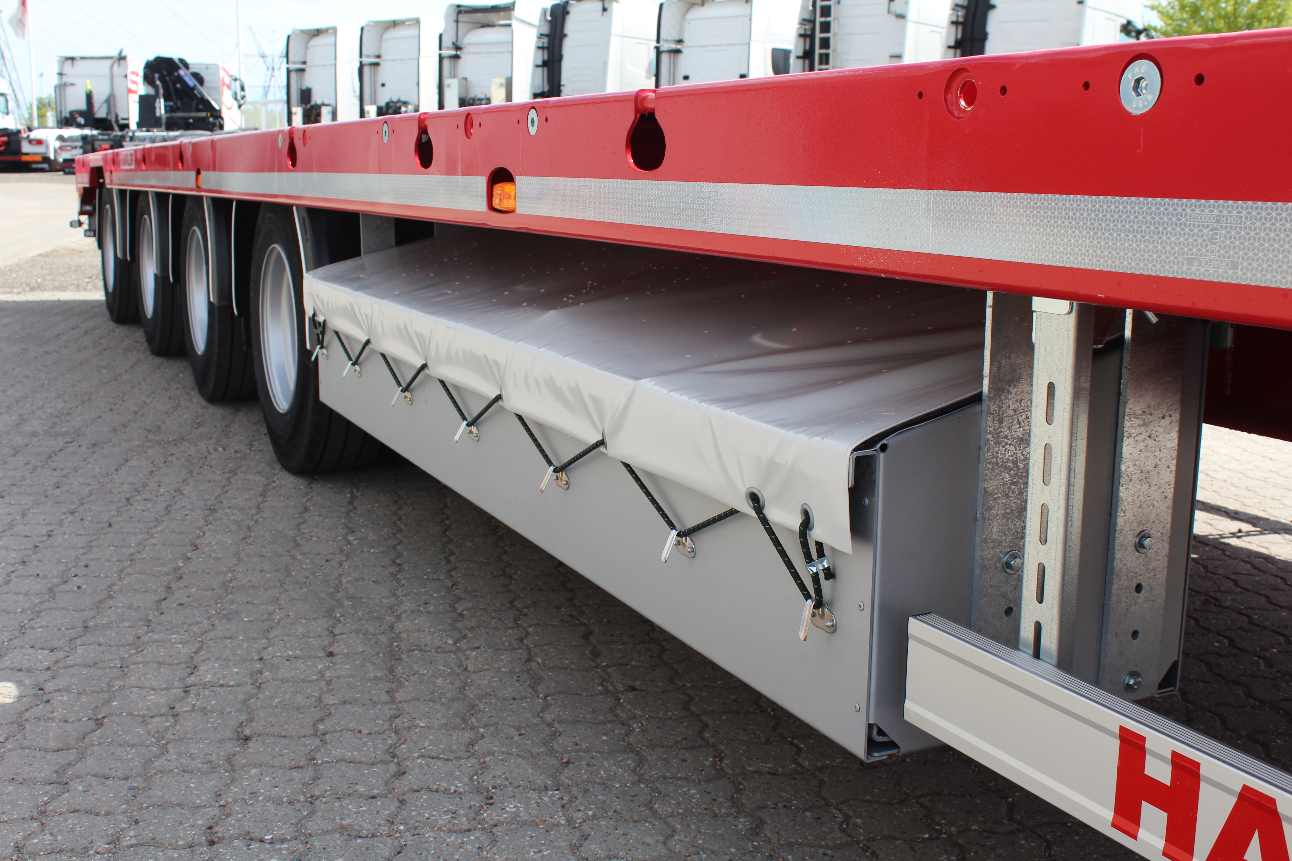 4 stk. 5 tons surringsøjer forrest på svanehals + 10 tons surringsøjer fordelt langs kantskinnerne, 3 rækker med 9 stk. kæpstokke huller - Mulighed for tilkøb af 5 tons surringsøjer til montering i kæpstokke huller