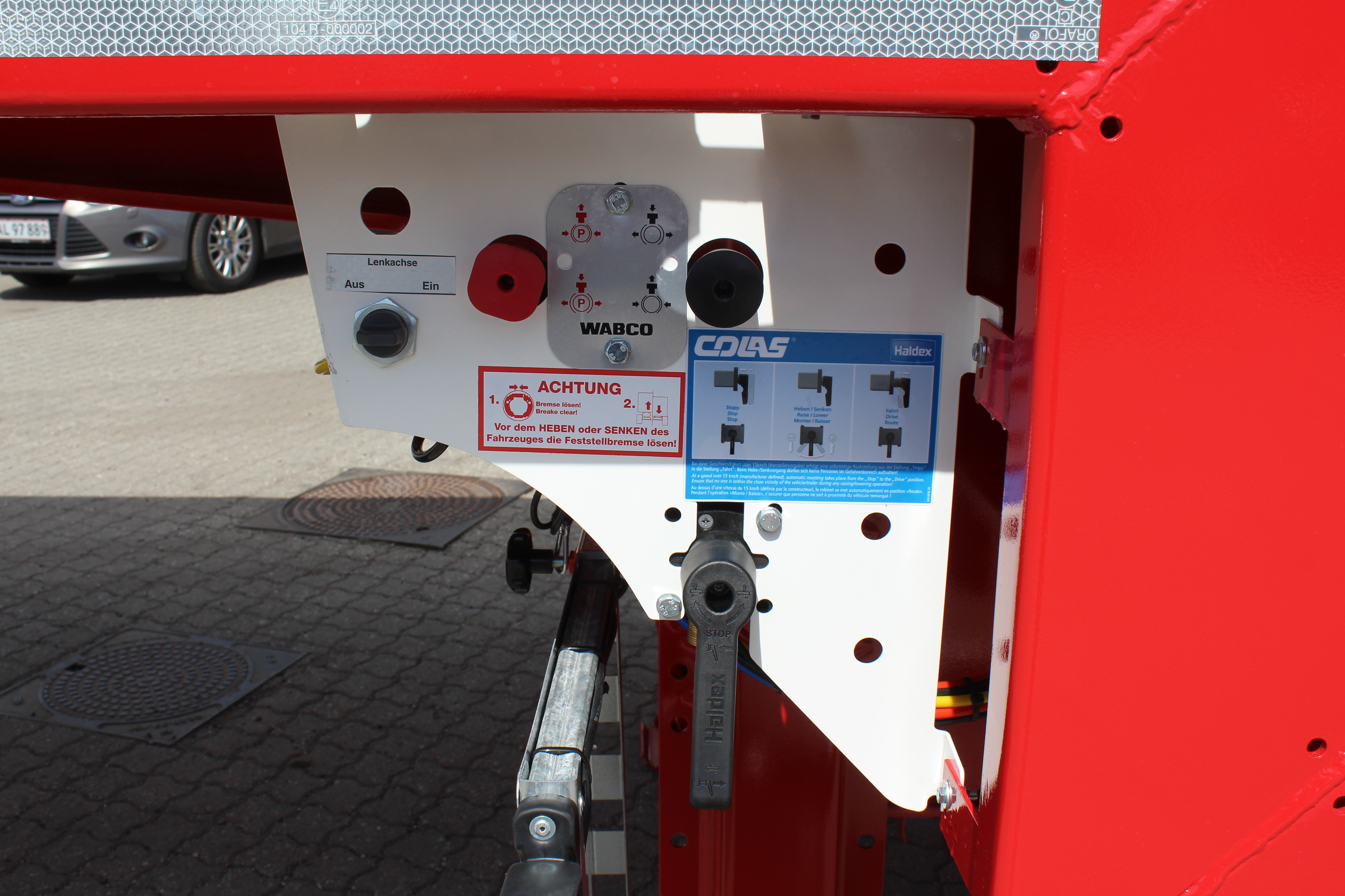 BPW 11-tons luftaffjedret aksler med tromlebremser, akselløft på 1. aksel, og styrende 3. og 4. aksel
