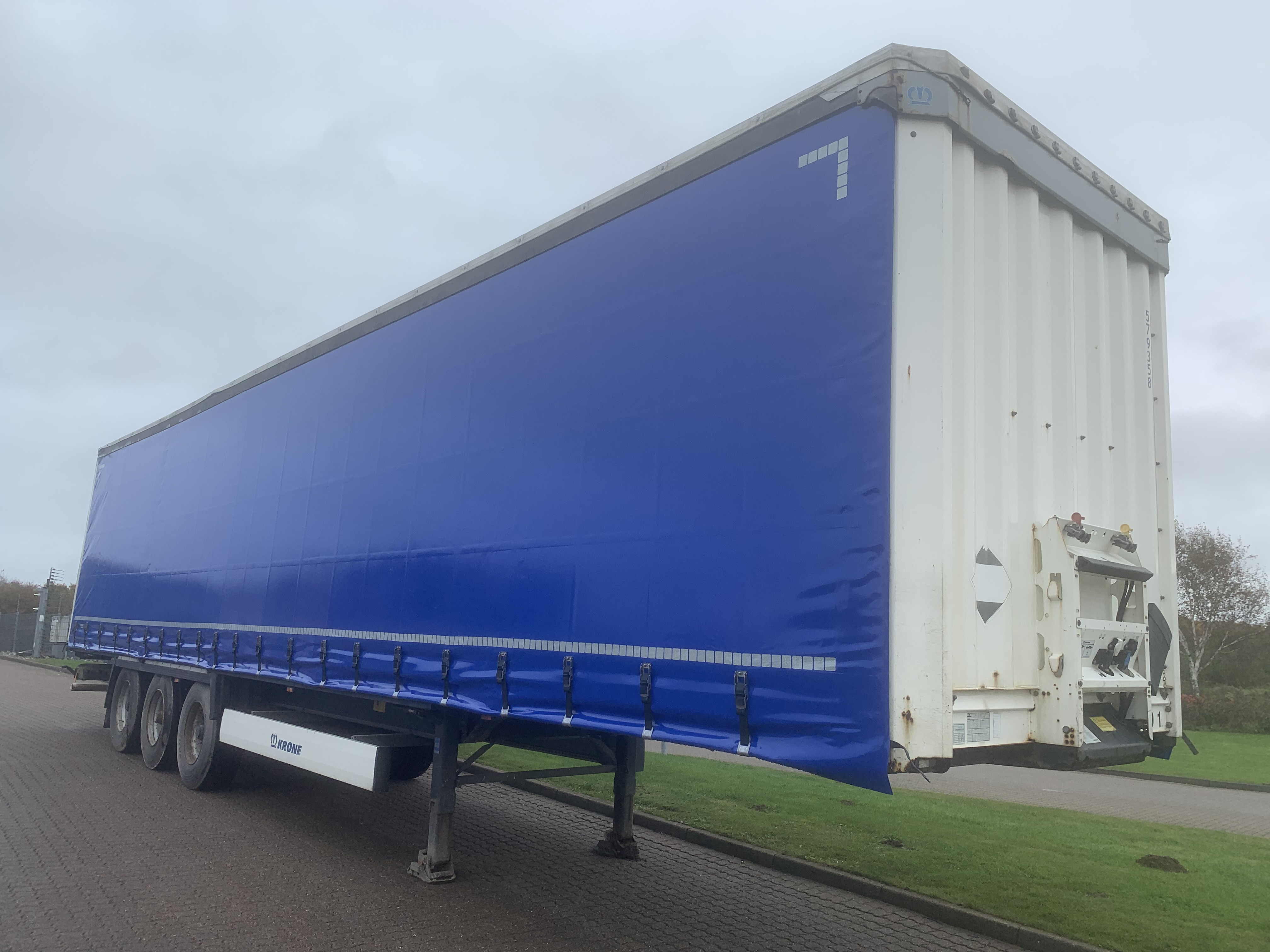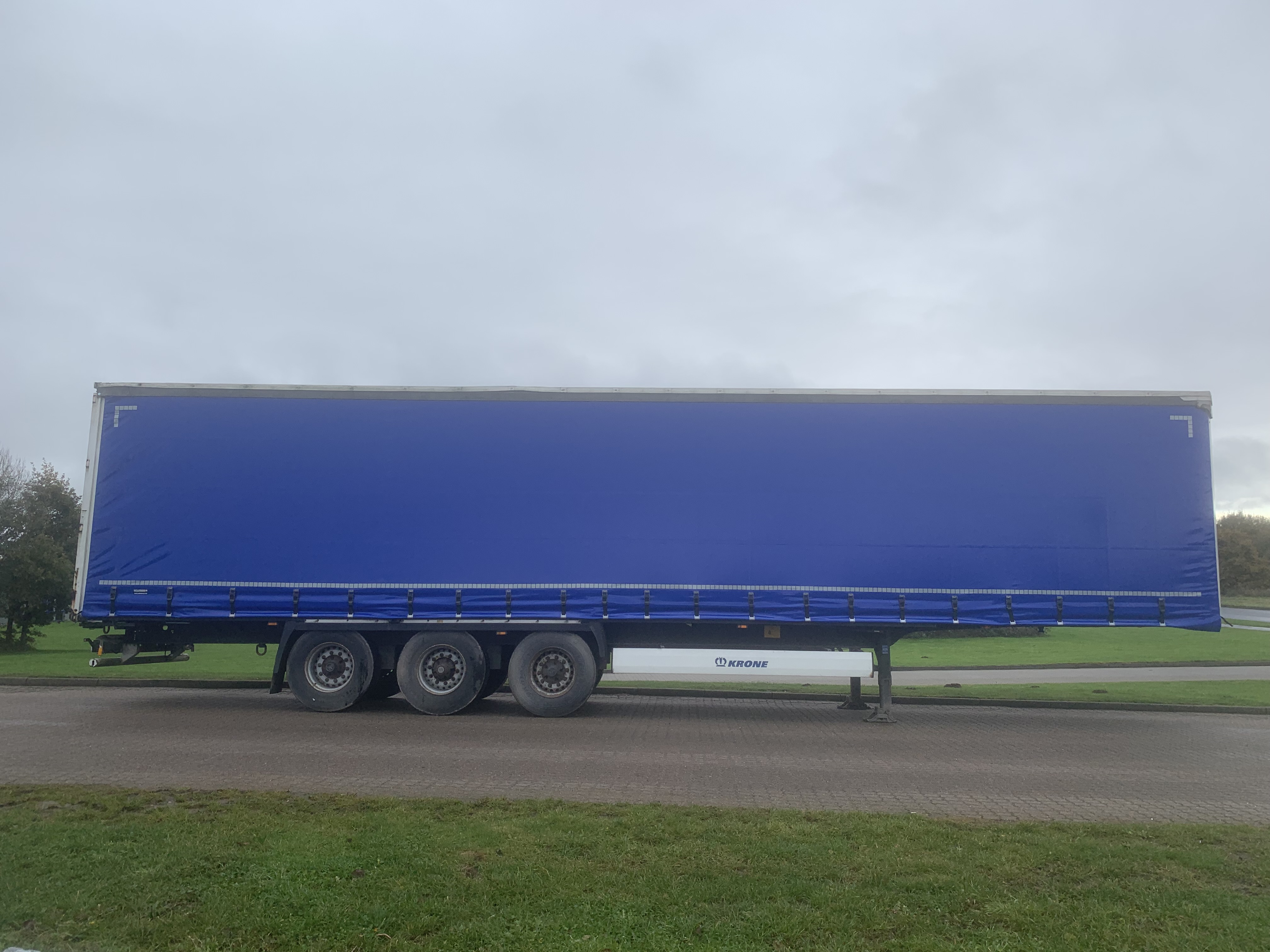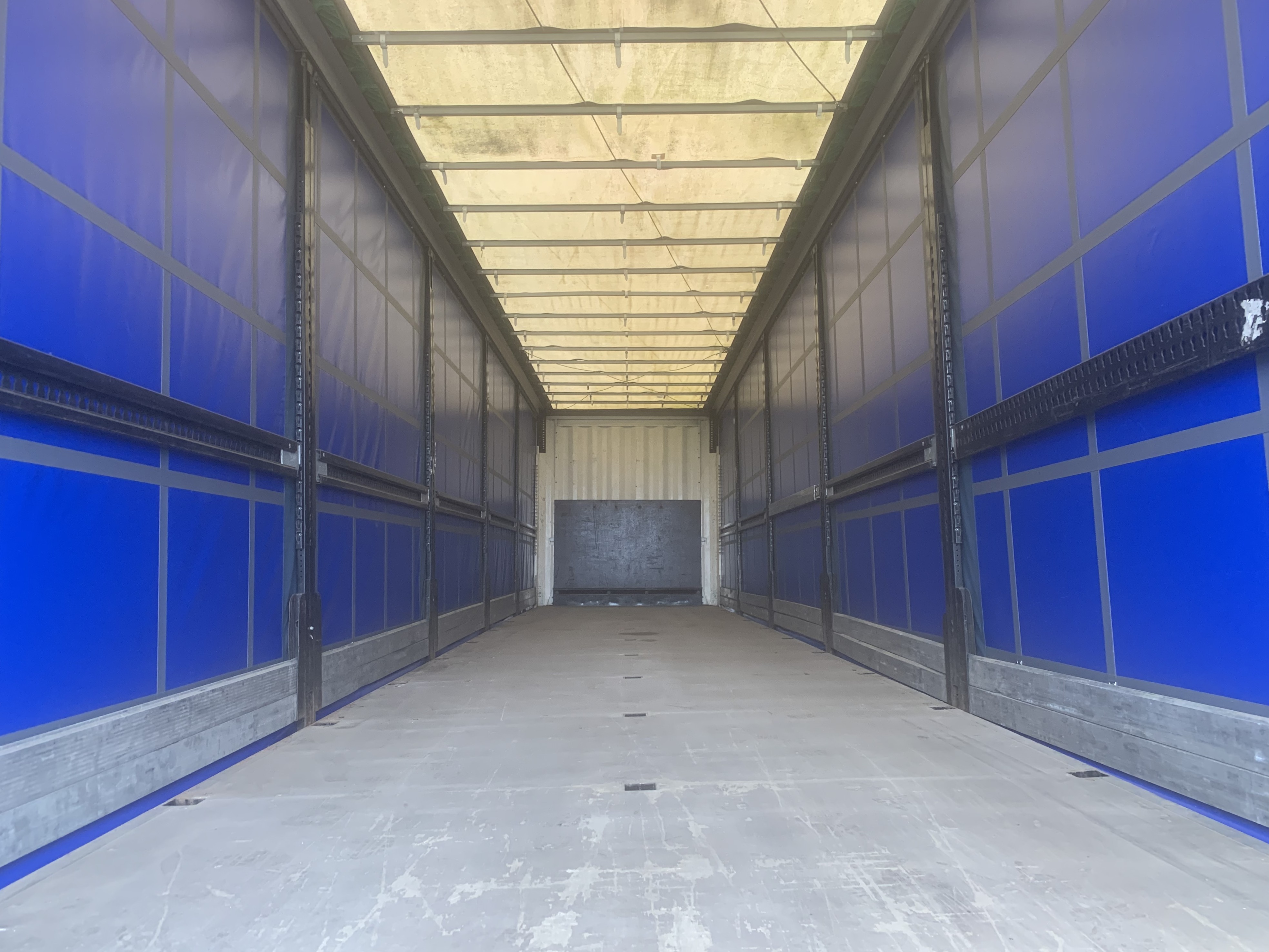 Pæn 3 akslet gardin trailer , med dobbeltdæk sidestolper , tværsgående dæk medfølger ikke, nye blå presenninger