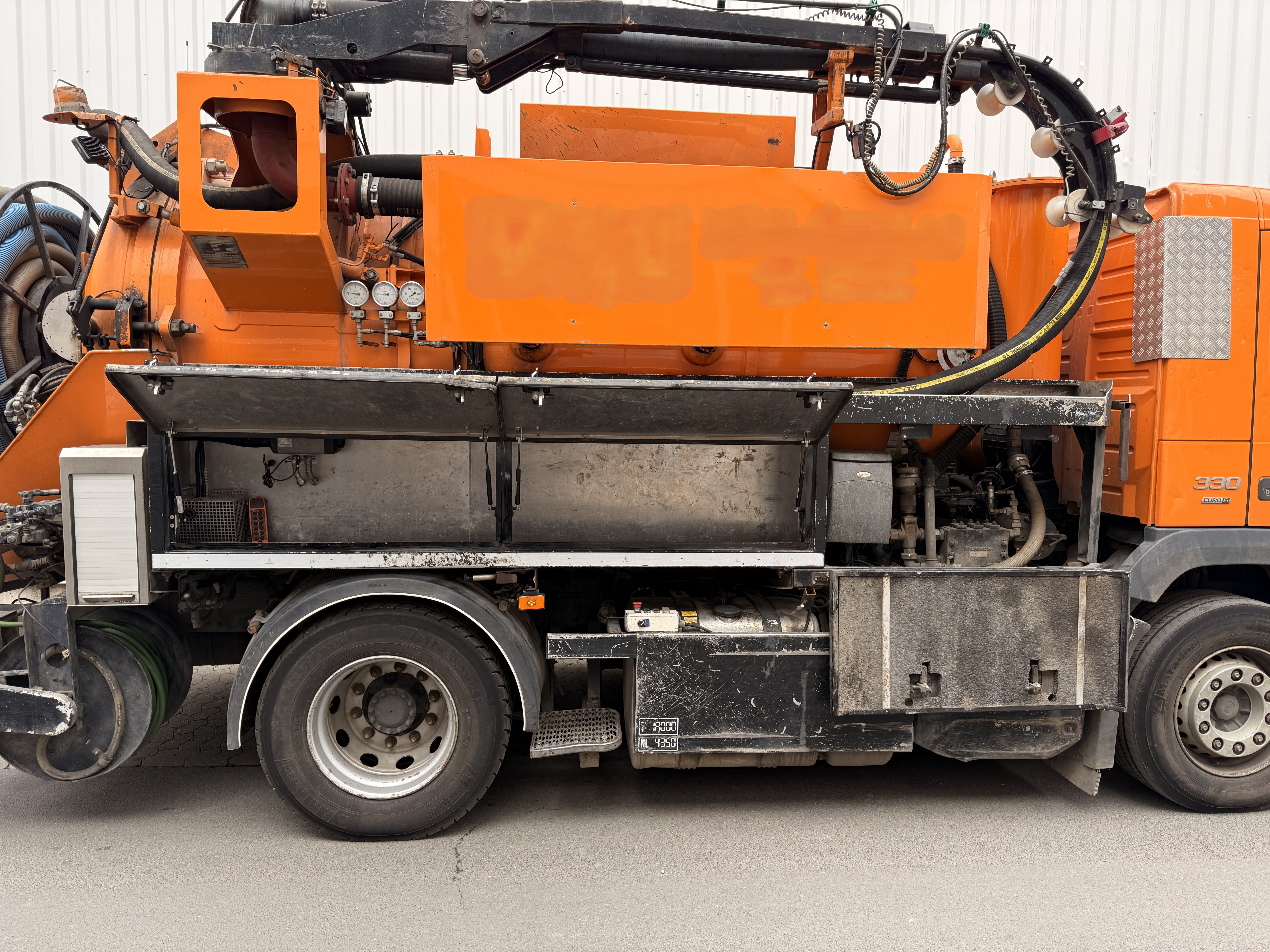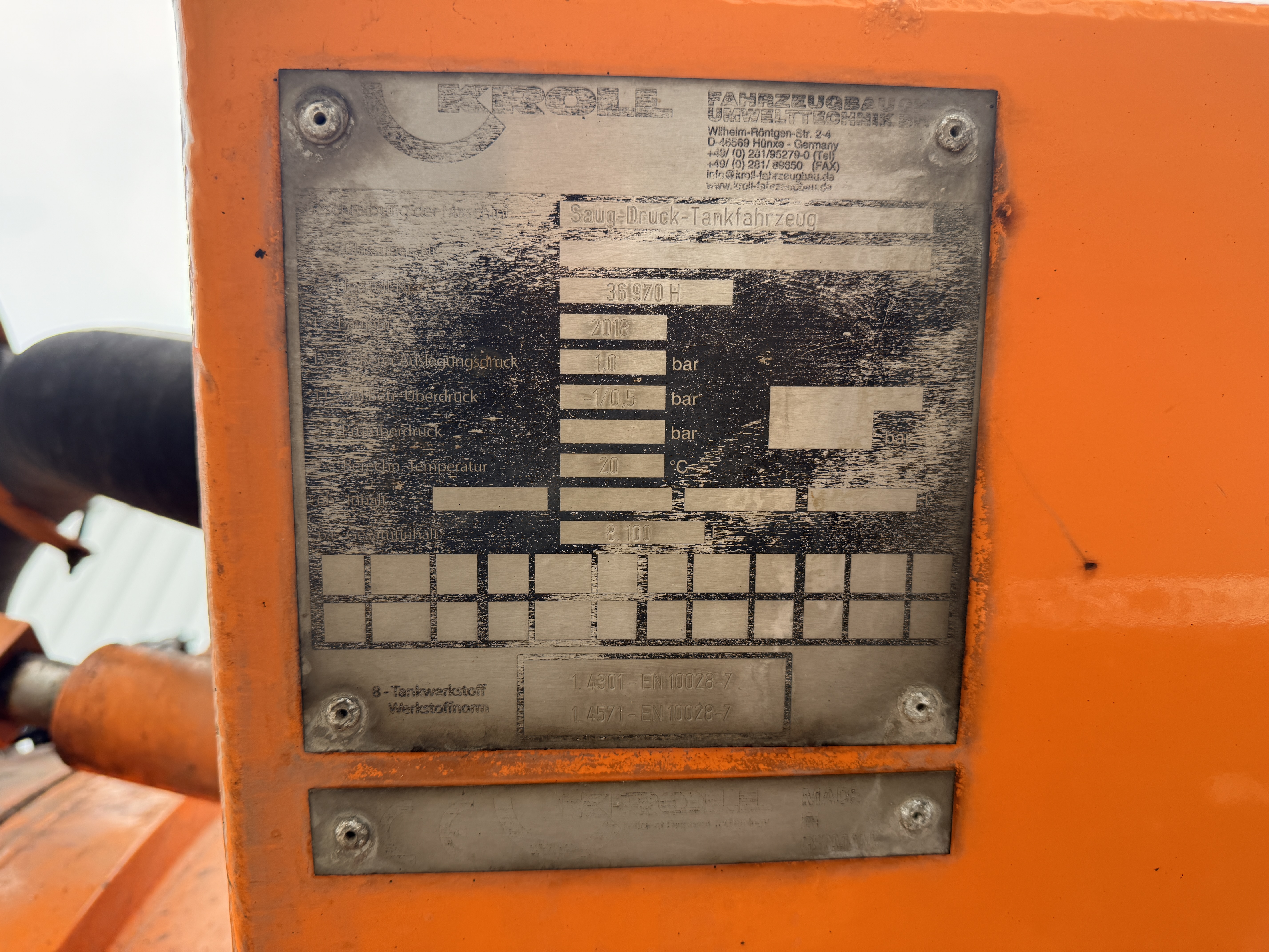 5 mm. rustfri stål tank, stempeltank med 3 sæt dorne, 1500/6500 L til 6000/2000 L. Vakuum pumpe lamel fab. CVS type Vacustar W1600, 26.133 L pr. min ved 60% vakuum. Vejbrøndtårn med hydr. udskud, 270* Transporttromle med 50 m. 3" slange. Højtryk Uraca stempelpumpe type P3-10. kapisitet 127 L pr. min ved max 160 bar. variabel styring. Hydr. spulerulle med 50 M. 3/4 + 60 m. 1/2. anlæg med radio-styring.