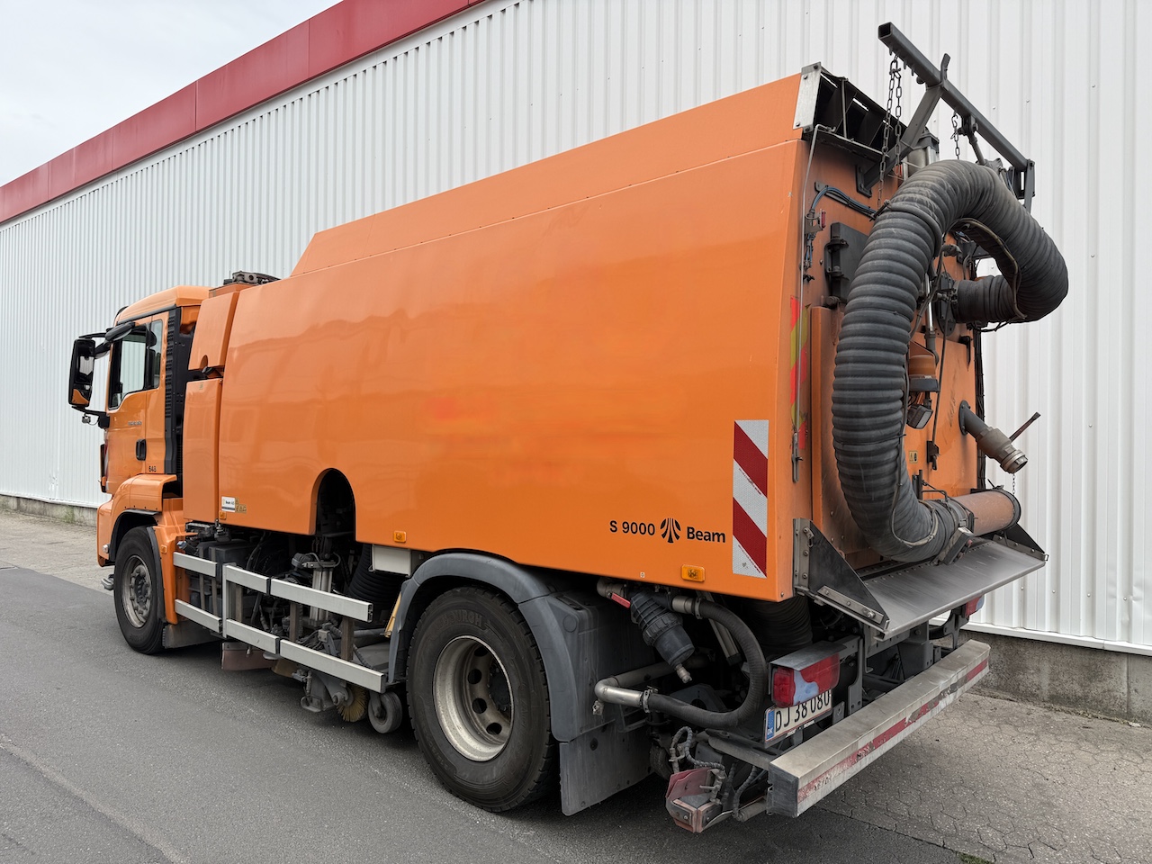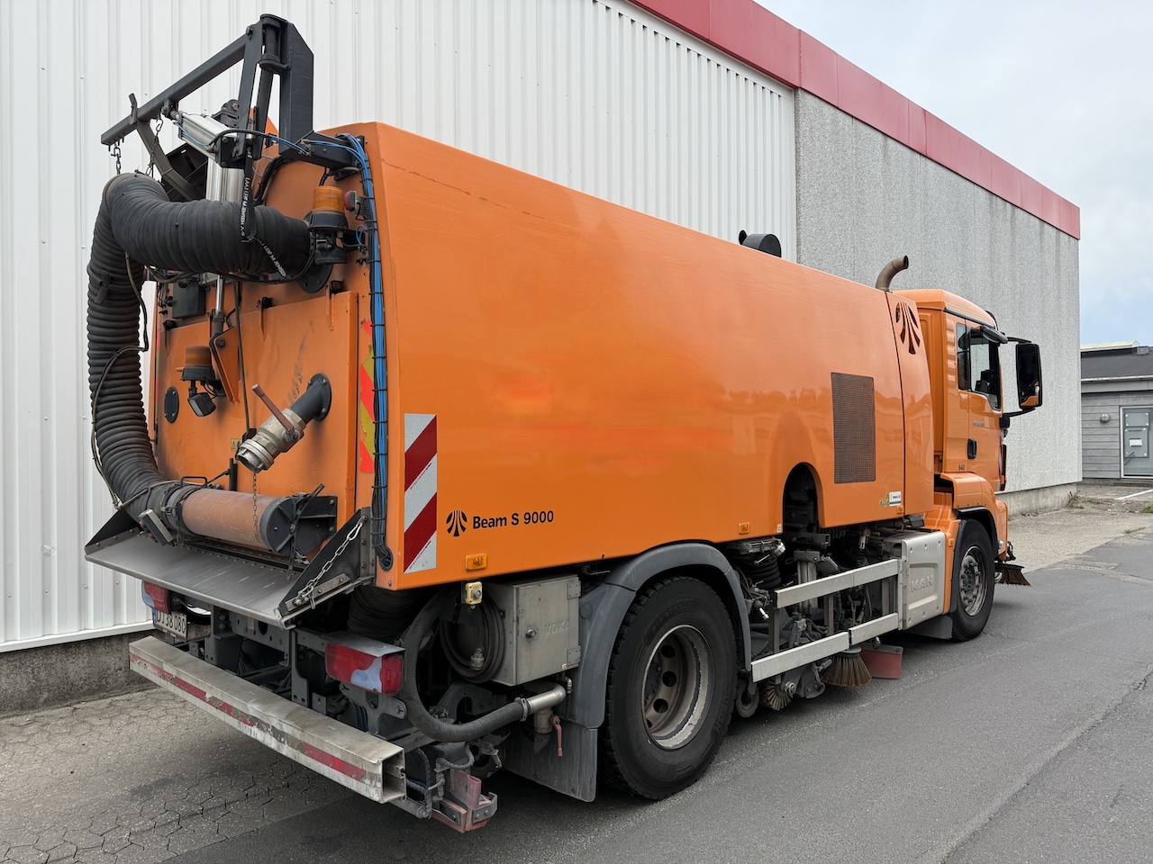 Beam S9000 fejemaskine, 200 bar spule anlæg både for og bag. Driftstimer på fejeanlæg 3495 timer.