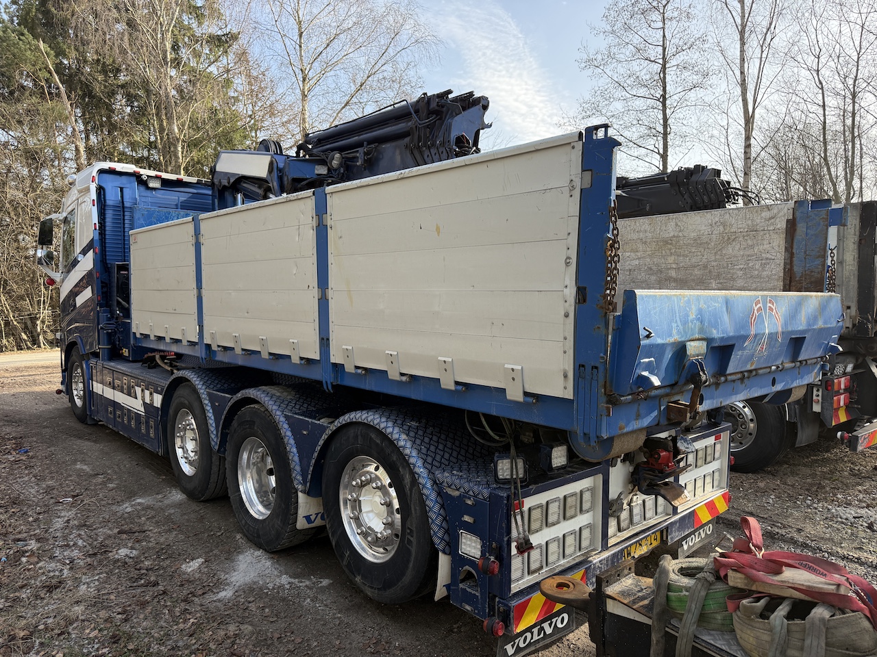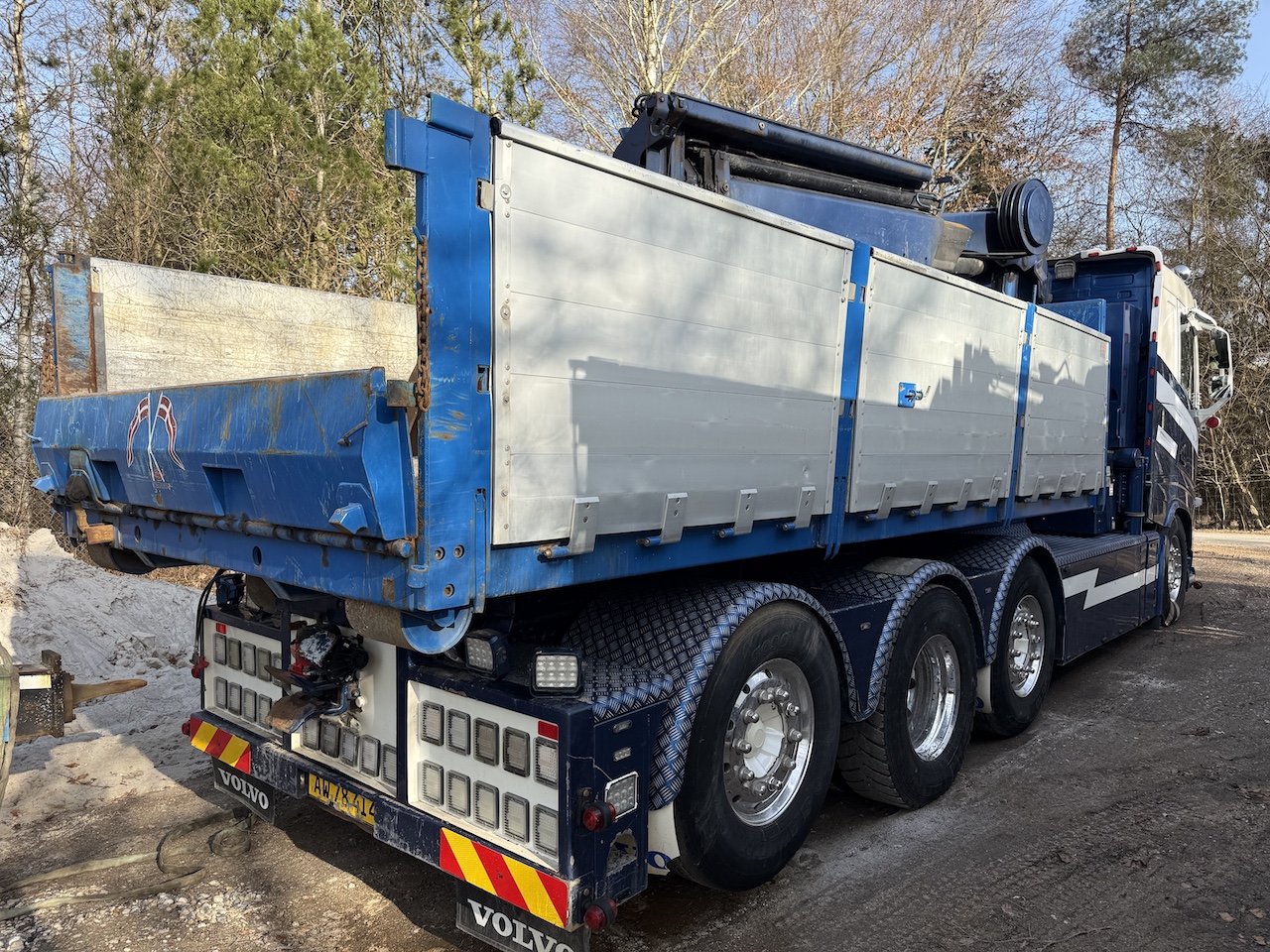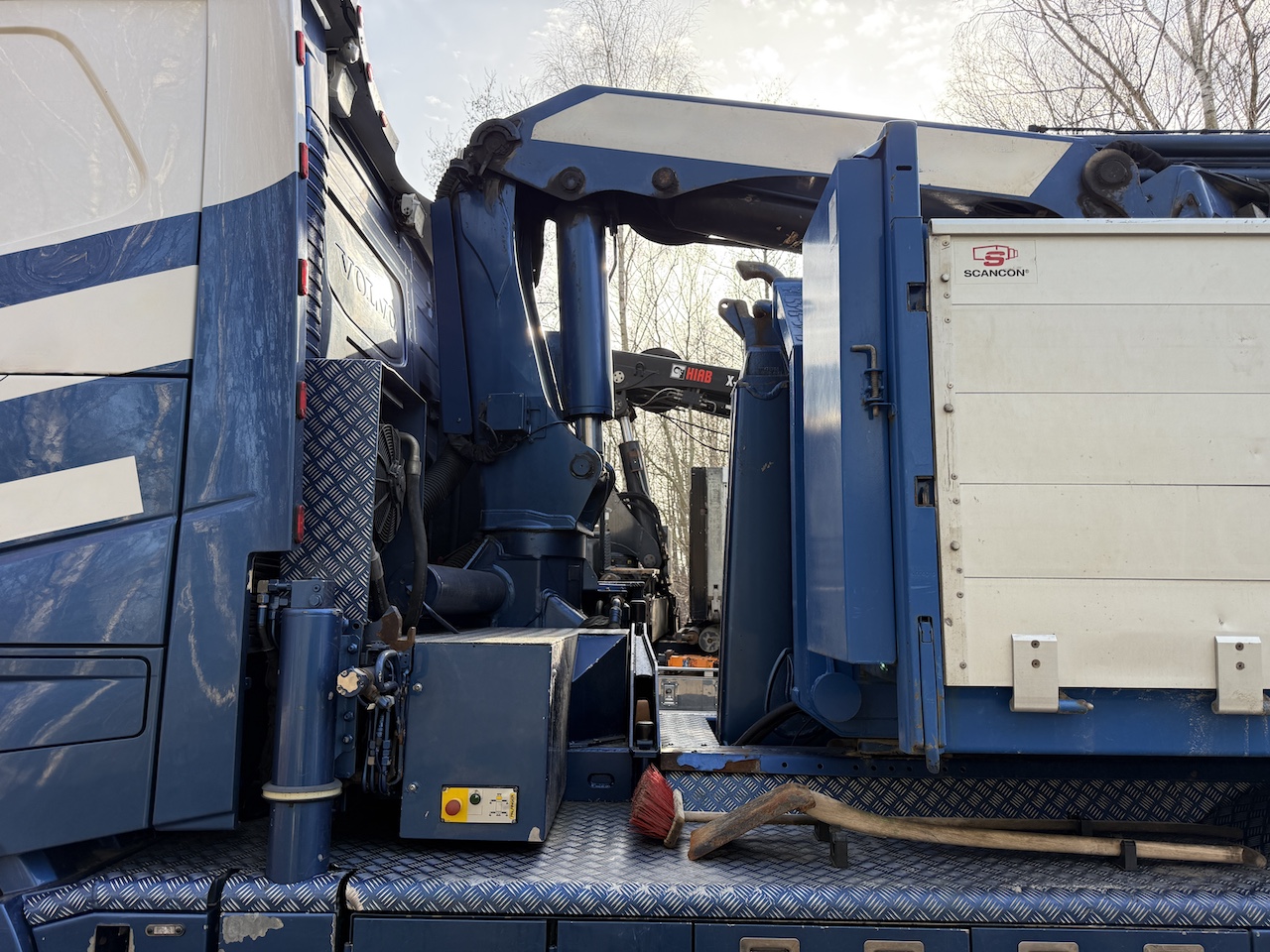 Hema grab med aftagelig sider ca. 3 år gammel, komplet metallak også på kran samt metallisering afundervogn og opbygning, custom made opbygning med mange finesser på opbygning og i førerhuset, Hejselad med Hardox bund og aut. luftbagsmæk. Hydraulisk udskudskofanger. Ny kobling i november 2025, slideklodser er skiftet i kran. Har lidt småskeder med er i god brugbar stand.